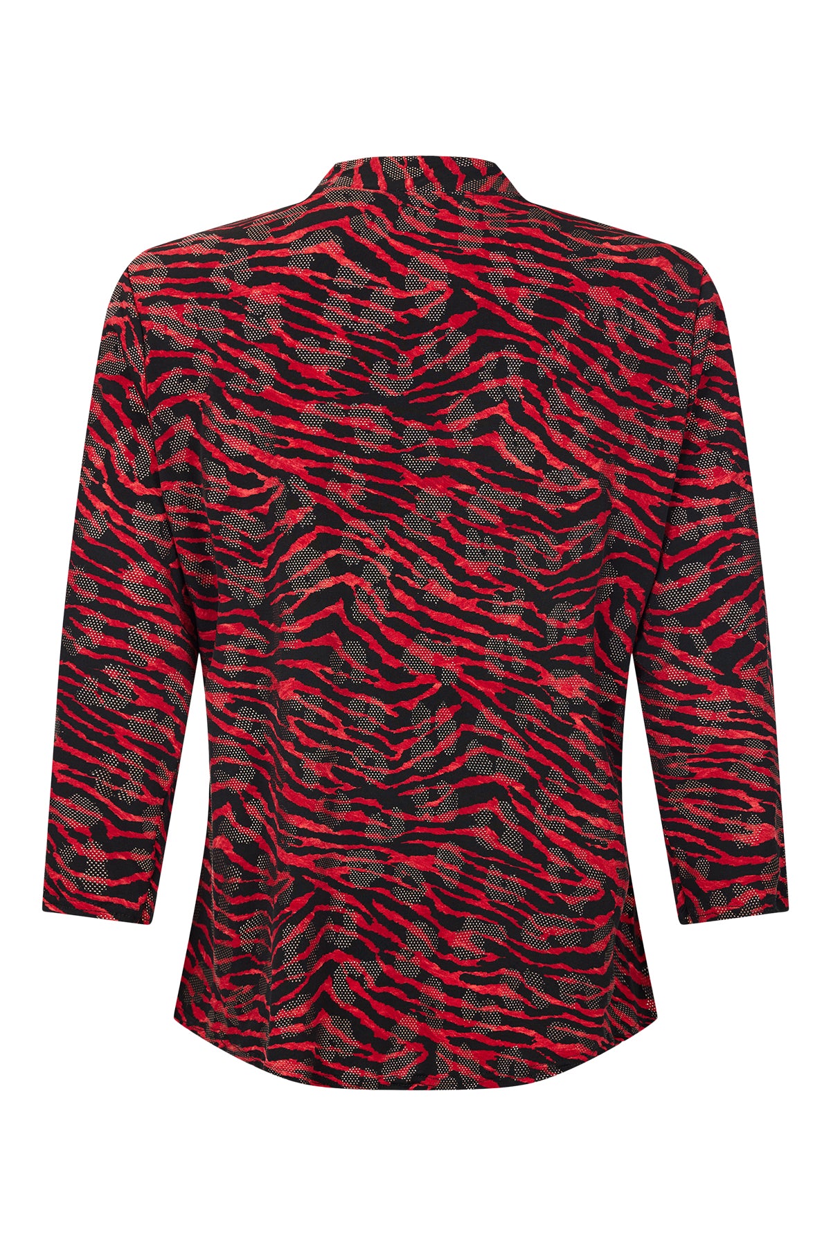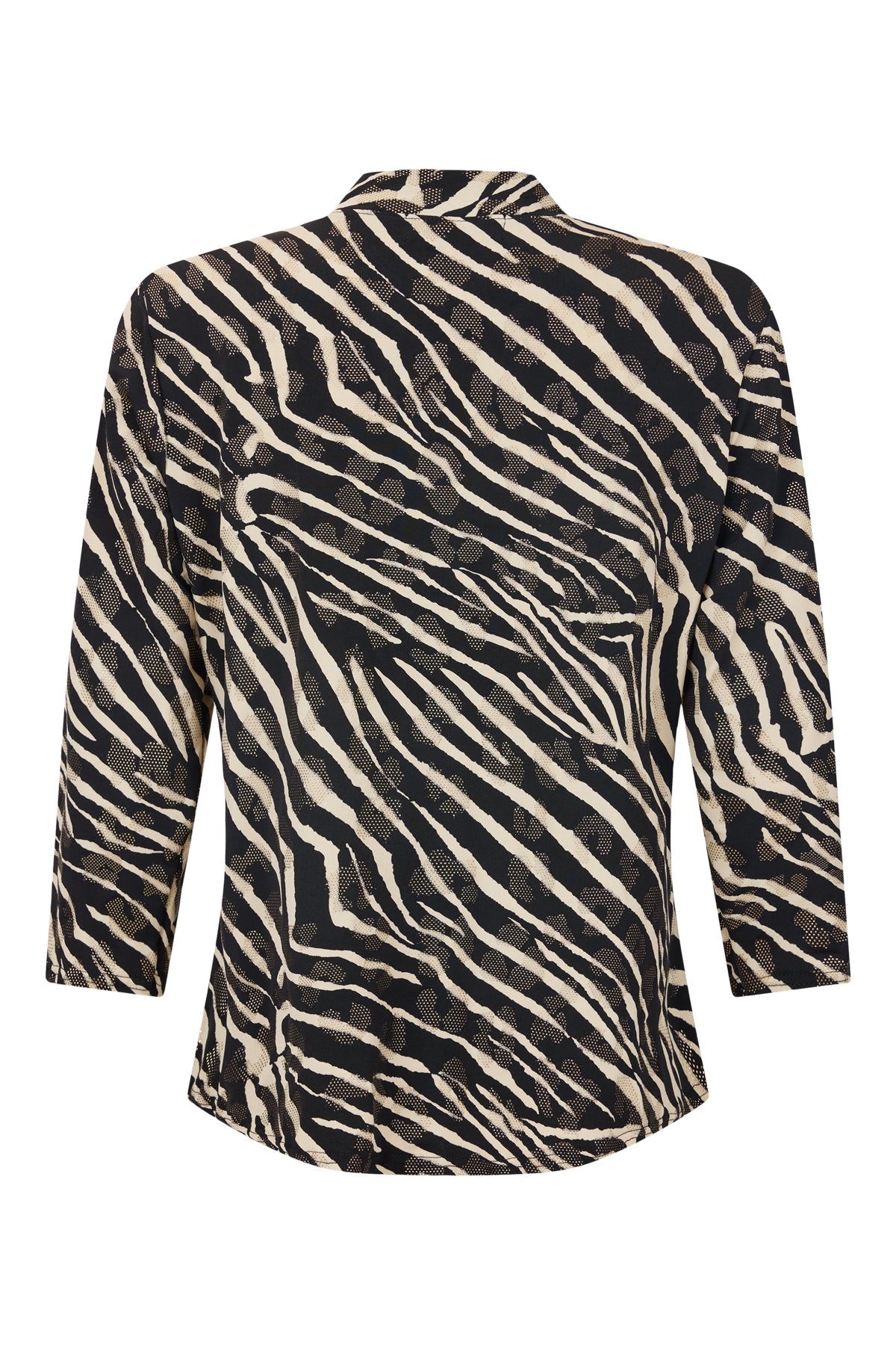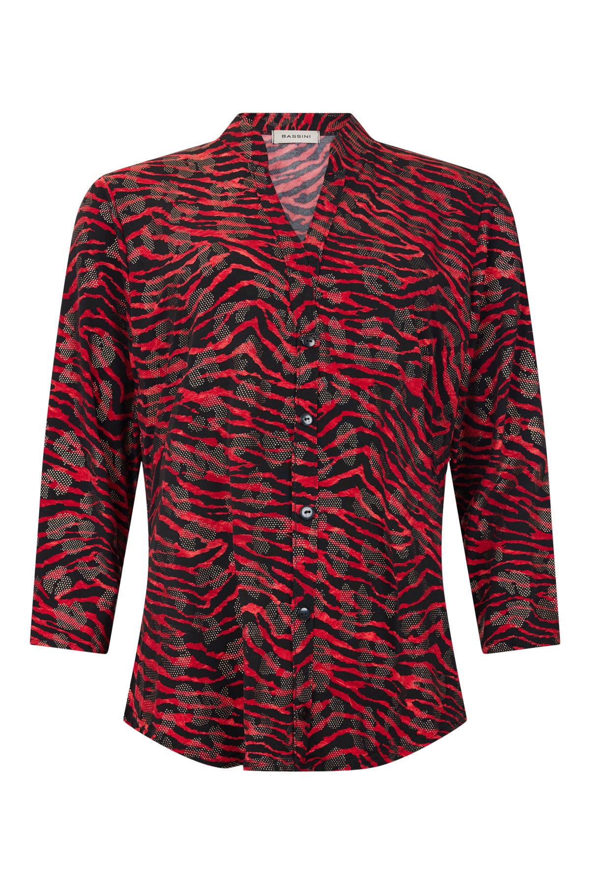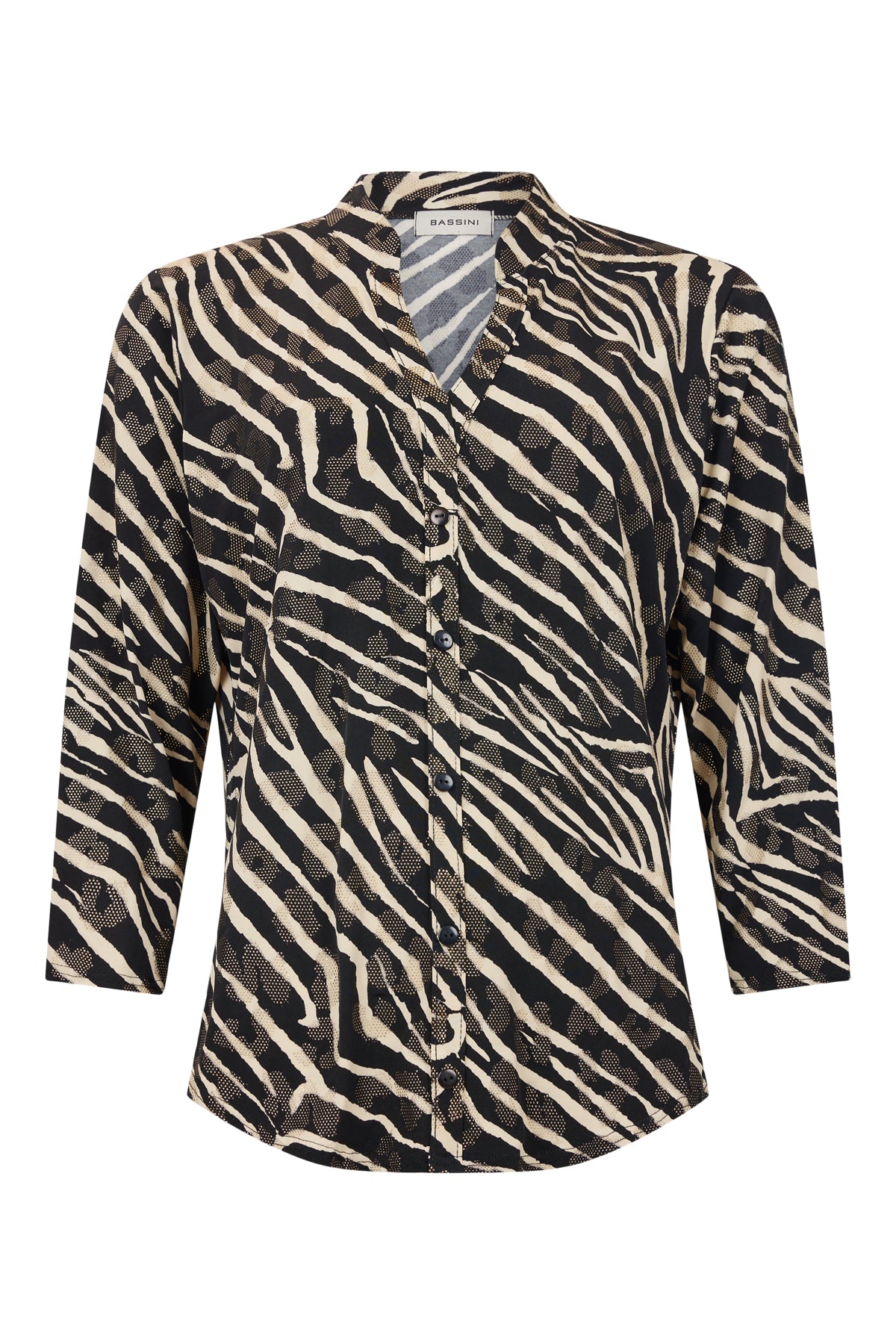 Bassini - Caitlyn flott og sparileg blússa með dýramynstri. Kragi og V-hálsmál, hneppt alla leið niður, kvartermar, rúnuð að neðan. Létt og þægileg og hægt að vera í undir jakka eða peysu eða bara ein og sér. Flott bæði sem hversdags og betri flík og passar vel með hverju sem er.