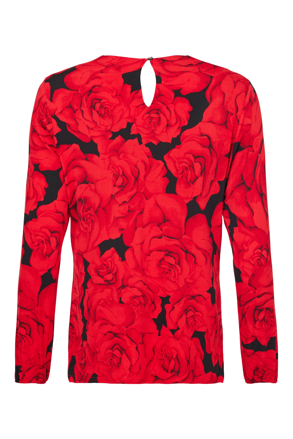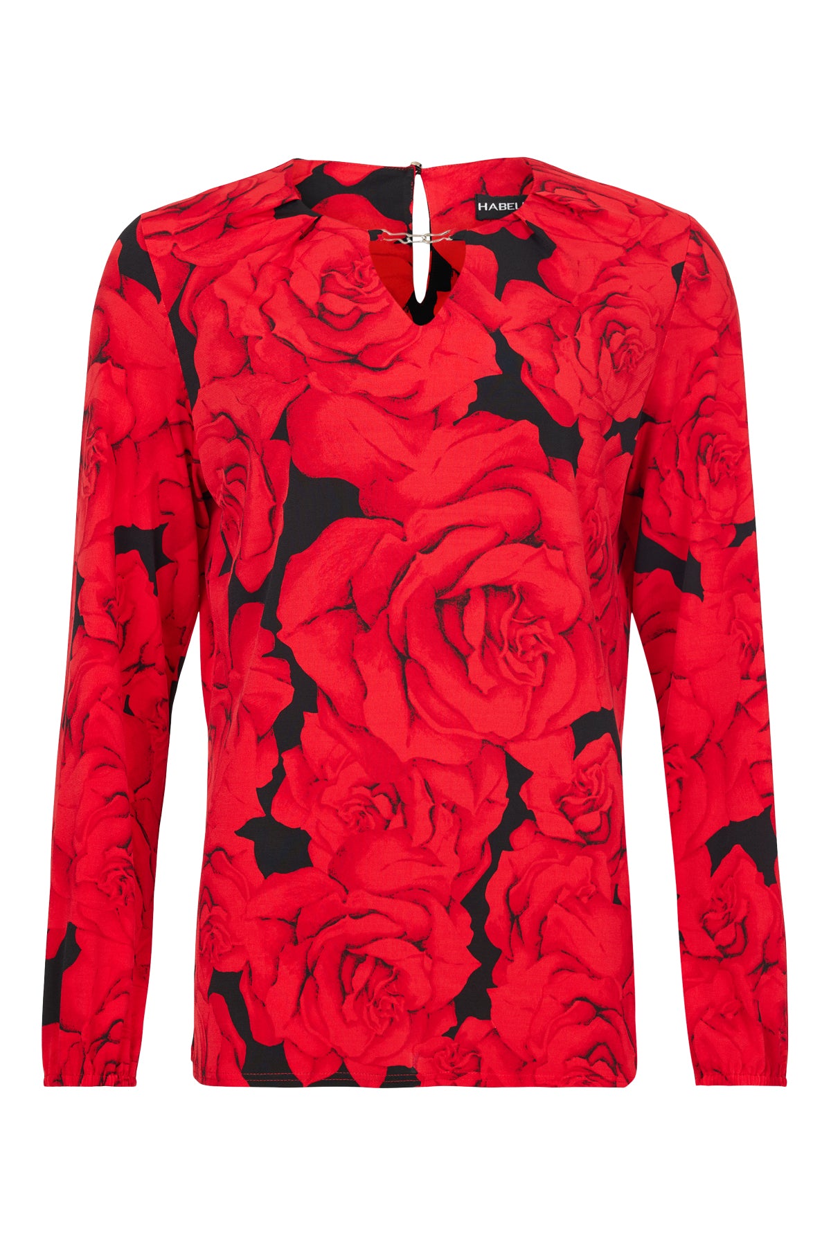 Habella - Briella falleg og sparileg blússa með blómamynstri. Langar ermar með teygju, rúnað hálsmál sem endar í litlu V með keðju, keyhole op að afan með tölu. Létt og sparileg og hægt að nota við bæði buxur og pils.