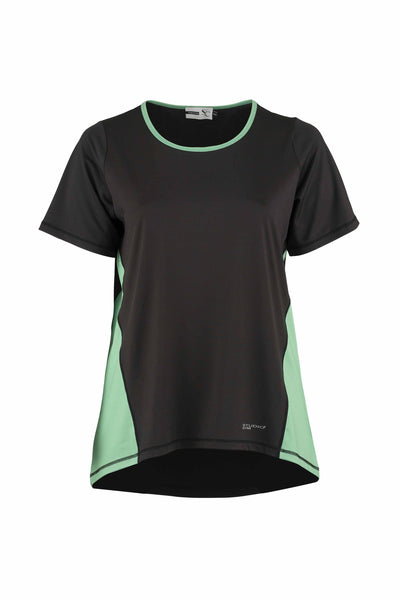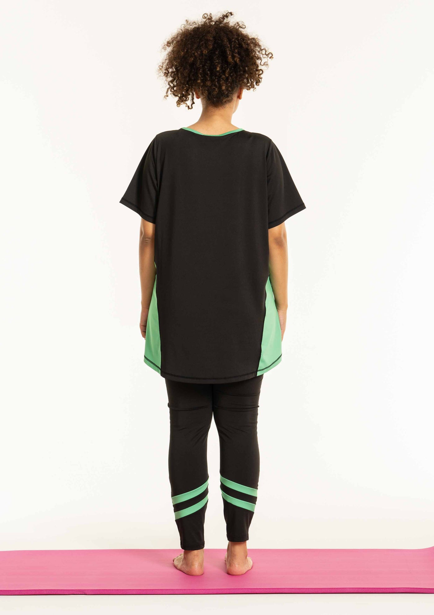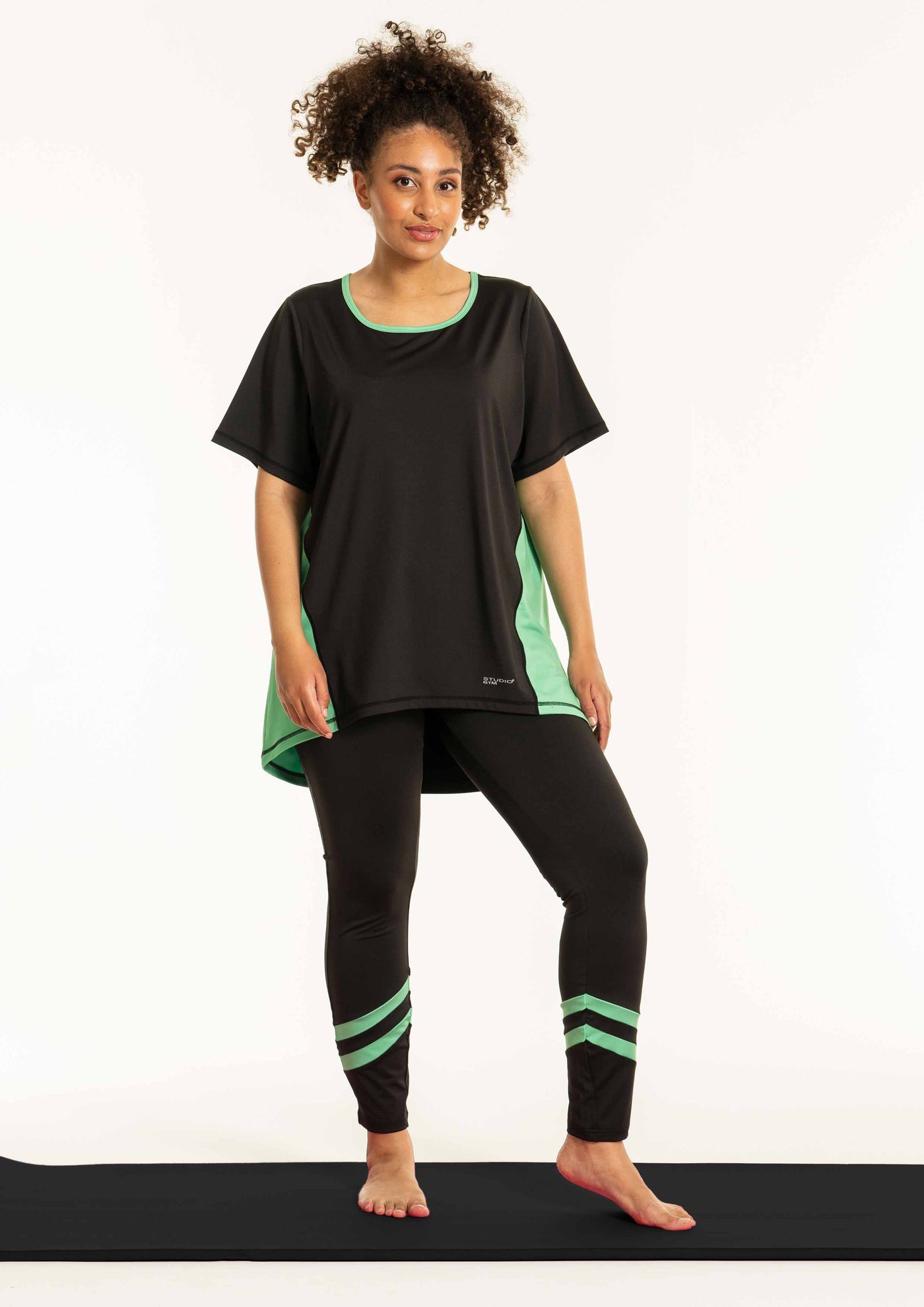 Studio GYM - Fitness, flottur og þægilegur stuttermabolur með rúnað hálsmál og skemmtilegu grænu ívafi. Grænt hálsmál ásamt smá grænu í hliðum. Bolurinn er aðeins síðari að aftan