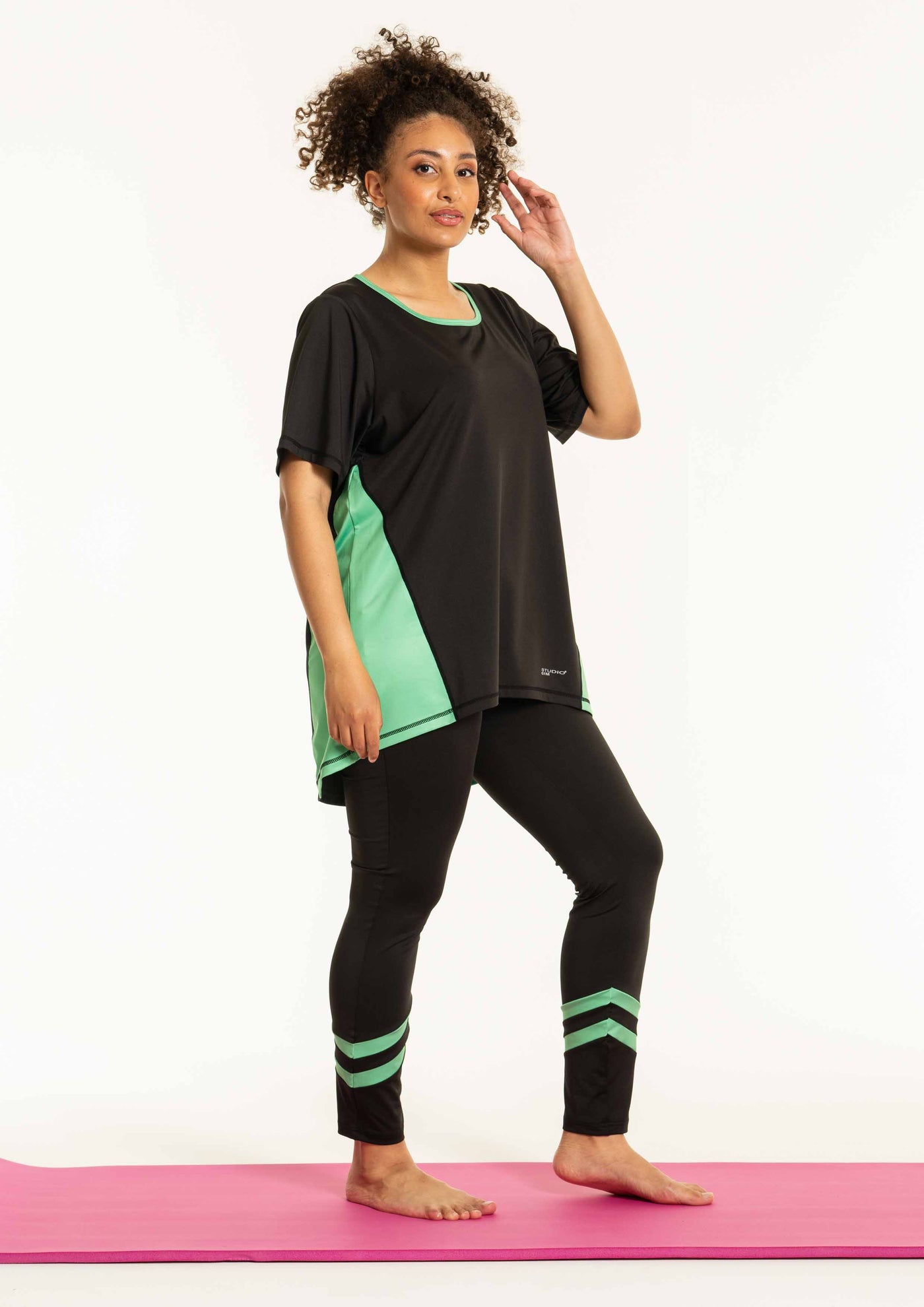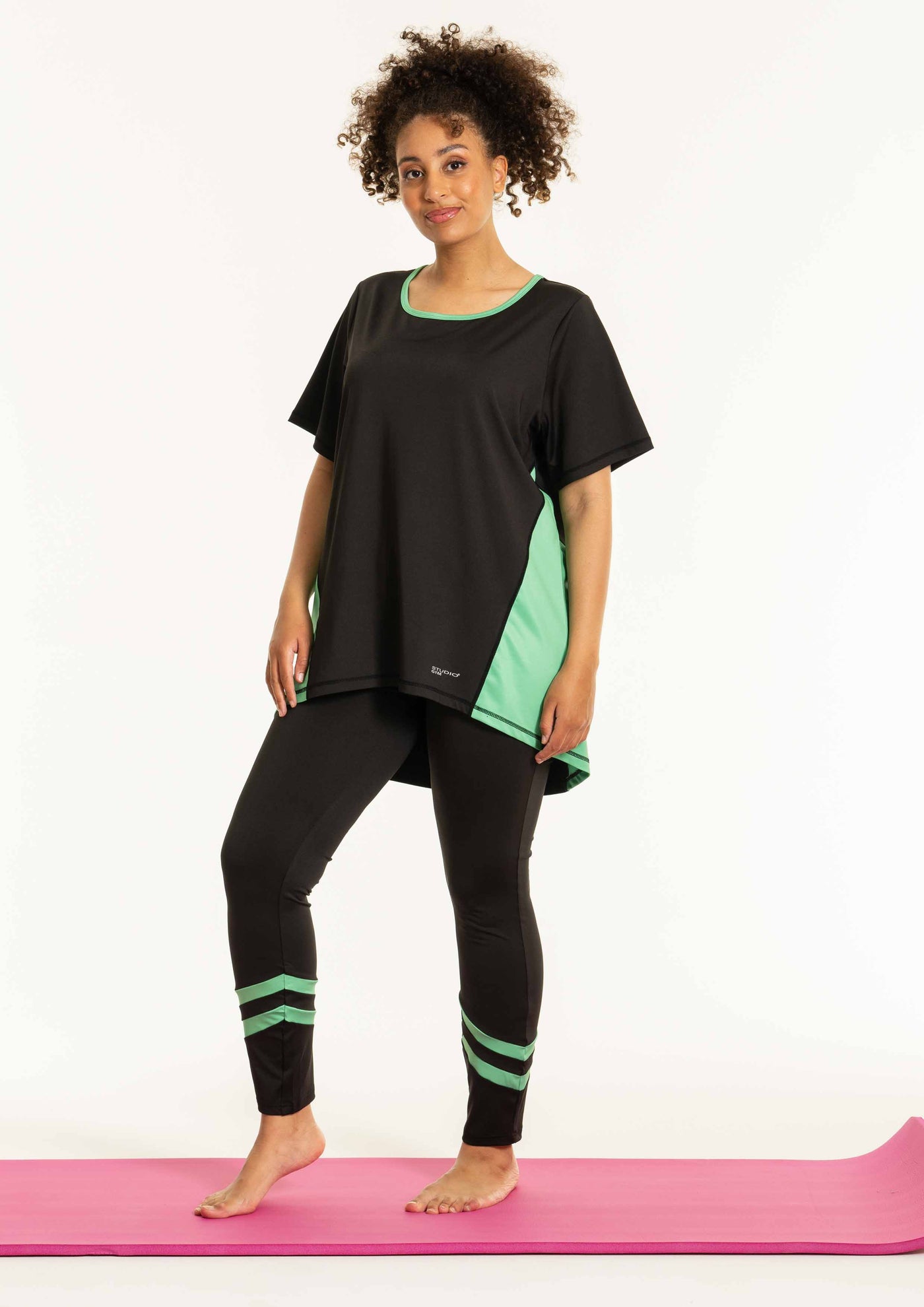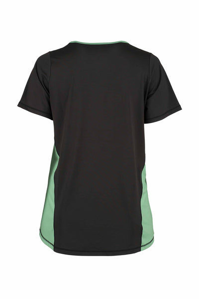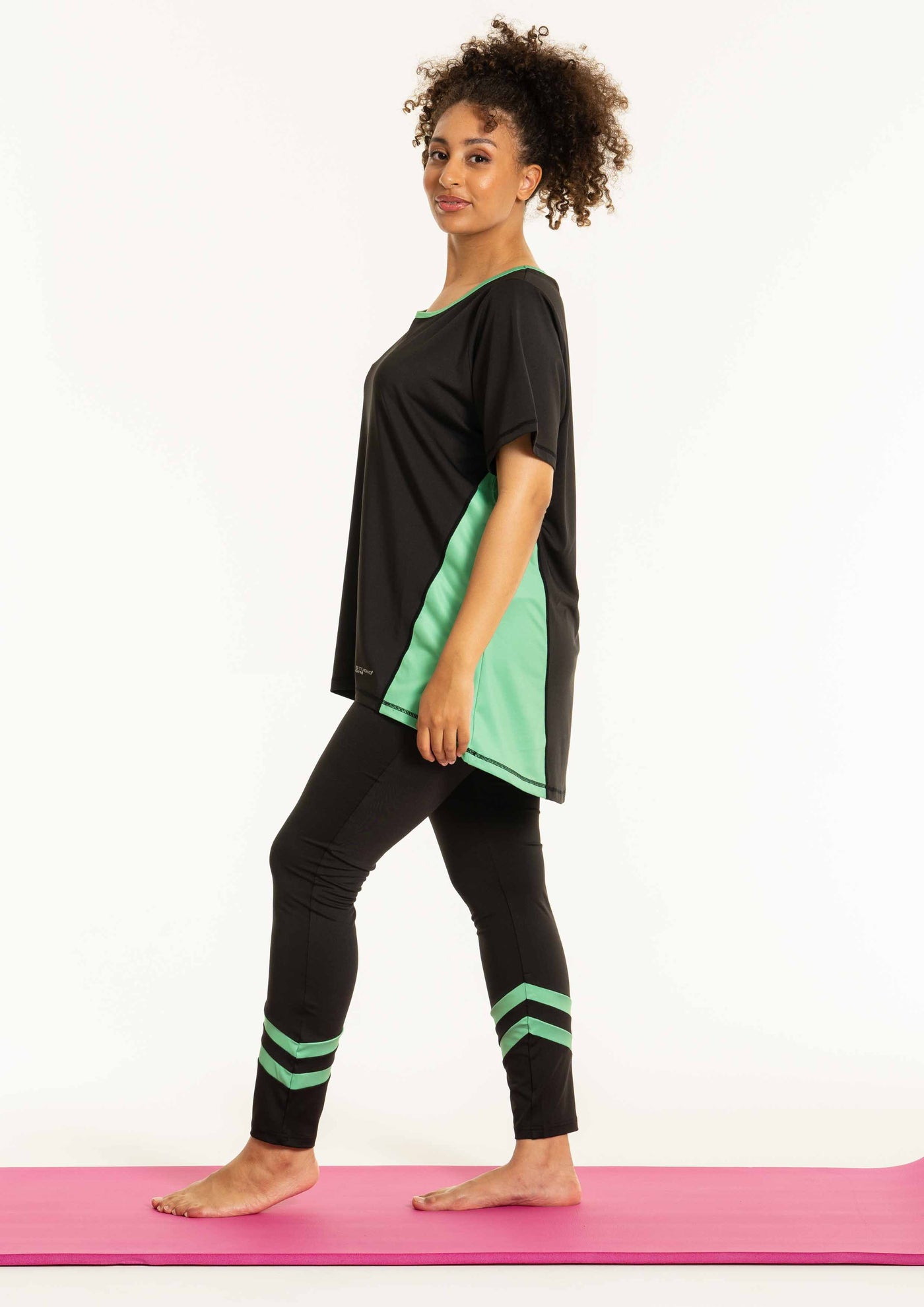 Studio GYM - Fitness, flottur og þægilegur stuttermabolur með rúnað hálsmál og skemmtilegu grænu ívafi. Grænt hálsmál ásamt smá grænu í hliðum. Bolurinn er aðeins síðari að aftan