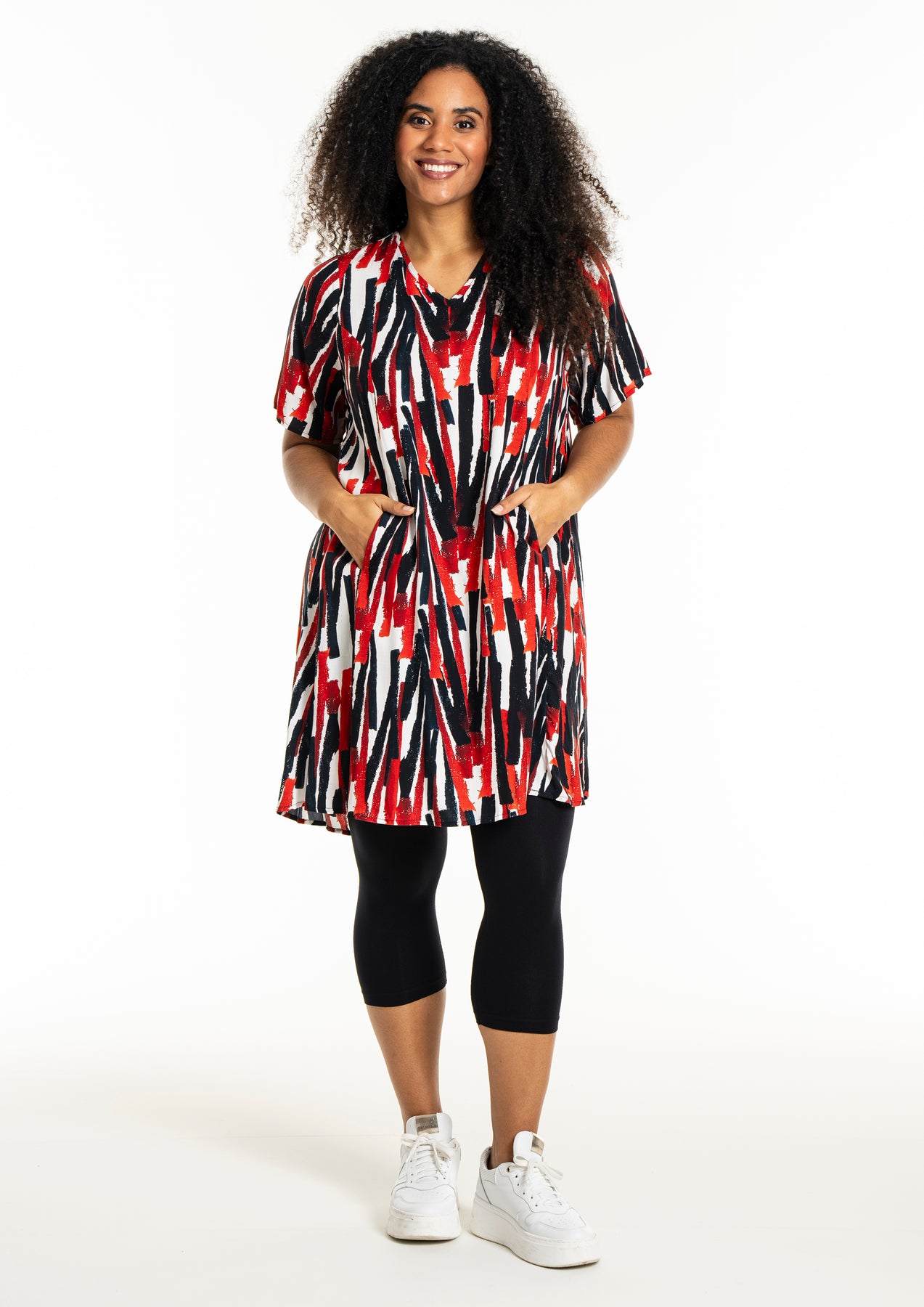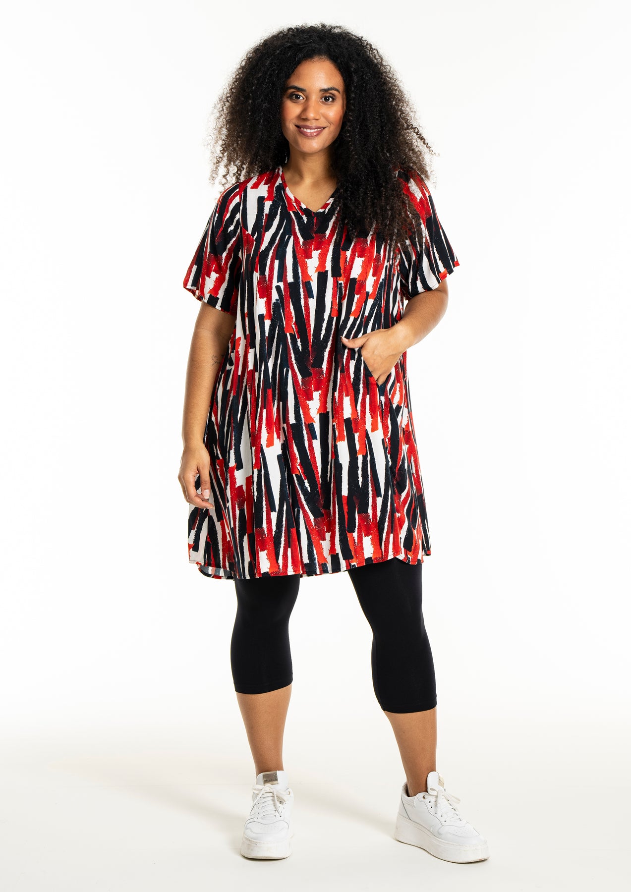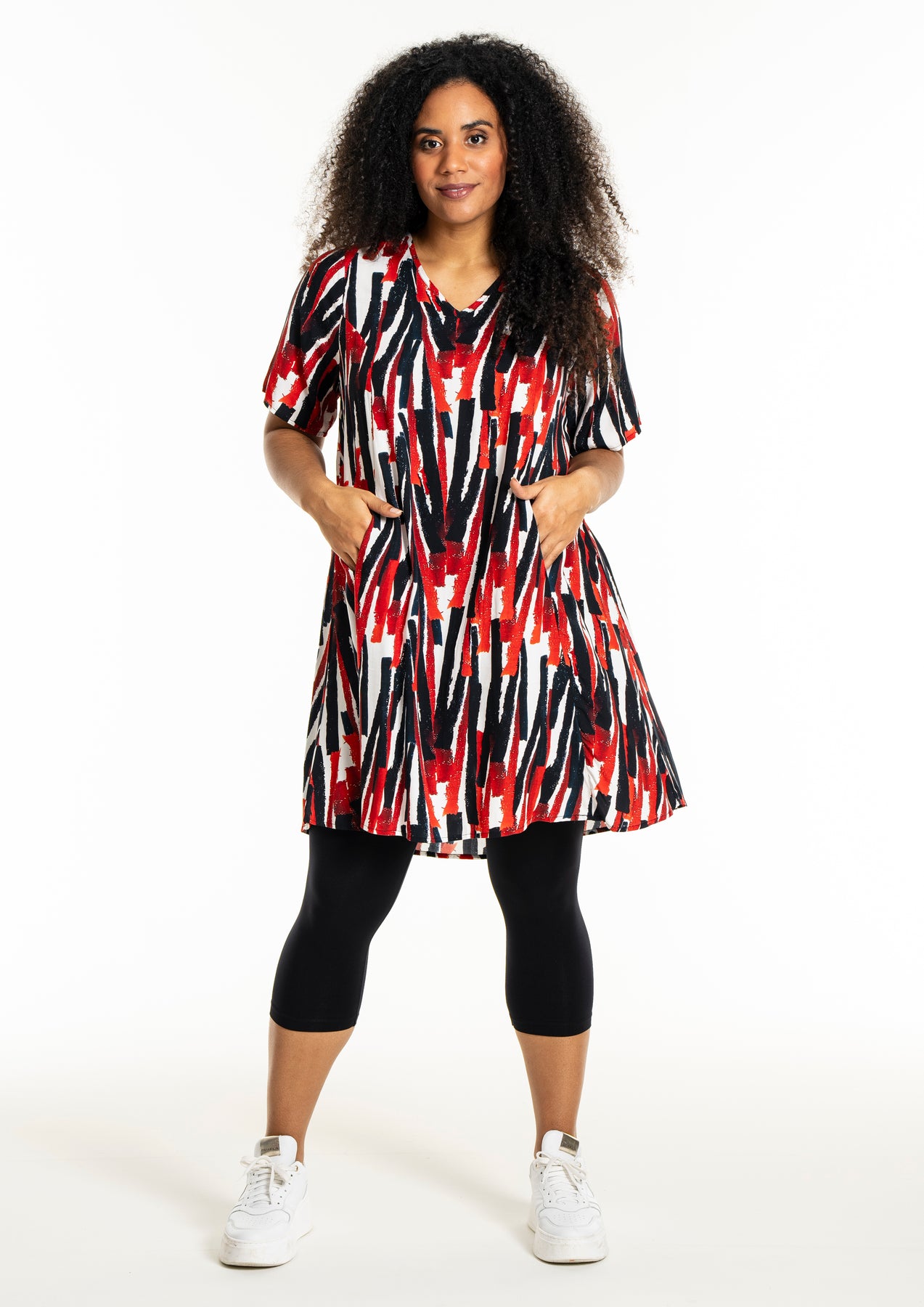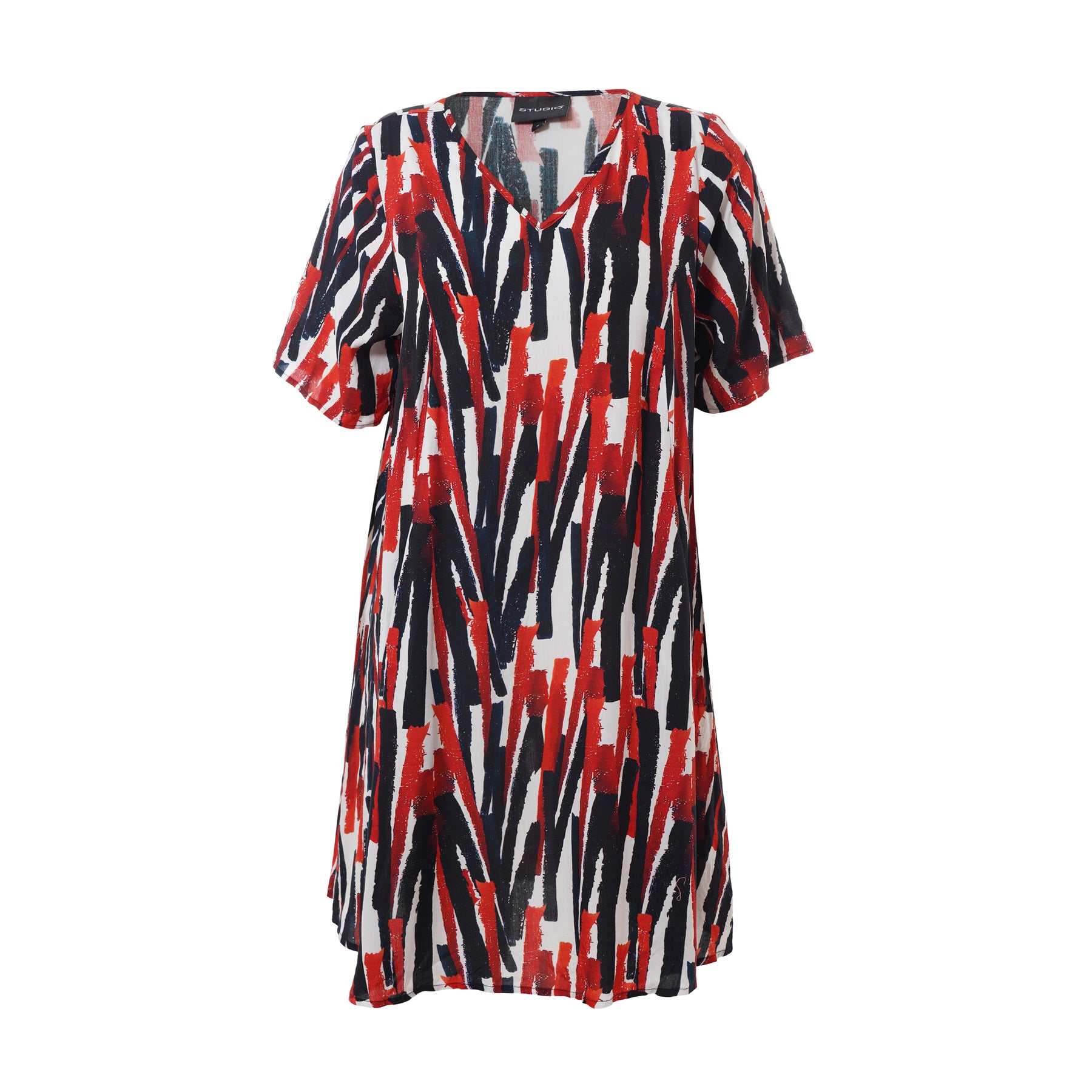 Studio - Birgitte léttur og þægilegur kjóll í 100% viskós efni, flott mynstur í efni. V-hálsmál, stuttar ermar, góðir vasar, A-snið. Hvítur í grunninn með svörtu og rauðu mynstri.
