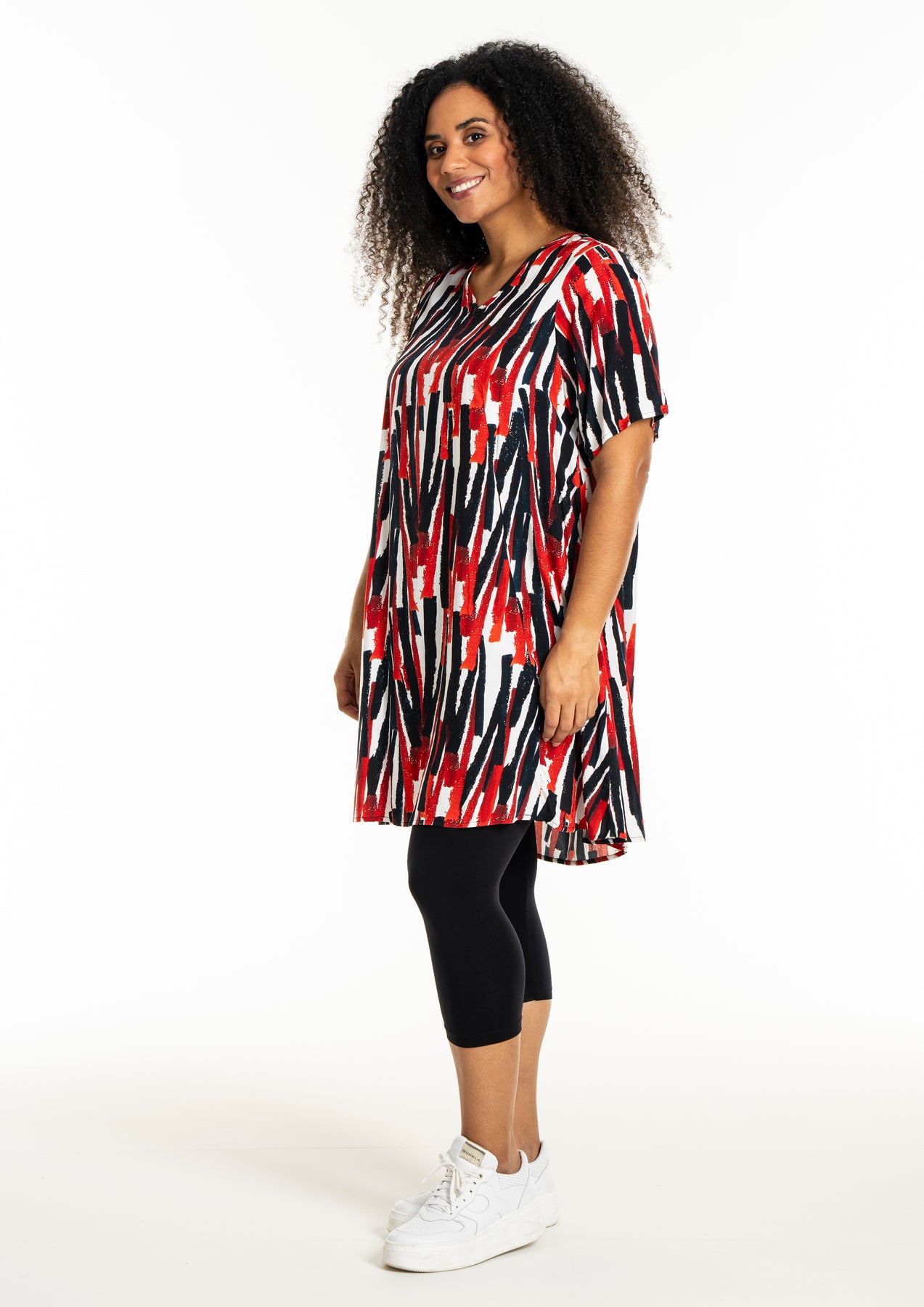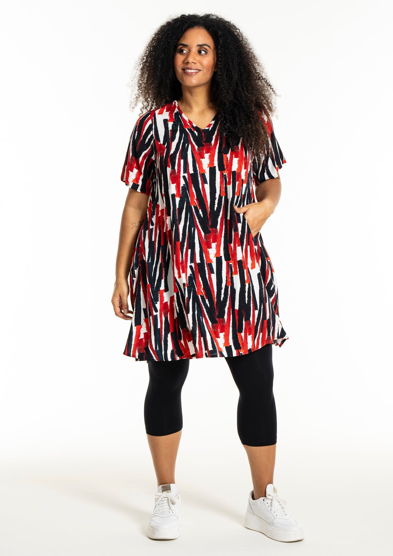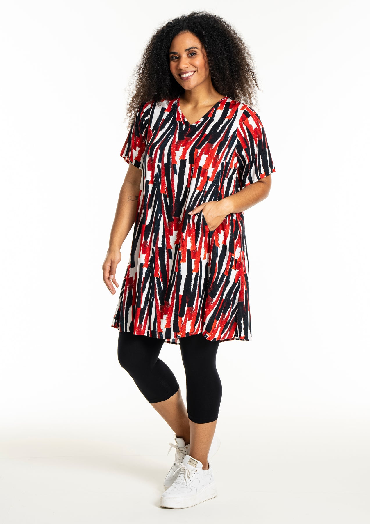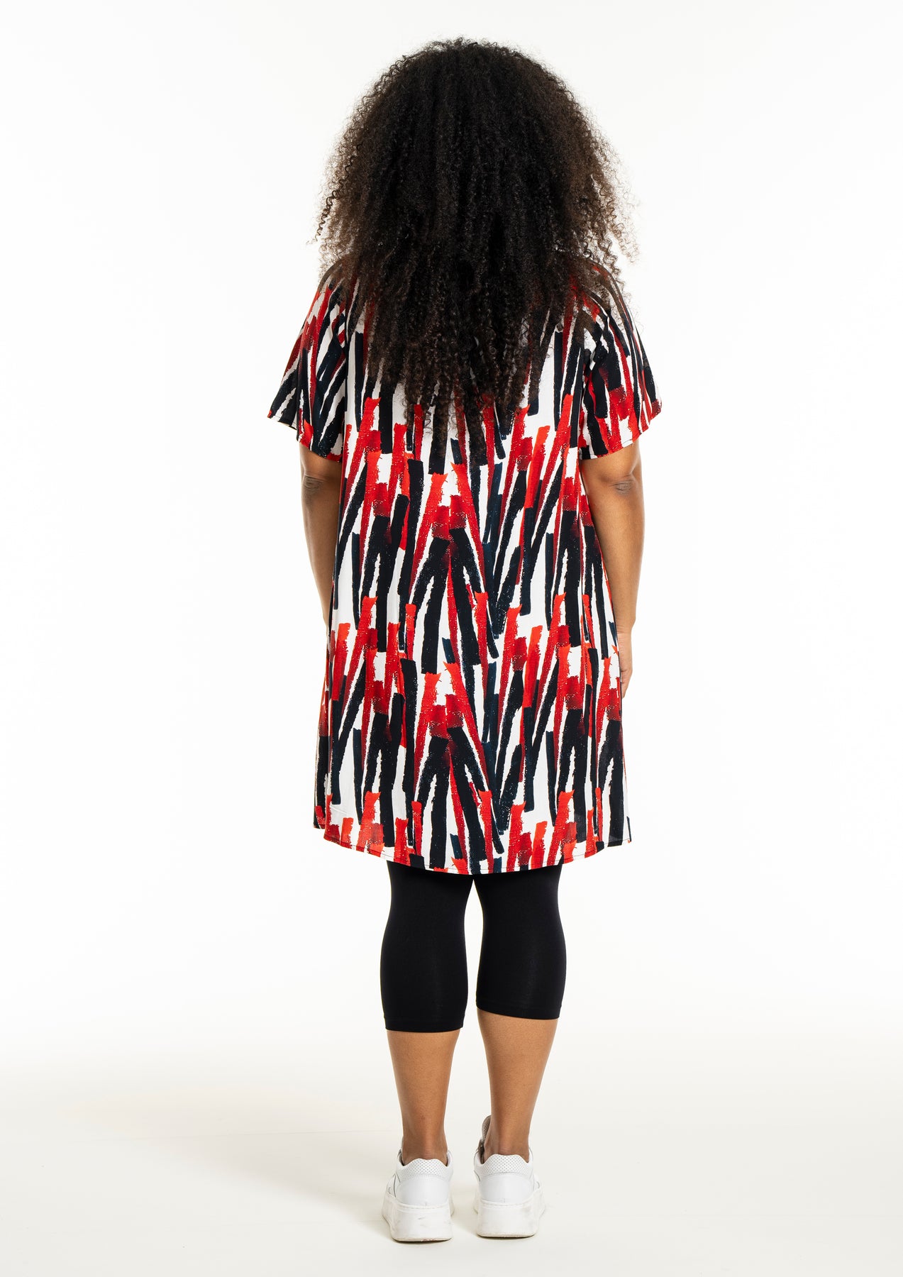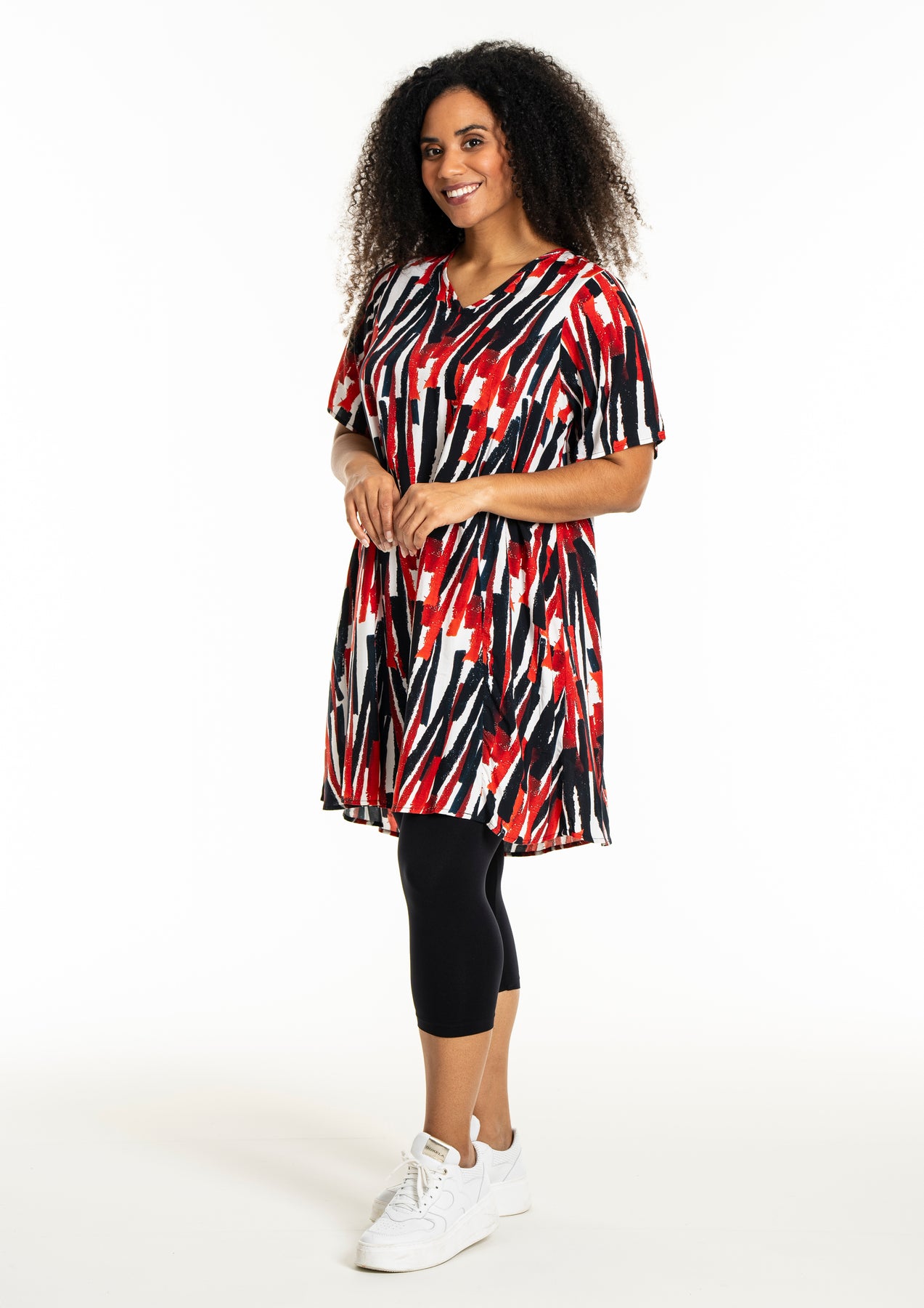 Studio - Birgitte léttur og þægilegur kjóll í 100% viskós efni, flott mynstur í efni. V-hálsmál, stuttar ermar, góðir vasar, A-snið. Hvítur í grunninn með svörtu og rauðu mynstri.