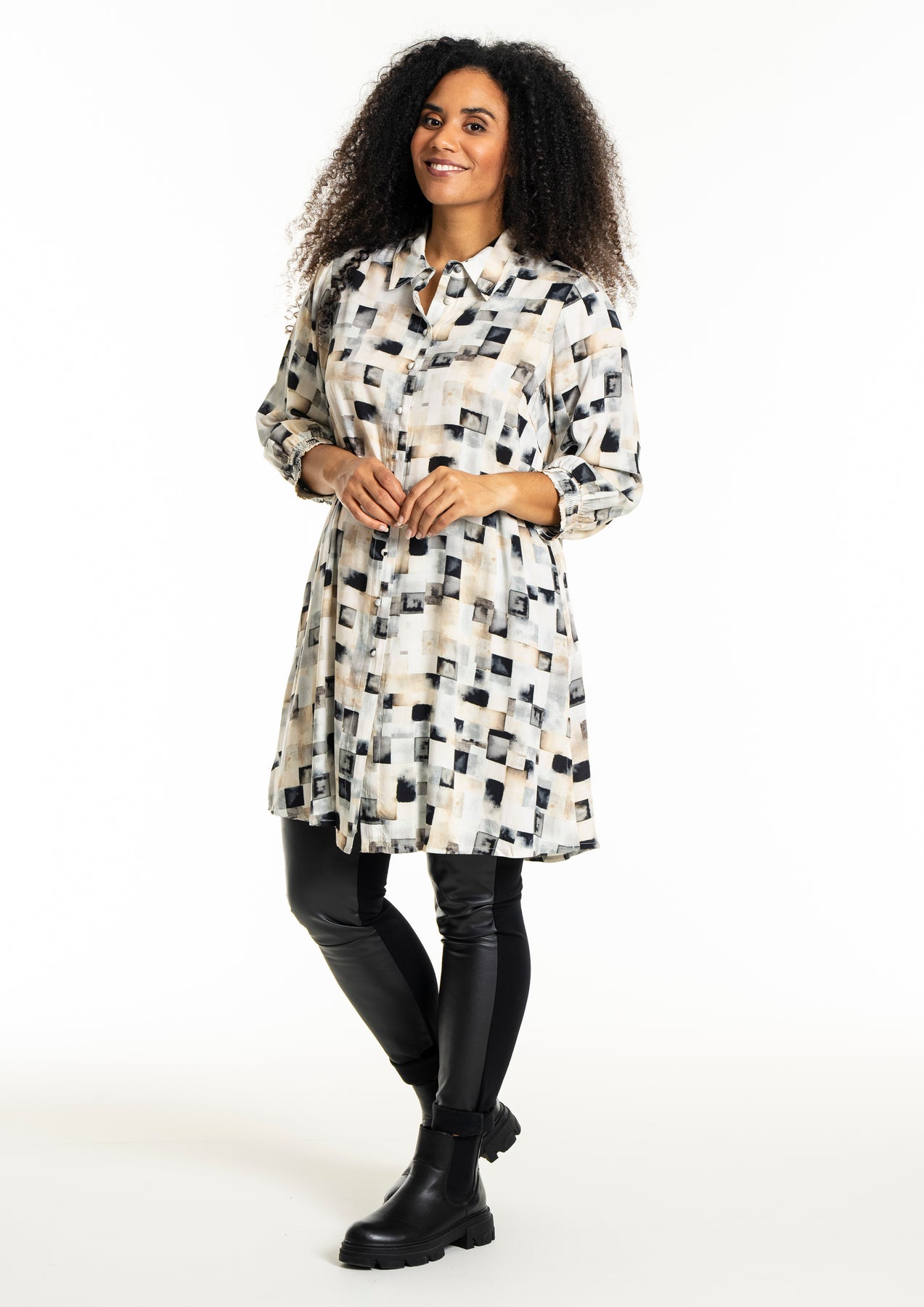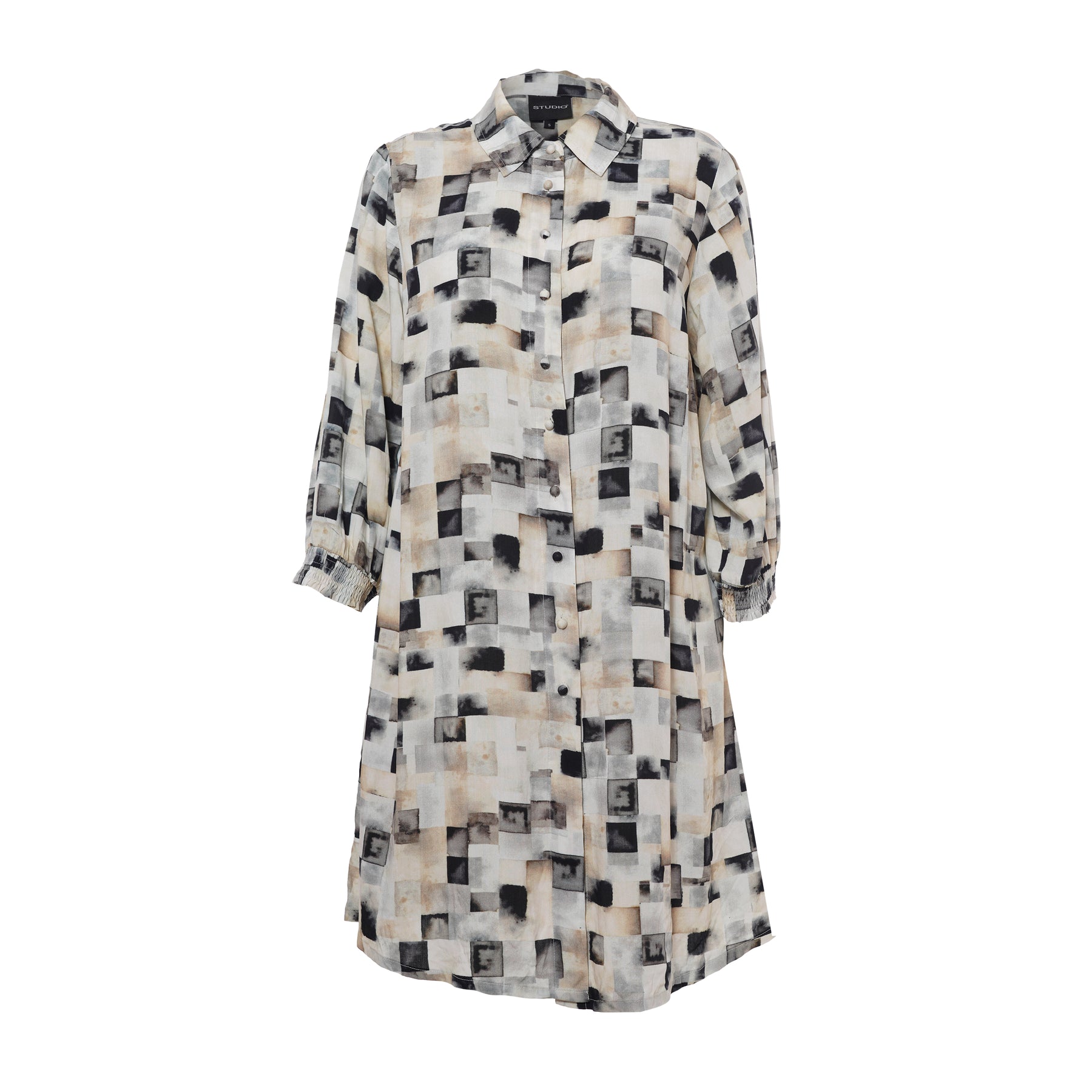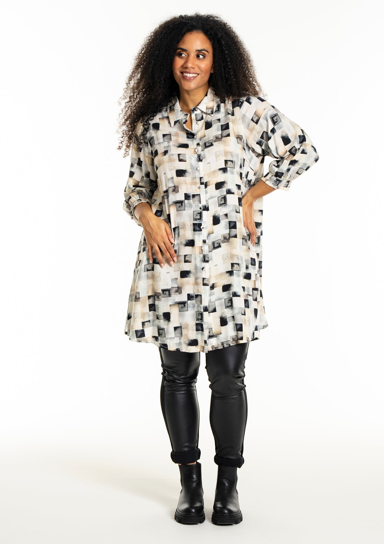 Studio - Emilie síð skyrta með flottu mynstri. Hneppt alla leið niður, skyrtukragi, kvartermar með teygju. Hægt að nota opna yfir buxur og topp eða lokaða eins og kjól.