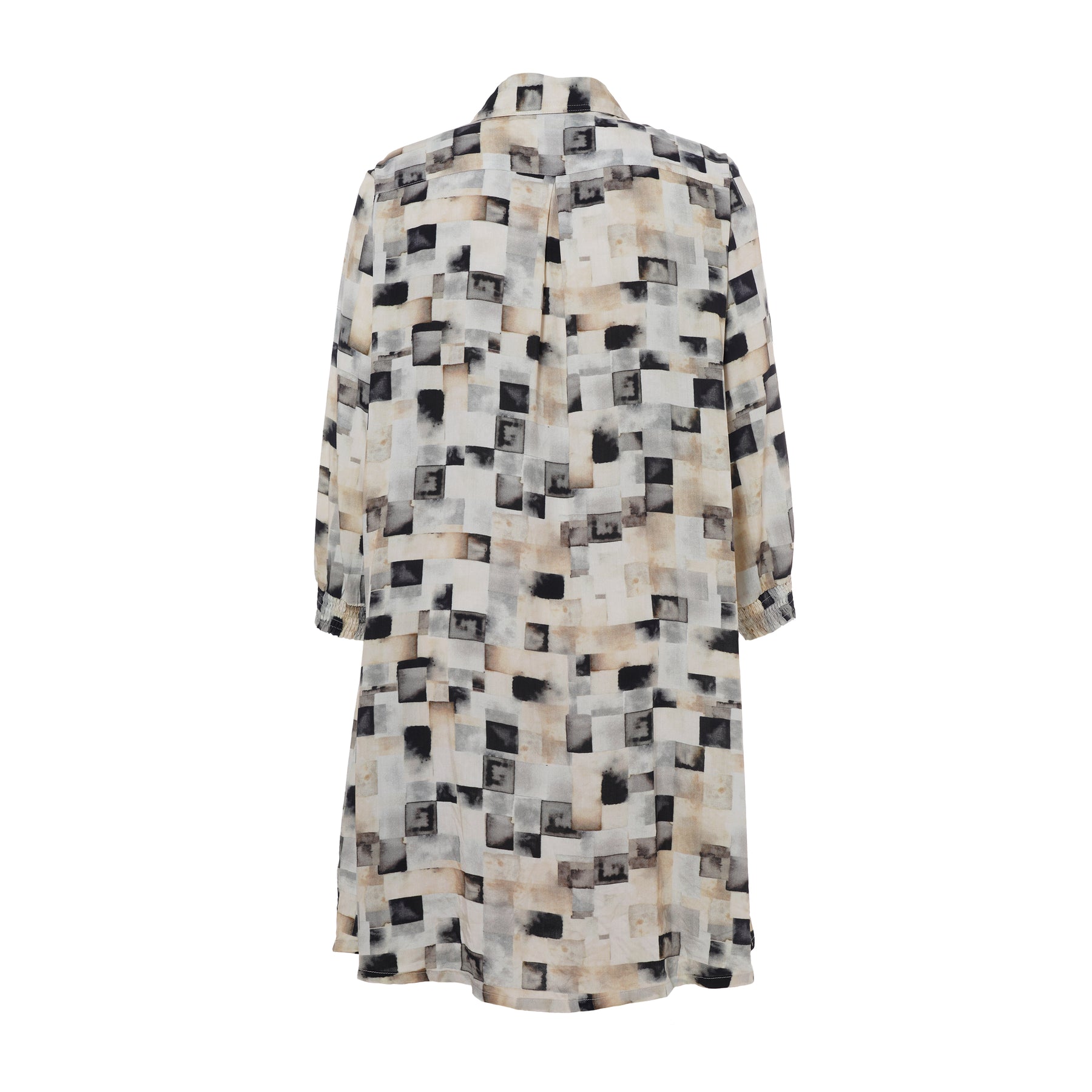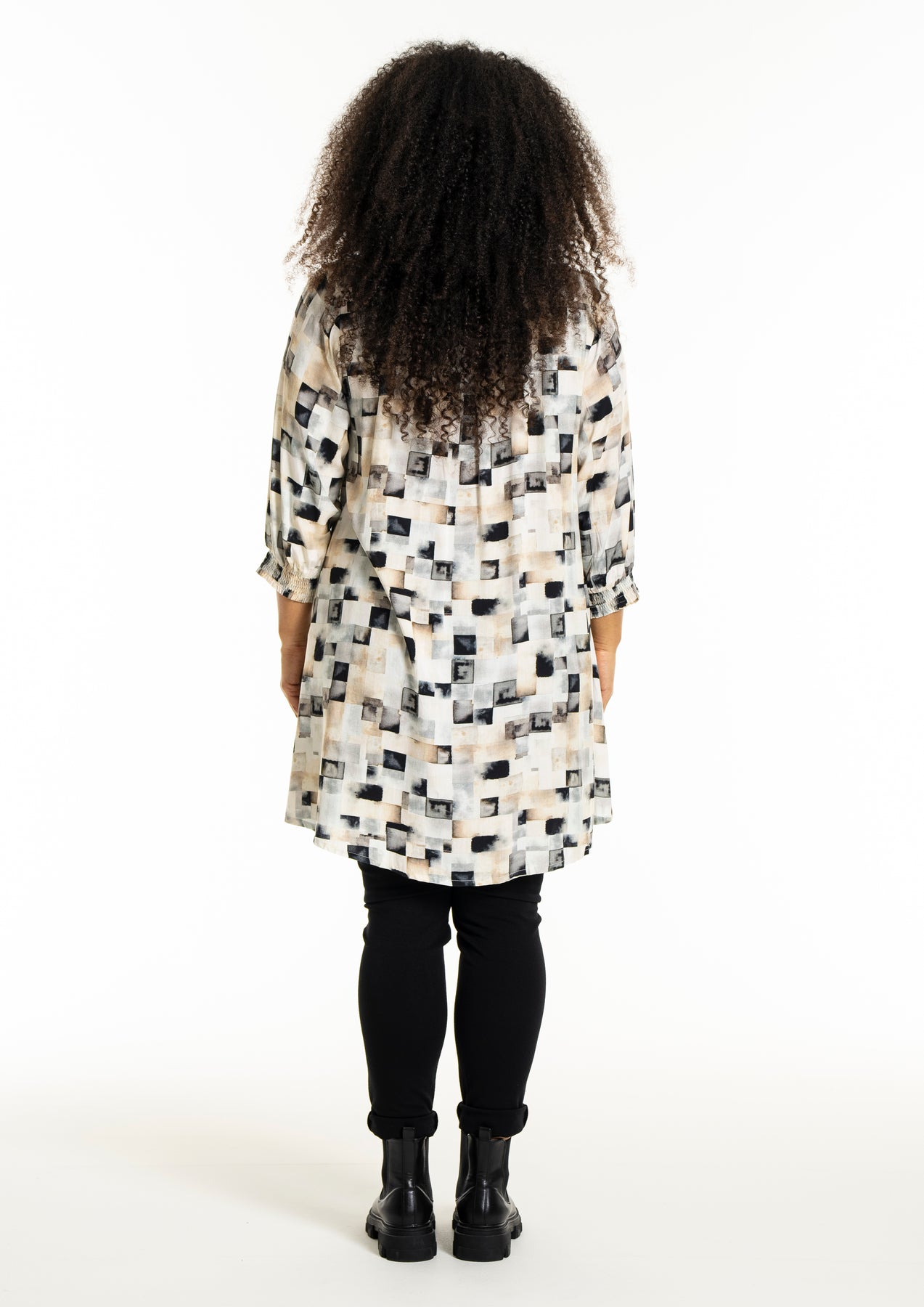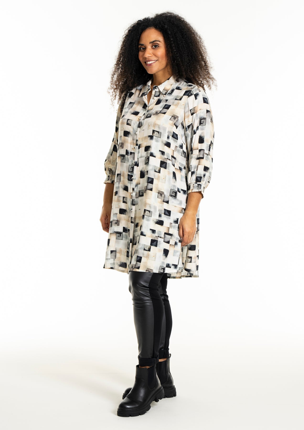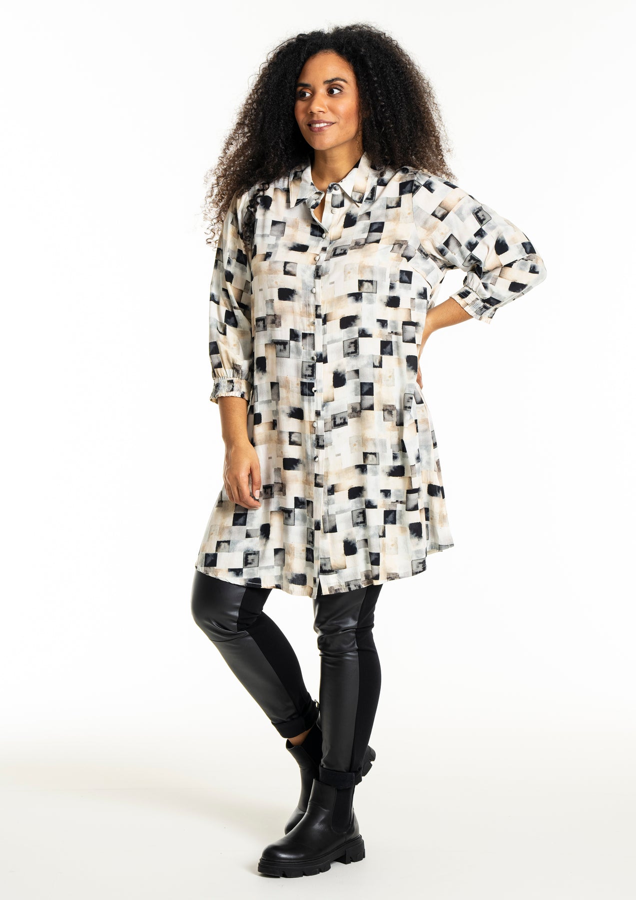 Studio - Emilie síð skyrta með flottu mynstri. Hneppt alla leið niður, skyrtukragi, kvartermar með teygju. Hægt að nota opna yfir buxur og topp eða lokaða eins og kjól.