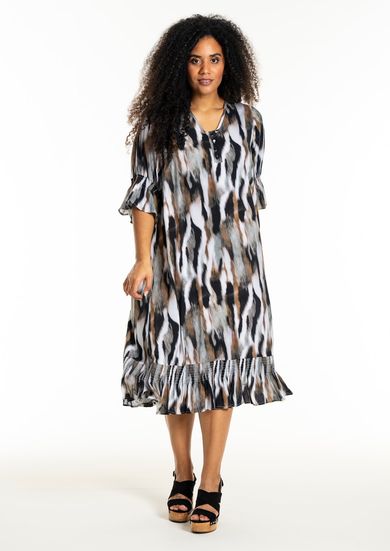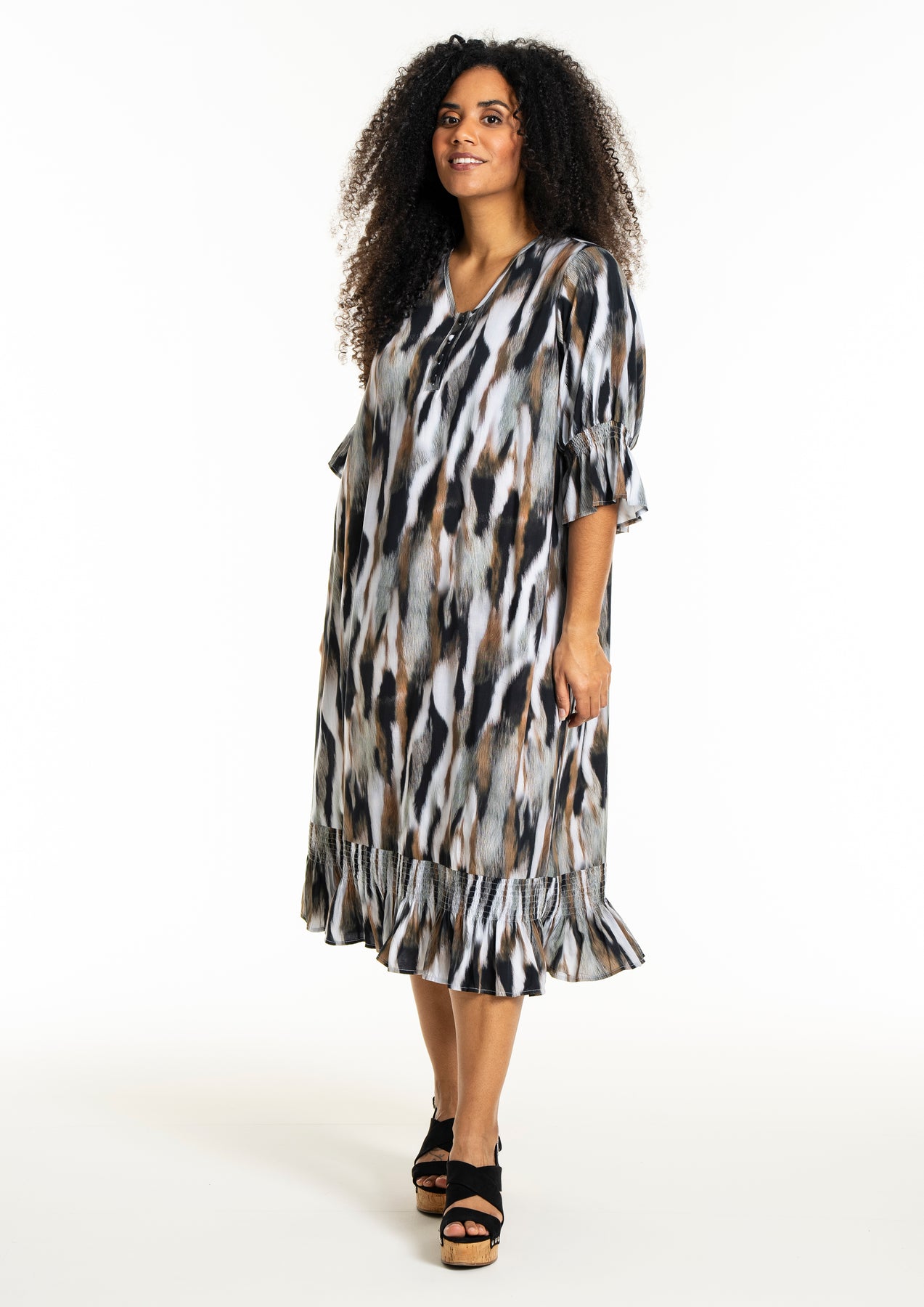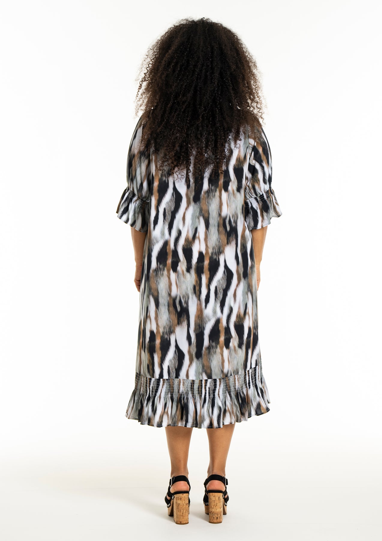 Studio - Gena kjóll með flottu mynstri. V-hálsmál með tölum, kvartermar með smá teygju og pífu, rykkt teygja og pífa neðst á faldi.