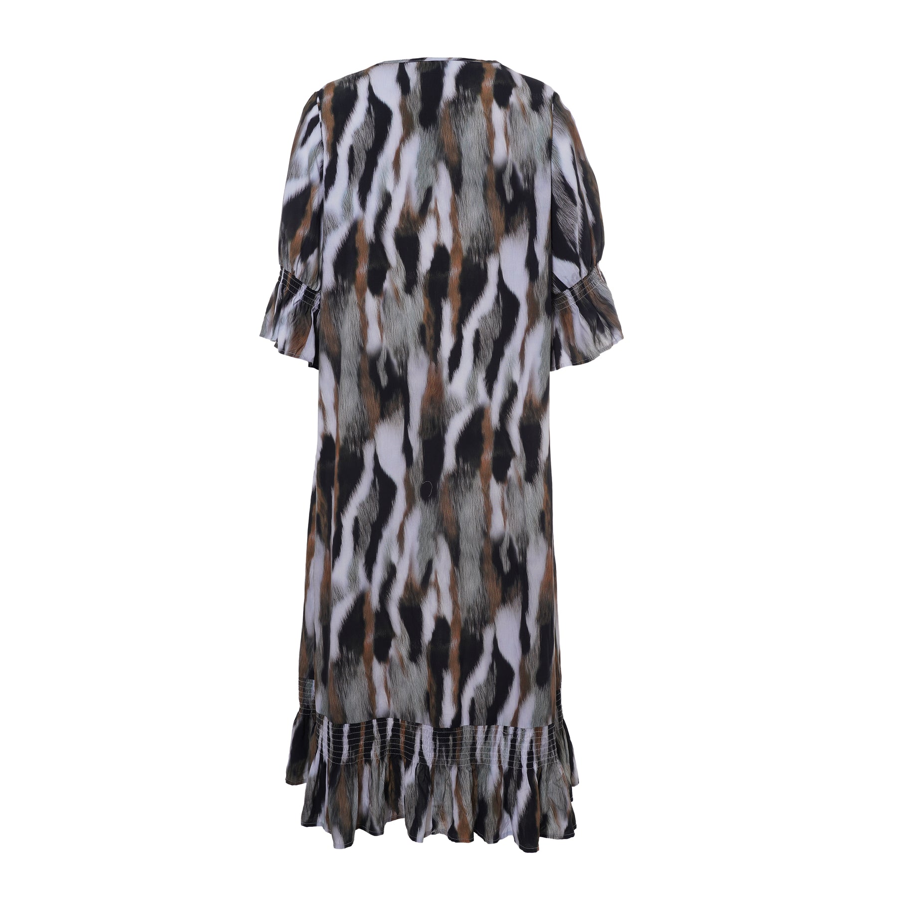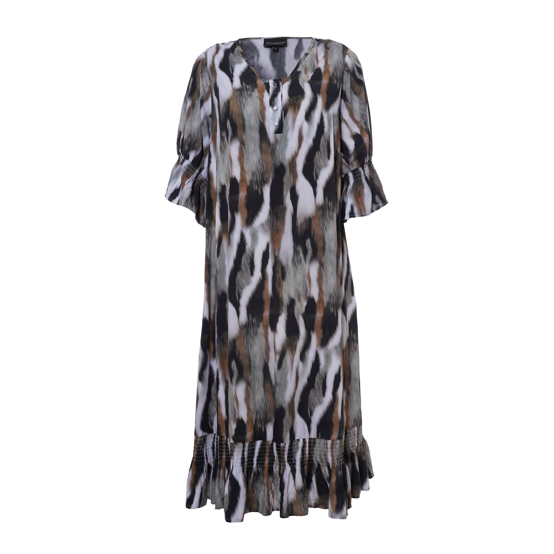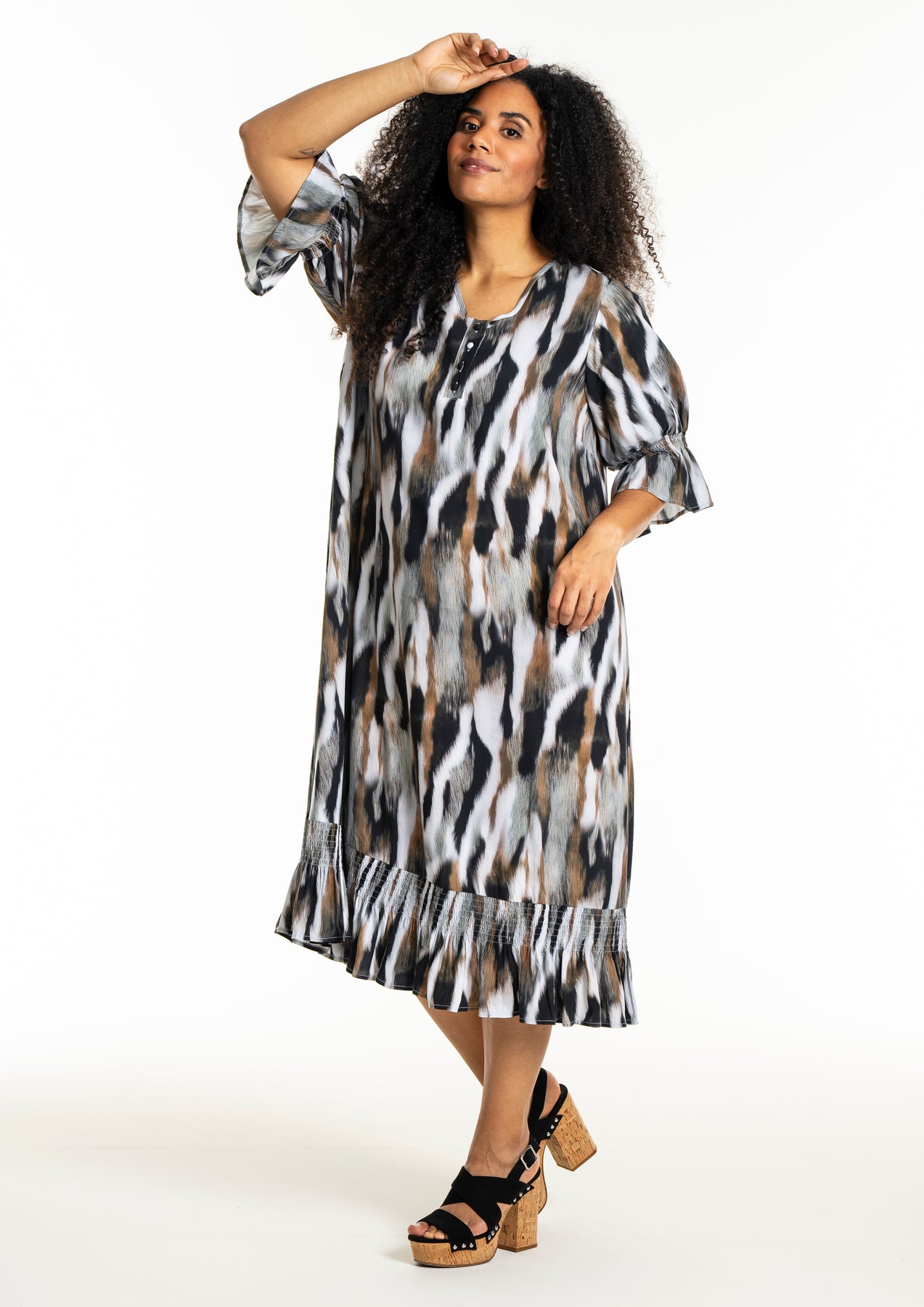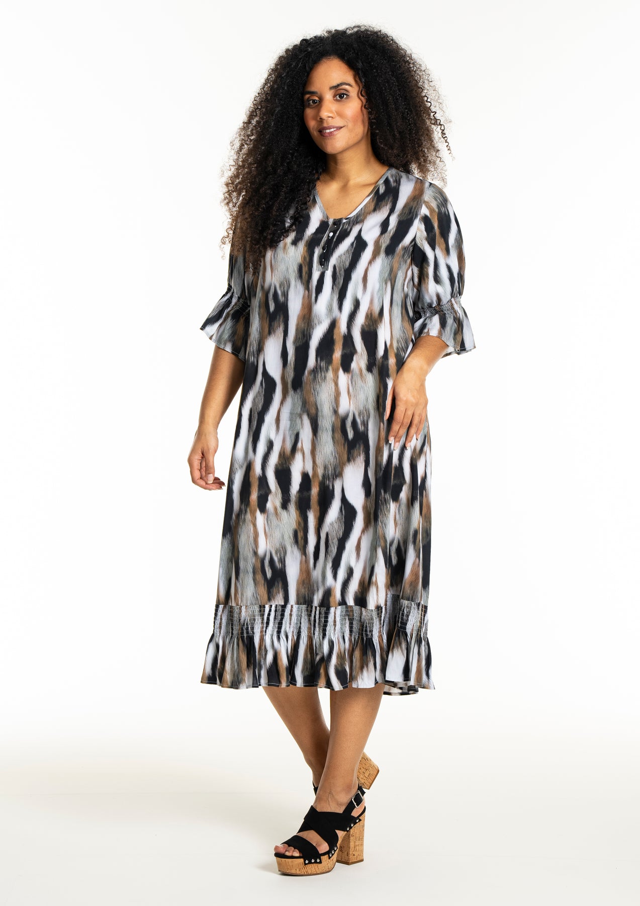 Studio - Gena kjóll með flottu mynstri. V-hálsmál með tölum, kvartermar með smá teygju og pífu, rykkt teygja og pífa neðst á faldi.