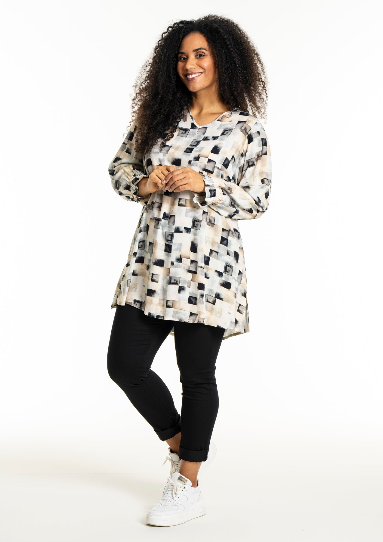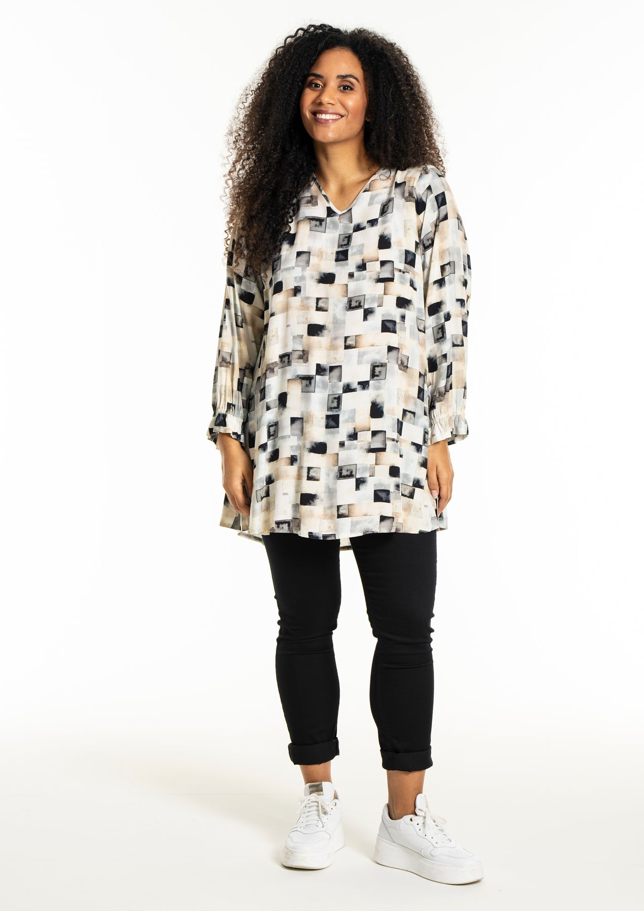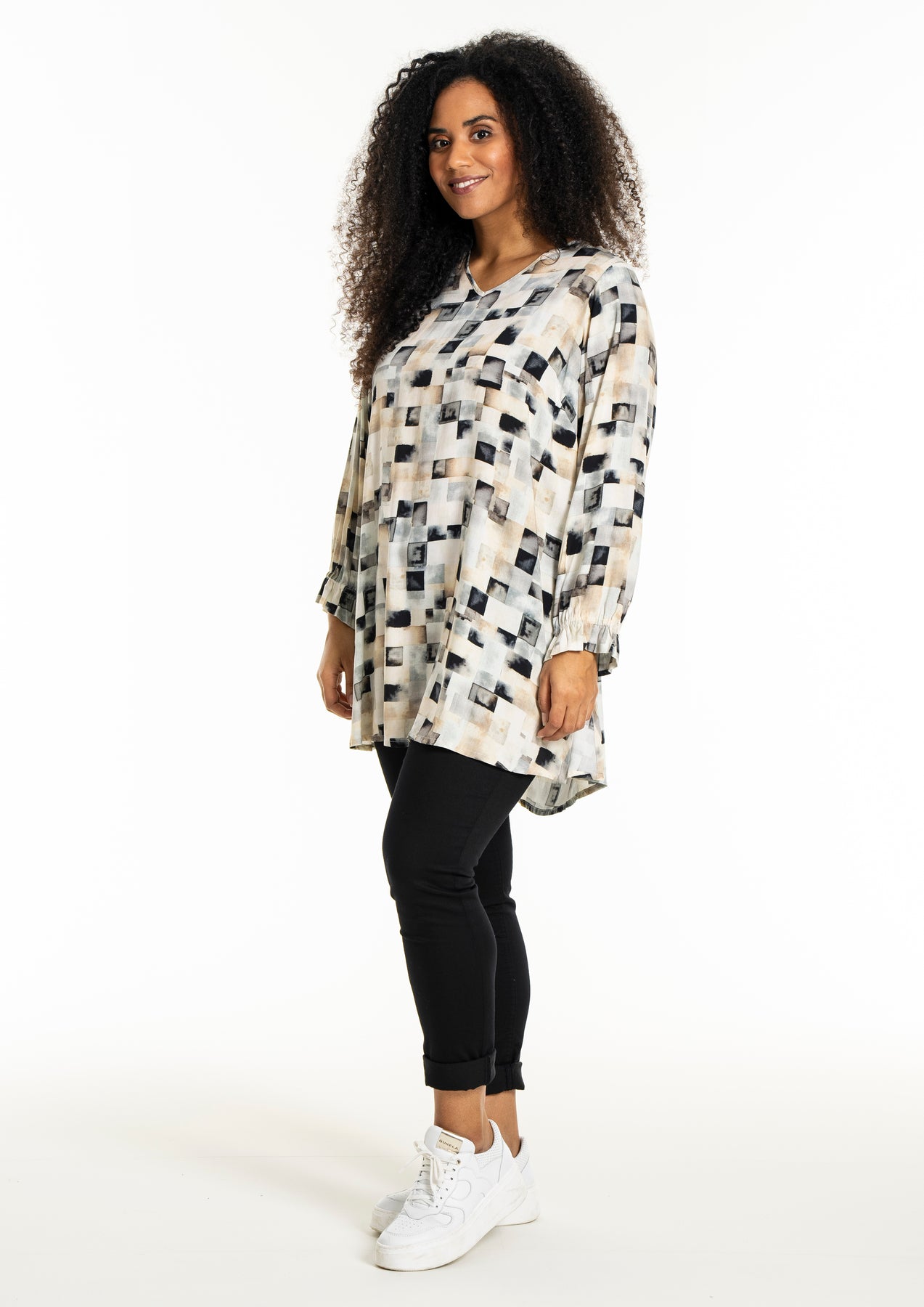 Studio - Tanja flott og sparileg tunika með mynstri. V-hálsmál, langar ermar með rykktu stroffi, síðari að aftan, klaufar á hliðum og smá rykking á bakstykki sem gefur betri hreyfingu.