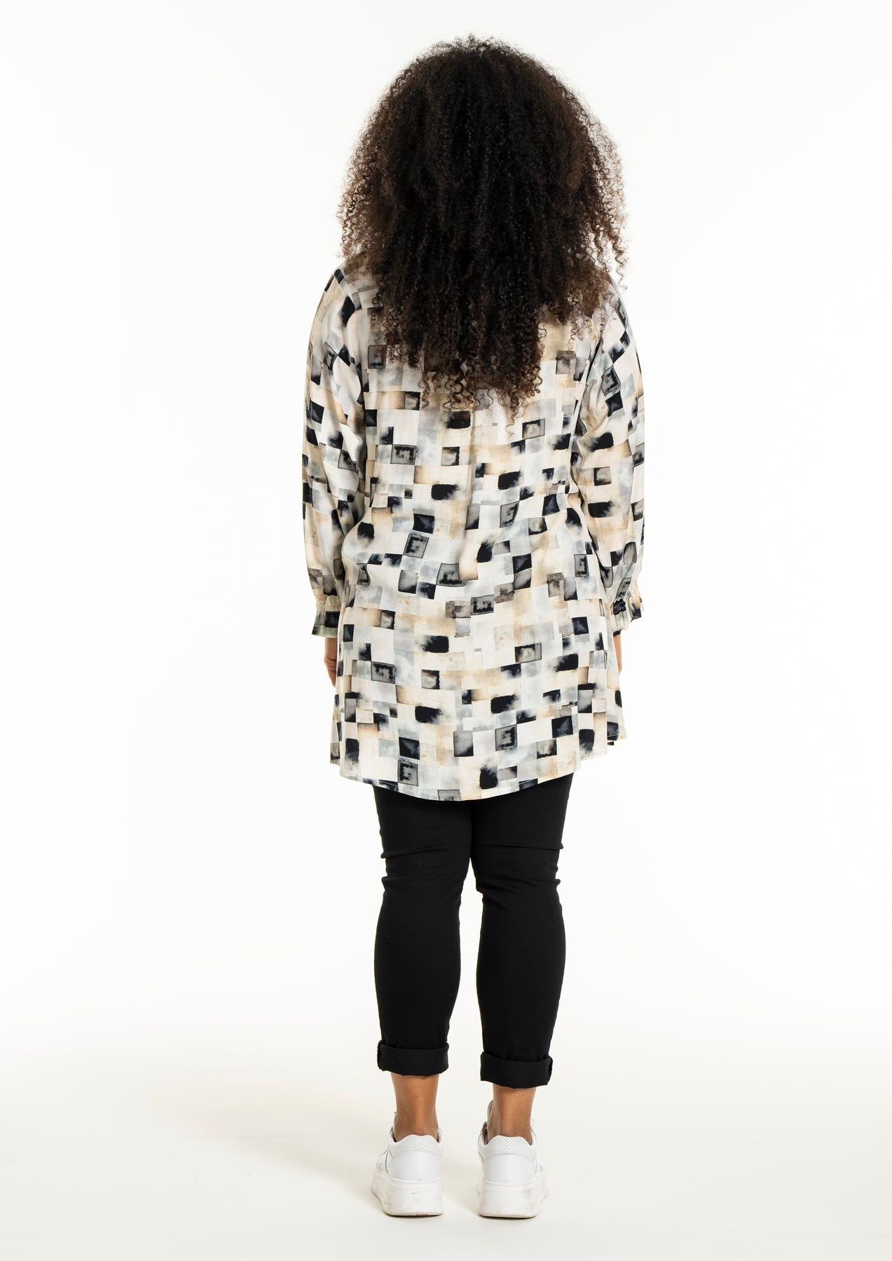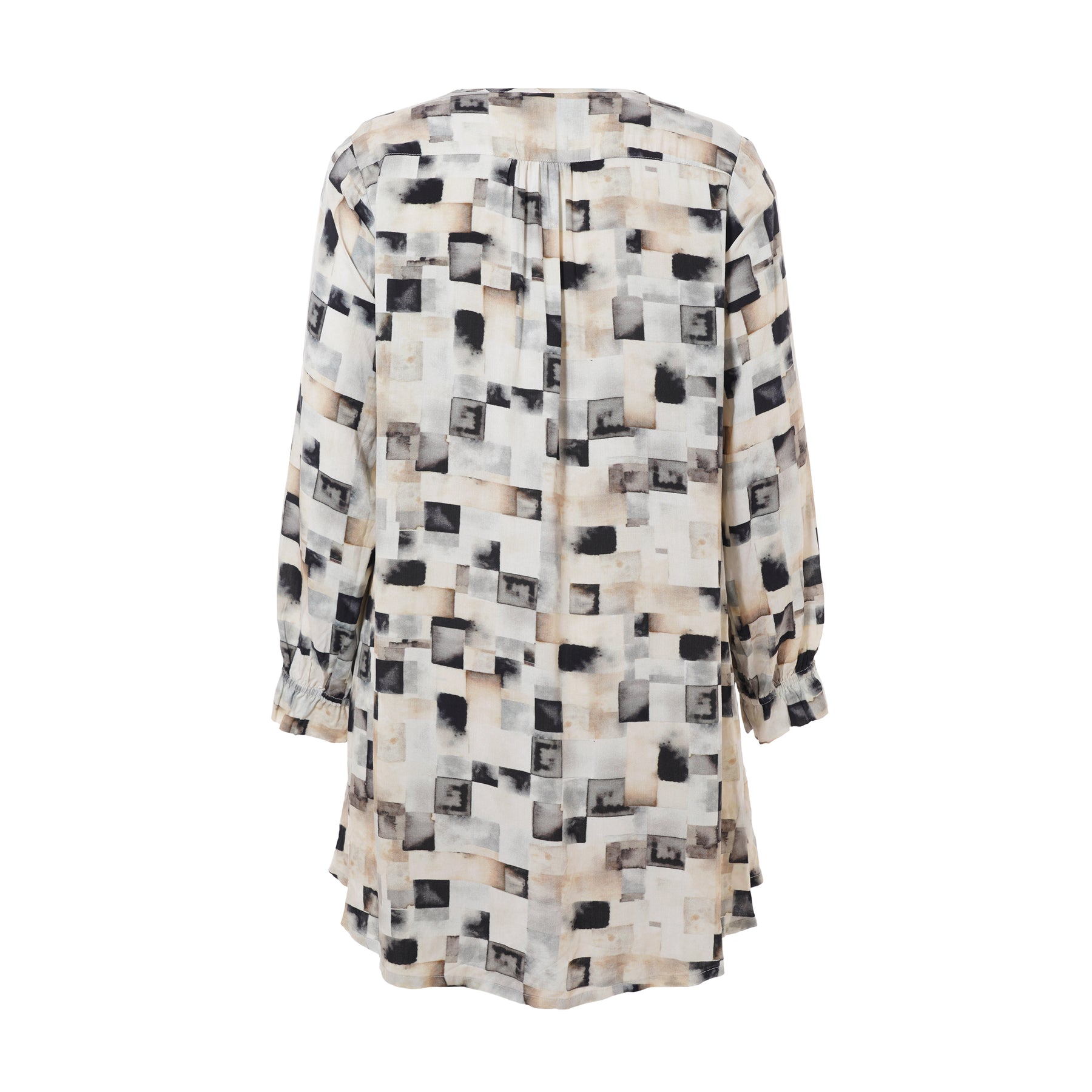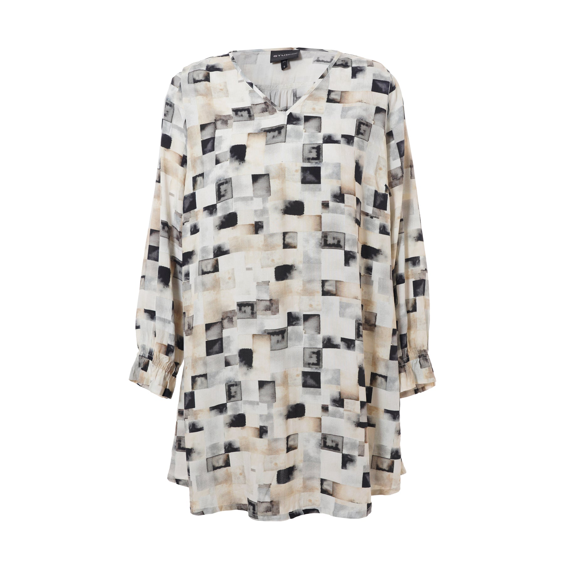 Studio - Tanja flott og sparileg tunika með mynstri. V-hálsmál, langar ermar með rykktu stroffi, síðari að aftan, klaufar á hliðum og smá rykking á bakstykki sem gefur betri hreyfingu.