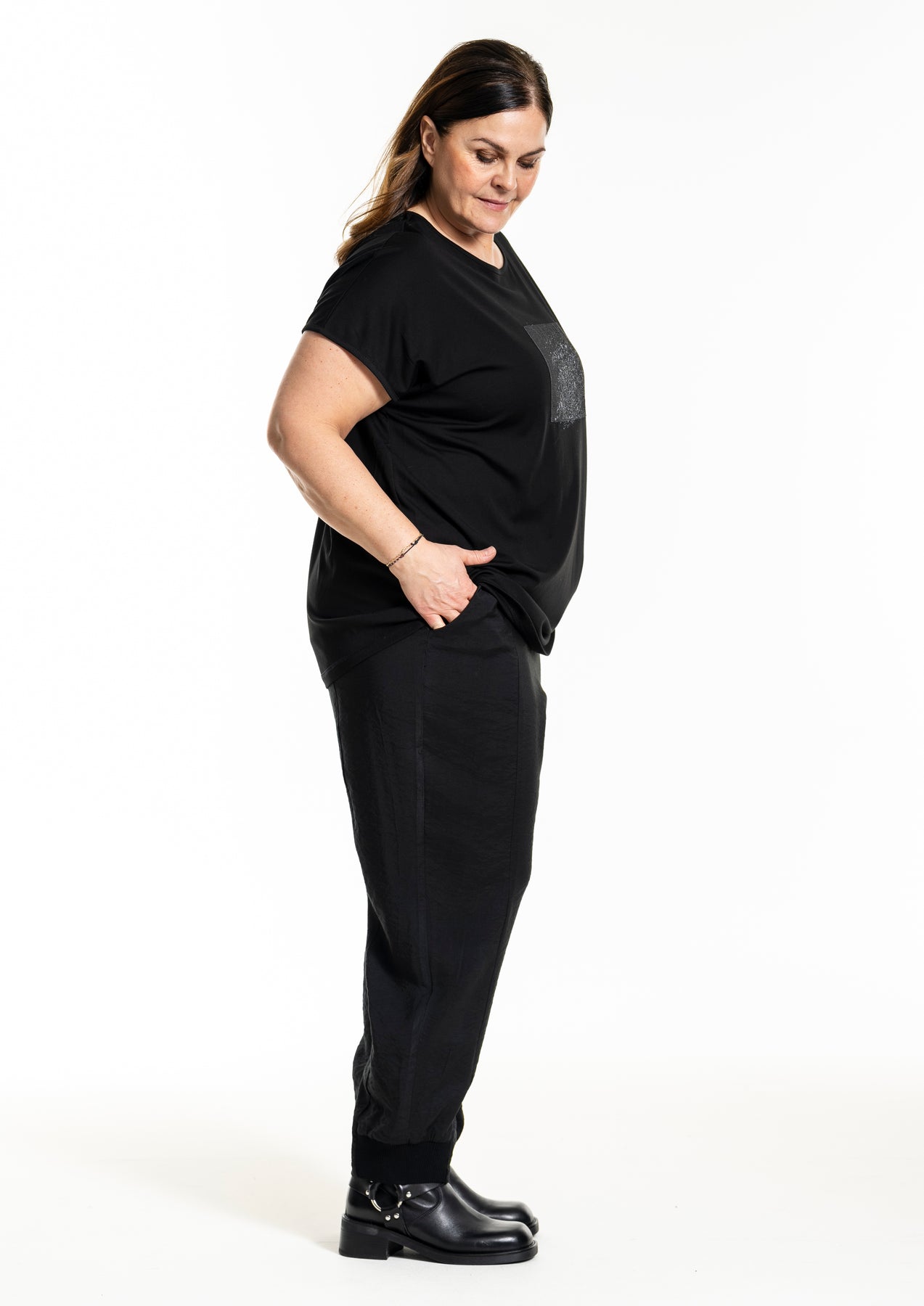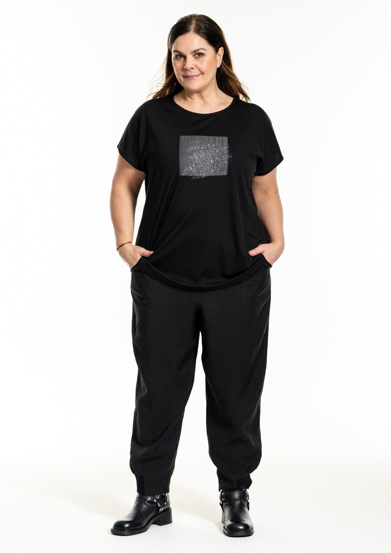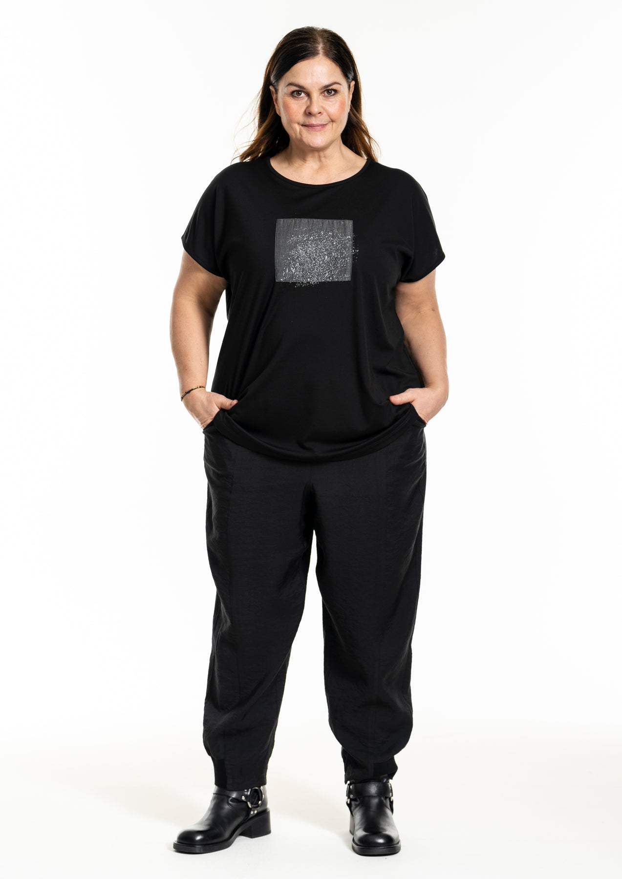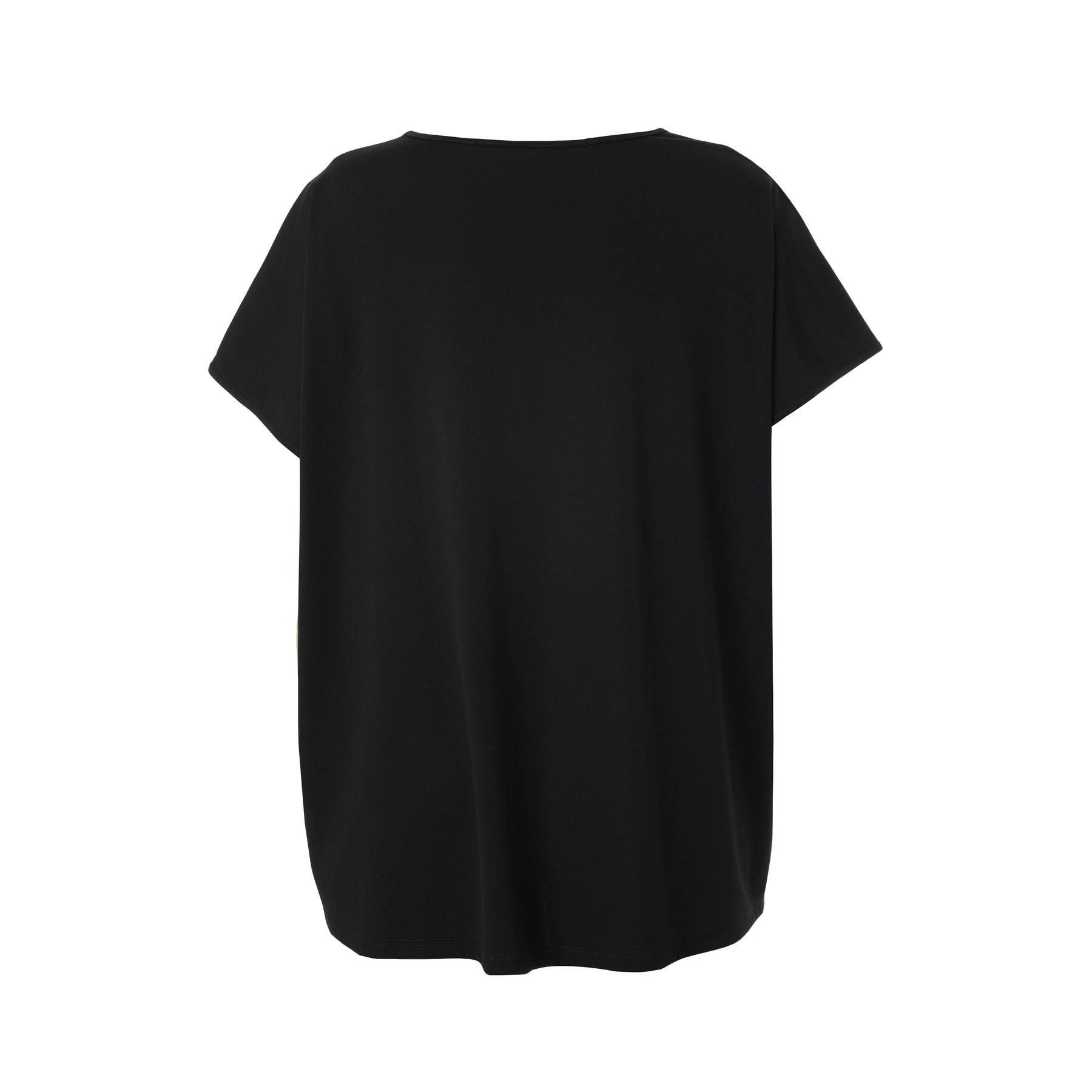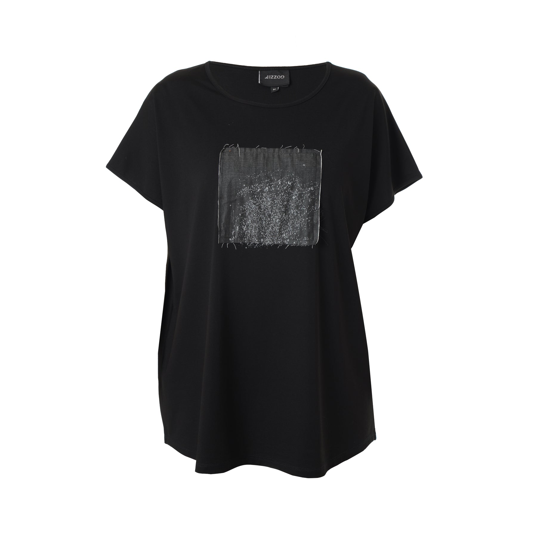 GOZZIP Black Hensia stuttermabolur úr góðu og þægilegu viskosefni með rúnuðu hálsmáli. Grár rammi að framan með fíngerðu silfurprenti.