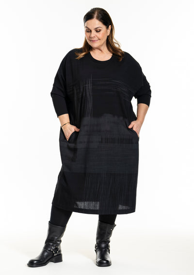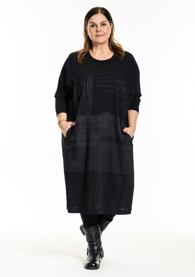Gozzip Black - Ilena, Flottur svartur "oversized" kjóll með gráleytu mynstri, rúnað hálsmál, langar ermar og vasar.
