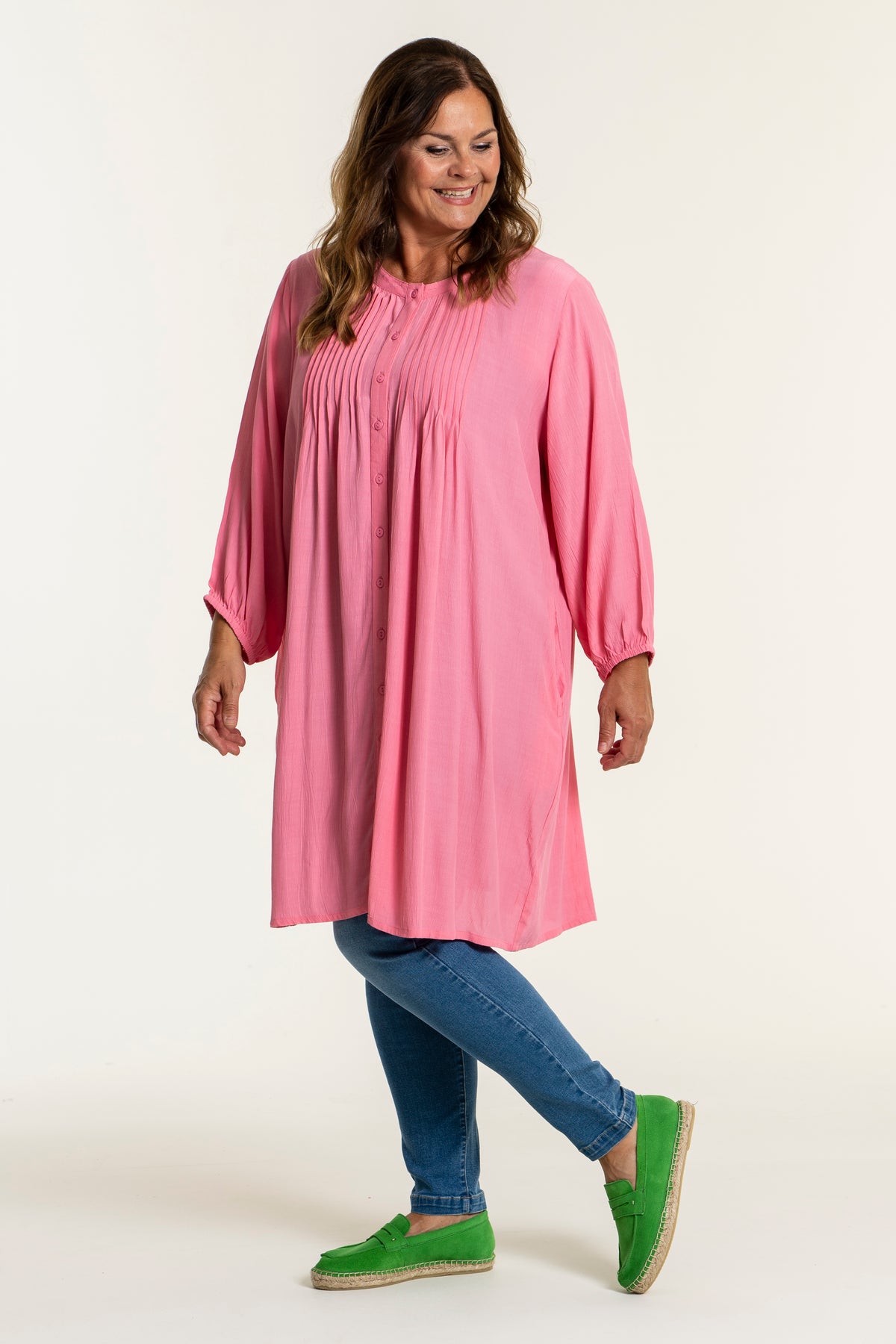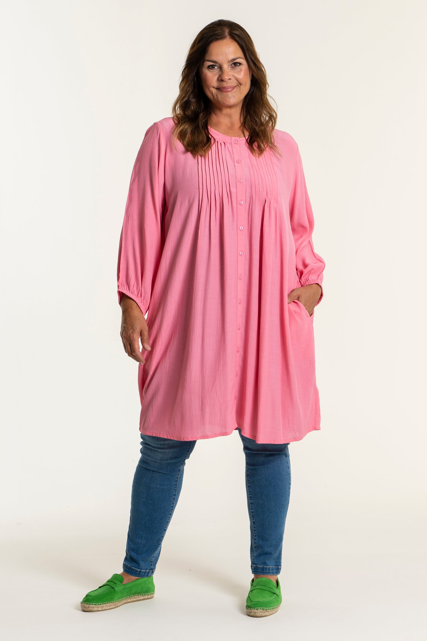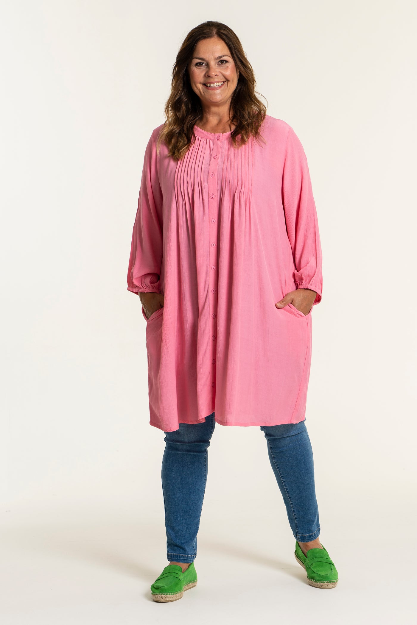 Gozzip by Studio - skyrtukjóllinn vinsæli, einlitur bleikur, l látlaus með fellingum á bringu og í baki, víkkar niður og góðir vasar, hægt að nota opinn yfir buxur og topp eða lokaðan eins og kjól eða tuniku.