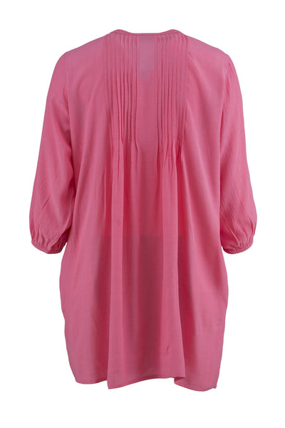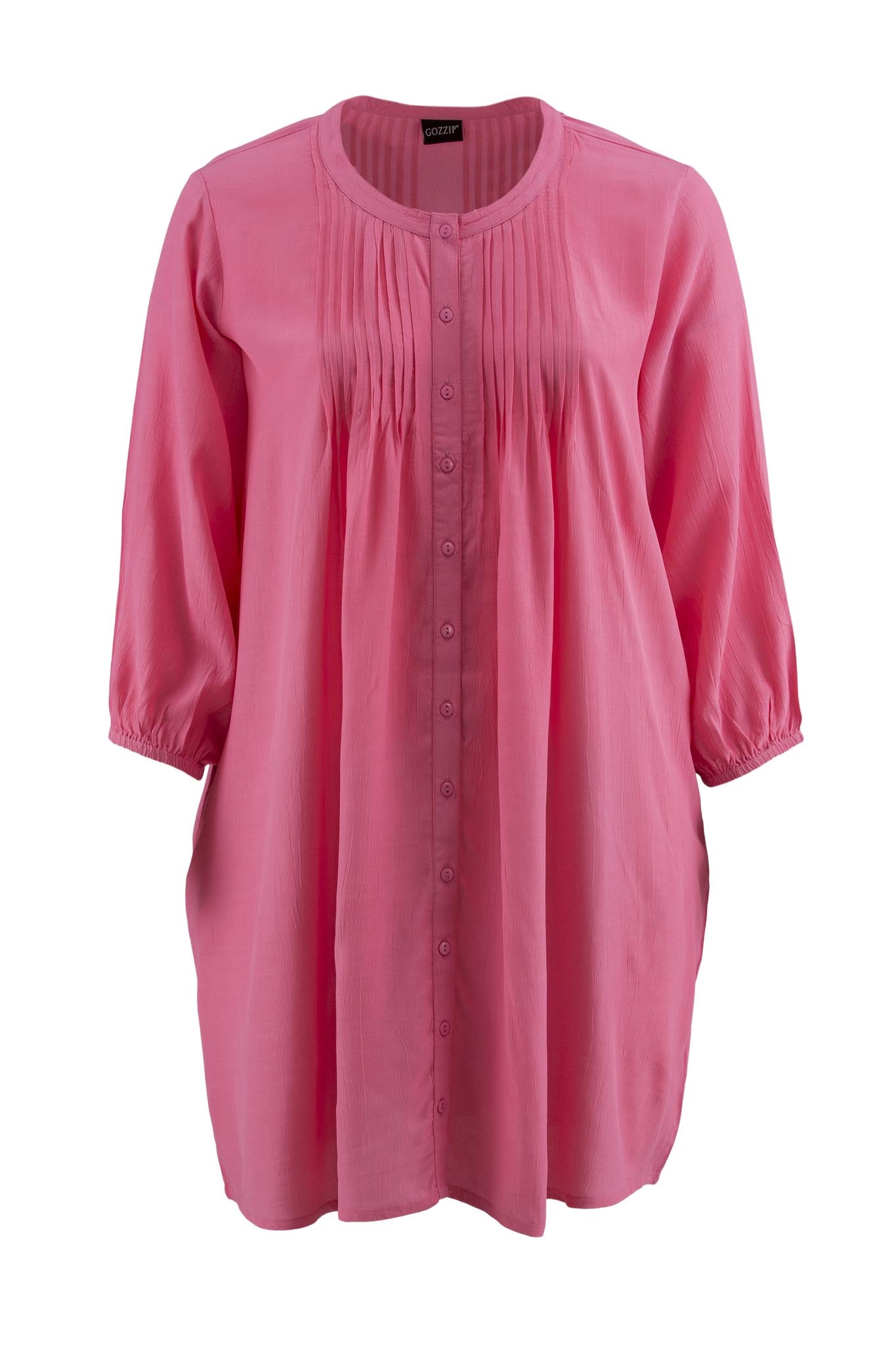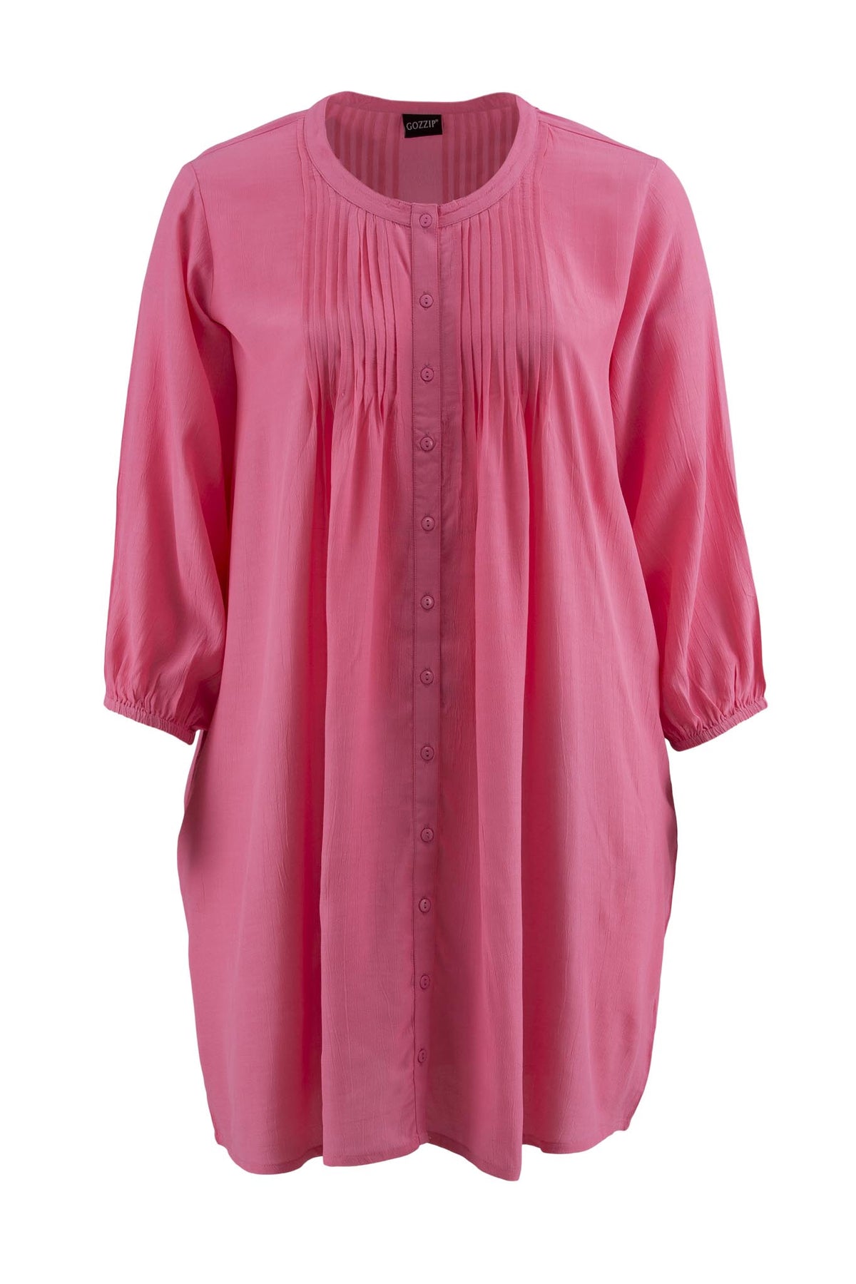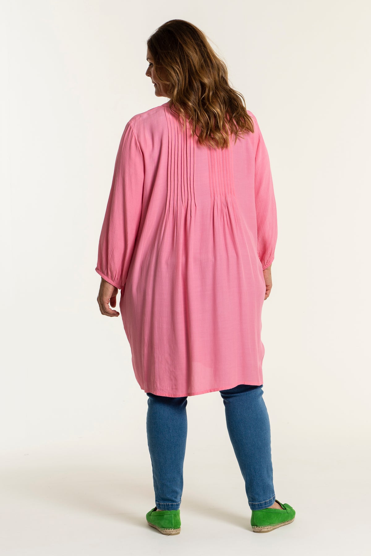 Gozzip by Studio - skyrtukjóllinn vinsæli, einlitur bleikur, l látlaus með fellingum á bringu og í baki, víkkar niður og góðir vasar, hægt að nota opinn yfir buxur og topp eða lokaðan eins og kjól eða tuniku.