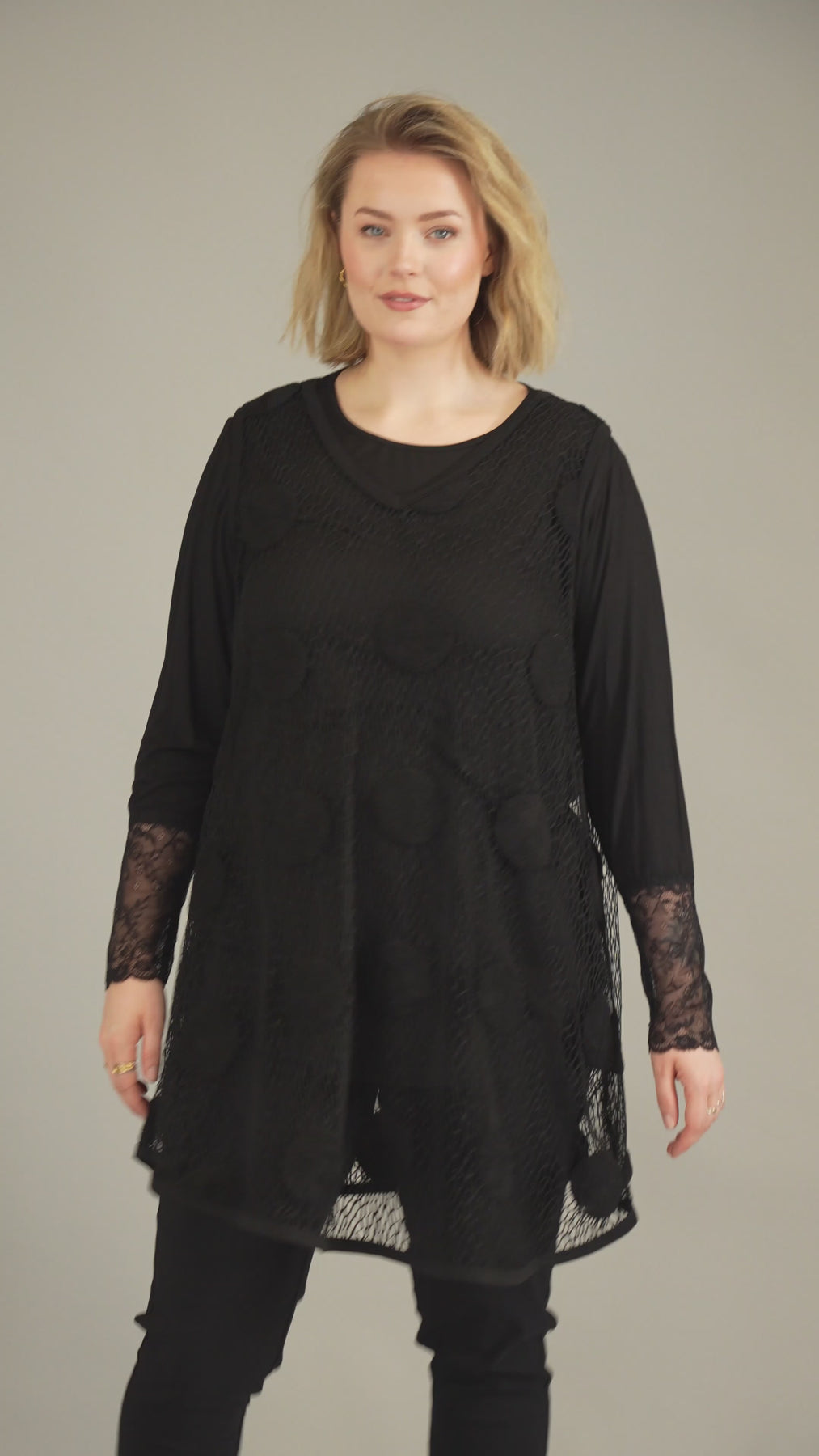 Gozzip - Josefine flottur shiffon toppur með doppum. Breiðir og góðir hlýrar, V-hálsmál, rúnaður að neðan, aðeins síðari að aftan. Flottur yfir alls konar kjóla og tunikur ef þú vilt breyta aðeins til og poppa upp eitthvað einfalt.