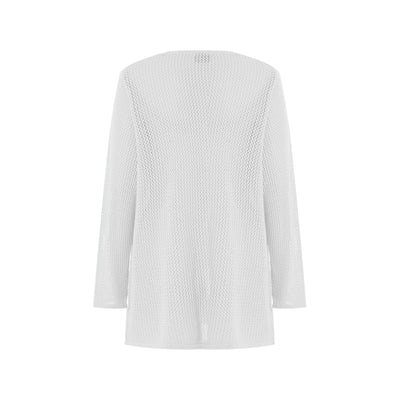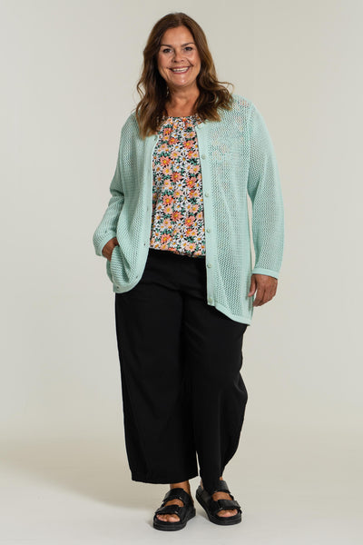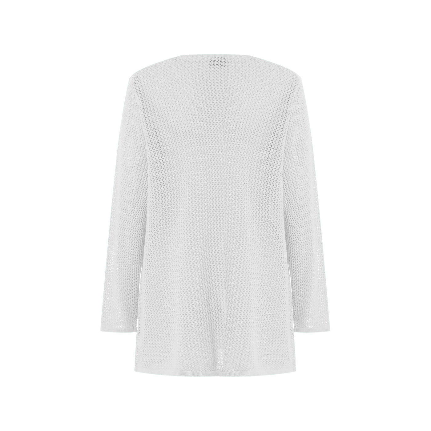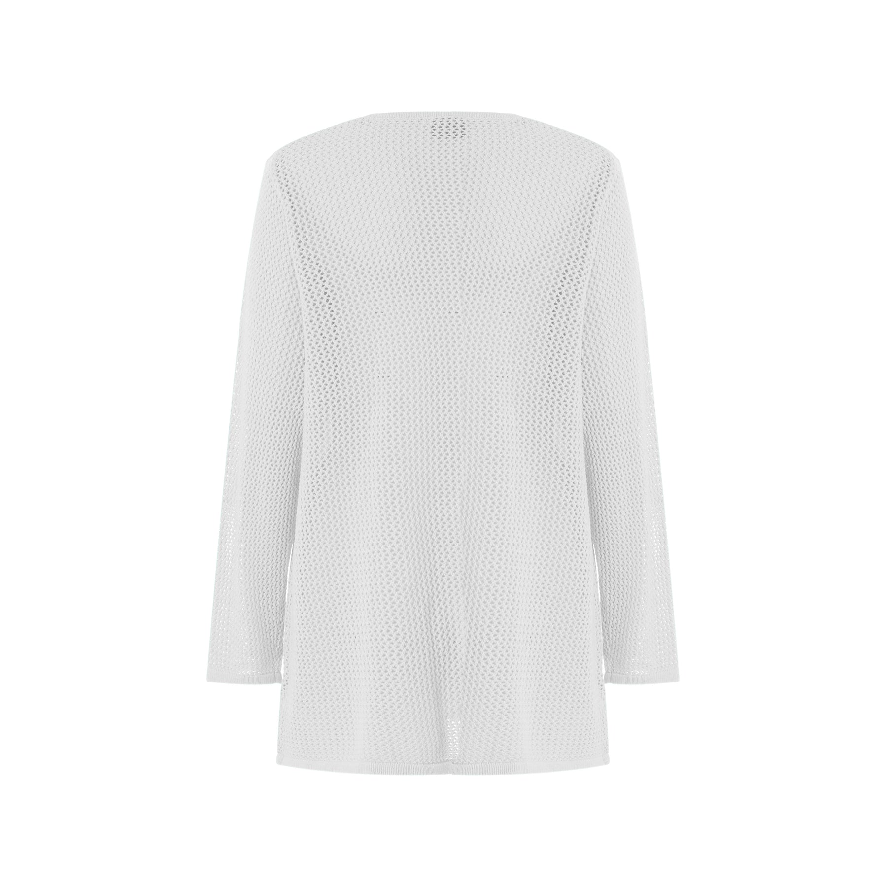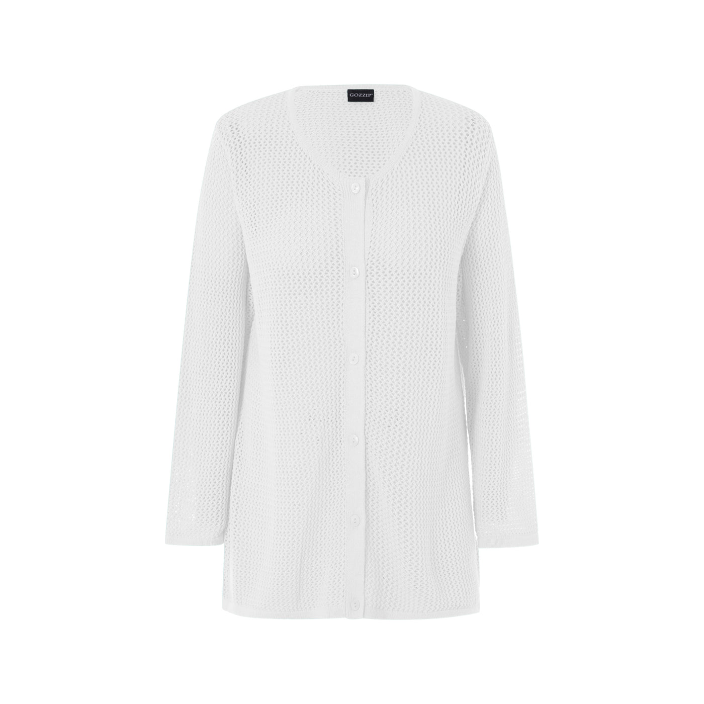 Létt opin hneppt peysa, með smá A-sniði og rúnuðu hálsmáli.