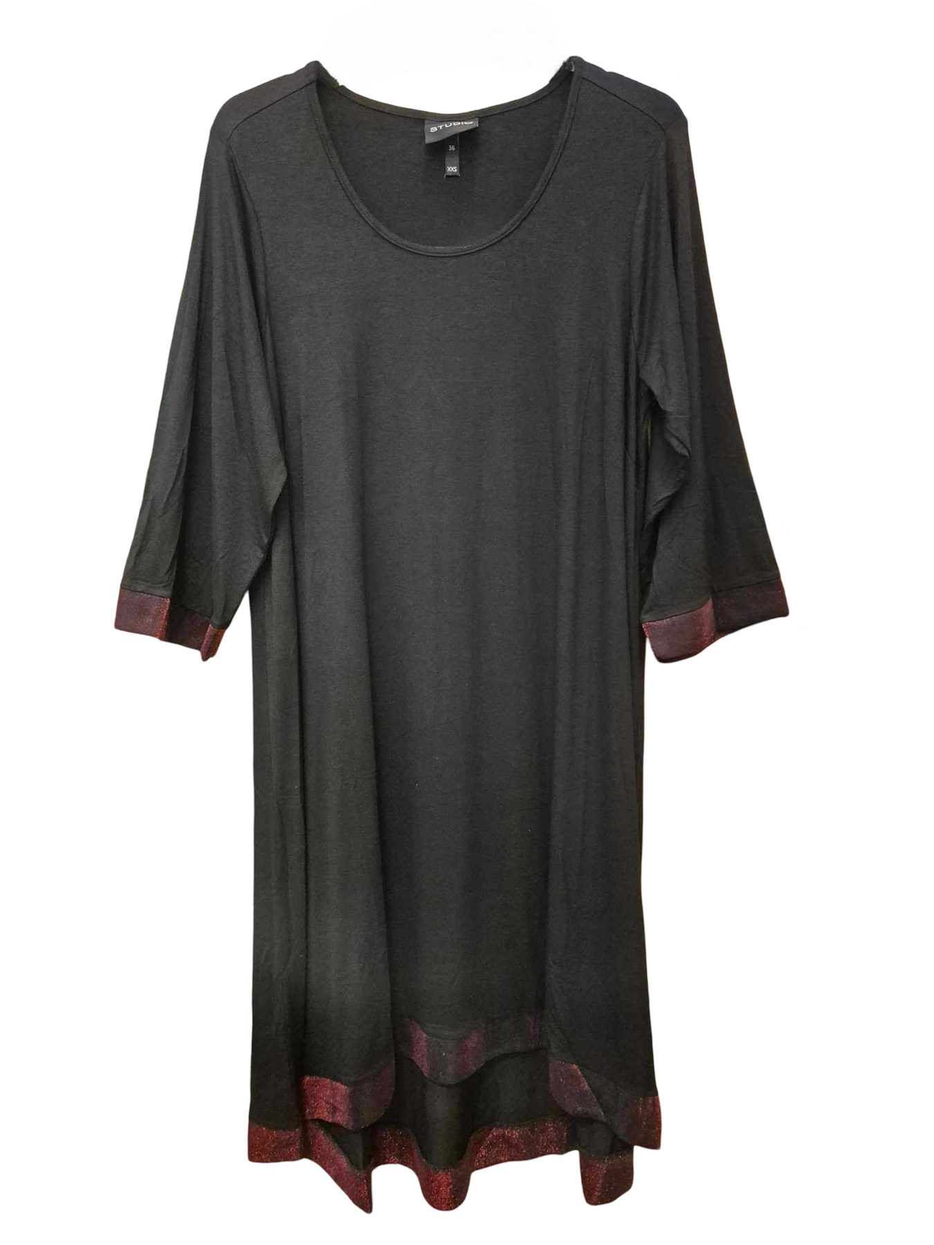 Studio - Evelyn, sparilegur kjóll með rúnuðu hálsmáli og rauðum glimmerkannti neðst, kvartermar líka með glimmerkannti.