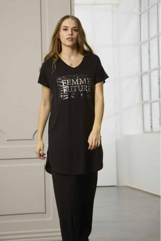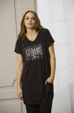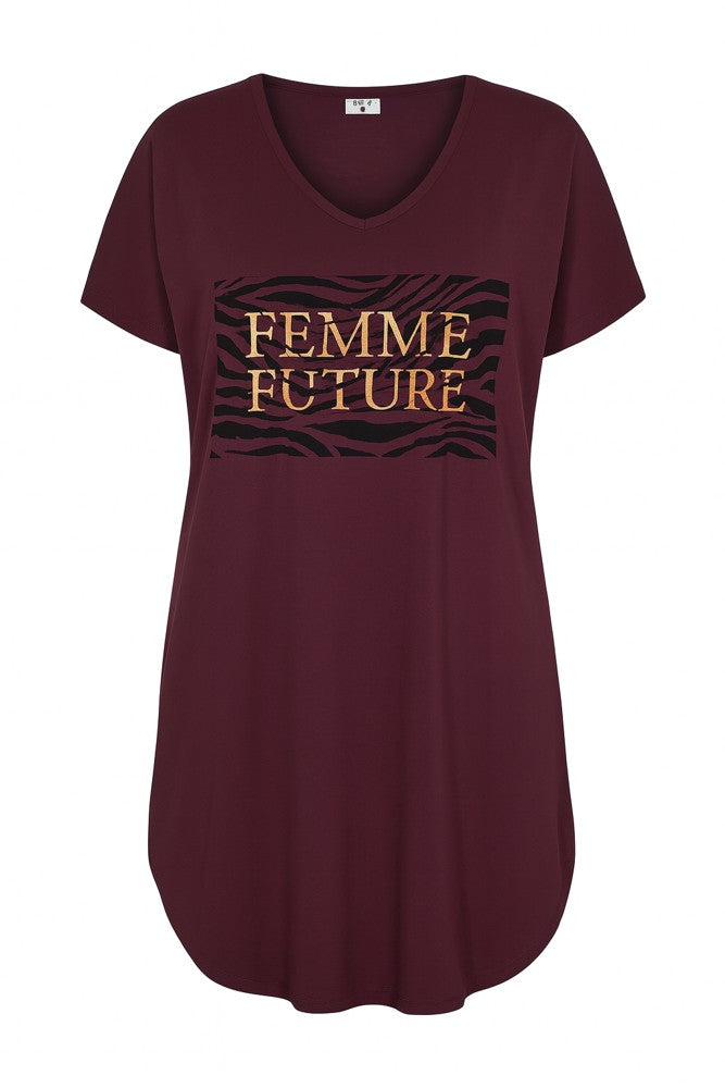 Ze-Ze - Anya mjúkur og notalegur náttkjóll. V-hálsmál, stuttar ermar, rúnaður að neðan, texti að framan "Femme future".