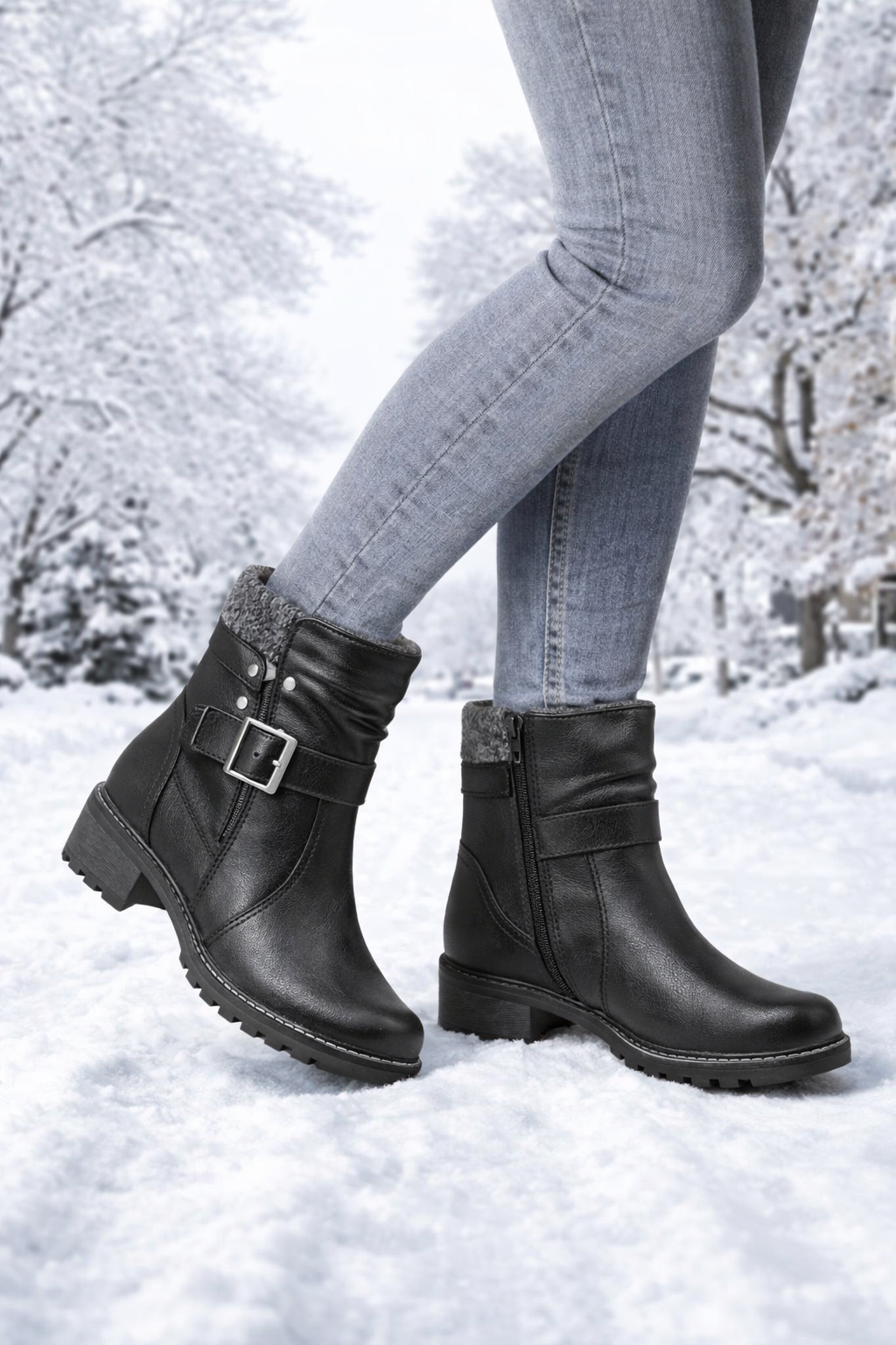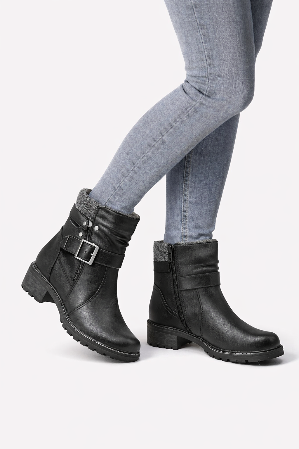 Jana - Fóðraðir vetrarskór með sylgju yfir rist og 4,5 cm hæl. Sólinn er með djúpu, riffluðu mynstri og sexhyrndum gúmmíklemmum sem veita mjög gott grip á bæði blautu og hálku undirlagi. Hentar vel í krefjandi aðstæður og daglega notkun.