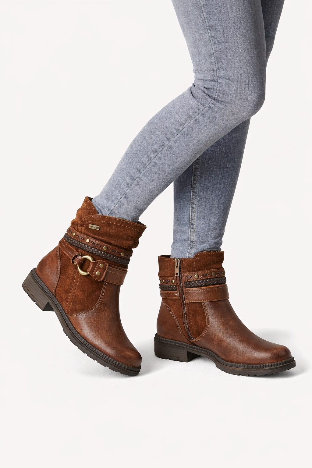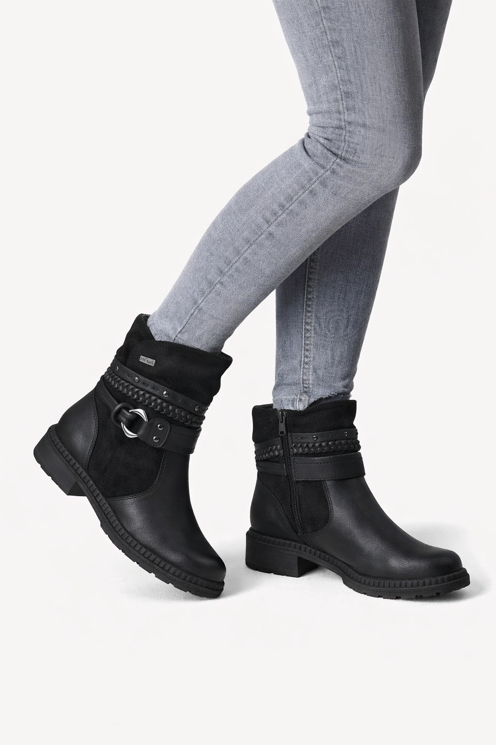 Jana Tex vegan ökklaskór með 3,5 cm hæl. Það er sérlega þægilegt að fara í þessa, rennilás innanfótar sem gerir það mjög auðvelt að klæða sig í þá. Fóðraðir, vatnsheldir svo fæturnir haldast þurrir í hvaða veðri sem er, smart ól utan um ökklann með skrauti, laust innlegg, rúnuð tá.