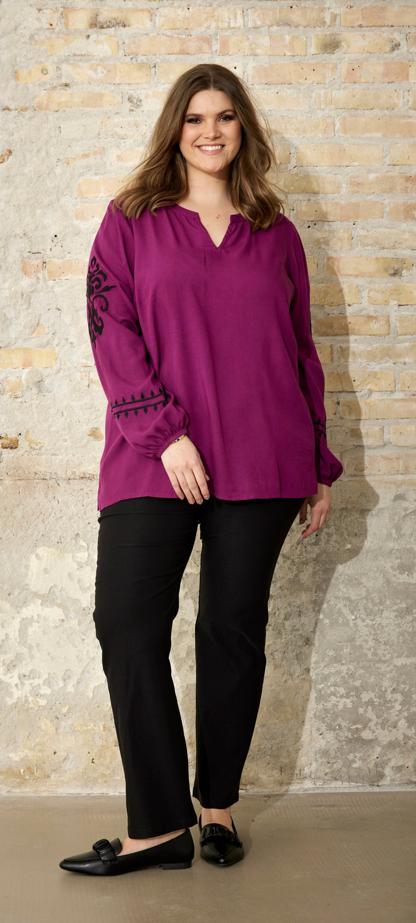Góð teygja í efni, vasar að framan, teygja í mittinu, beinar niður, frekar vítt snið. Góðar vetrarbuxur.