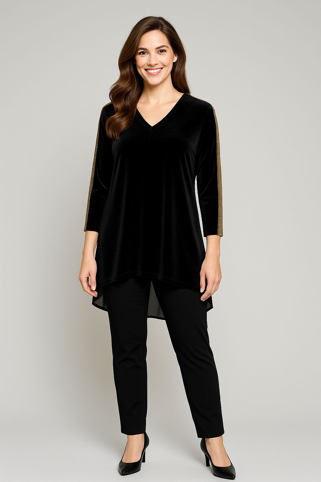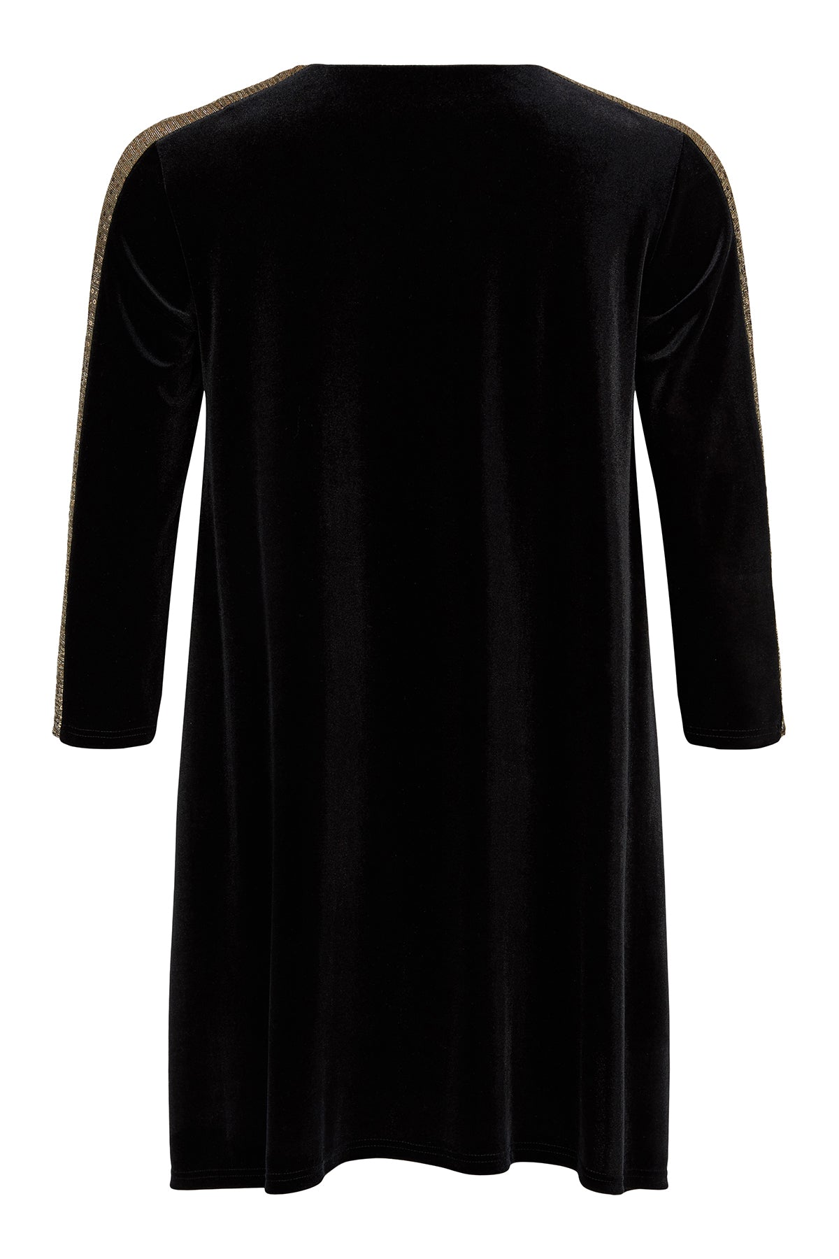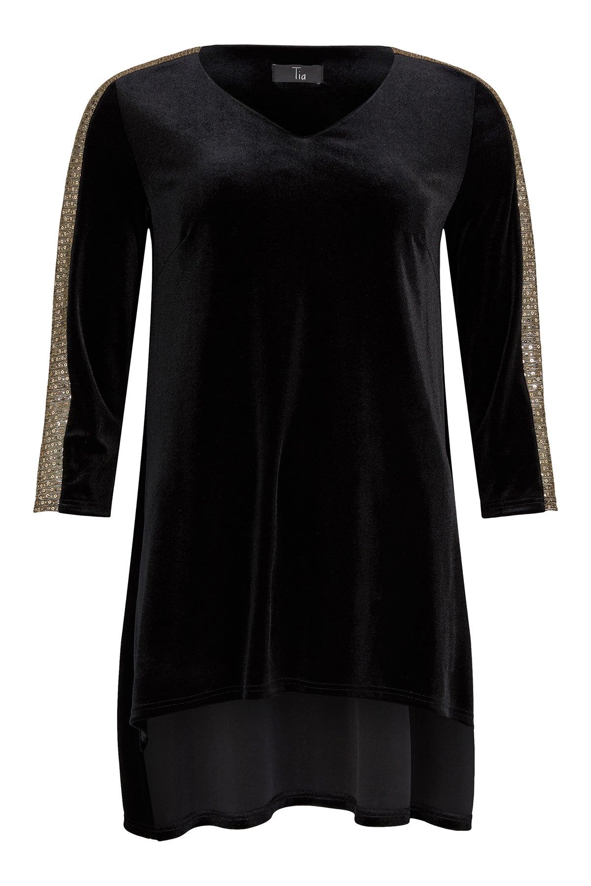 Tia - Adelyn falleg og sparileg velúr tunika. V-hálsmál, aðeins síðari að aftan, klauf á hlið, kvartermar, gyllt pallíettu rönd frá öxlum og niður ermarnar.