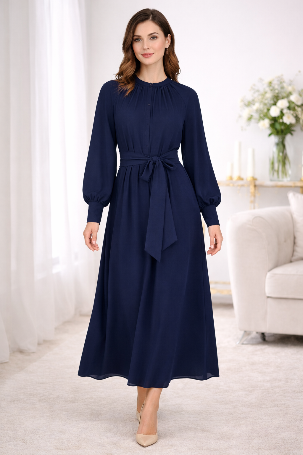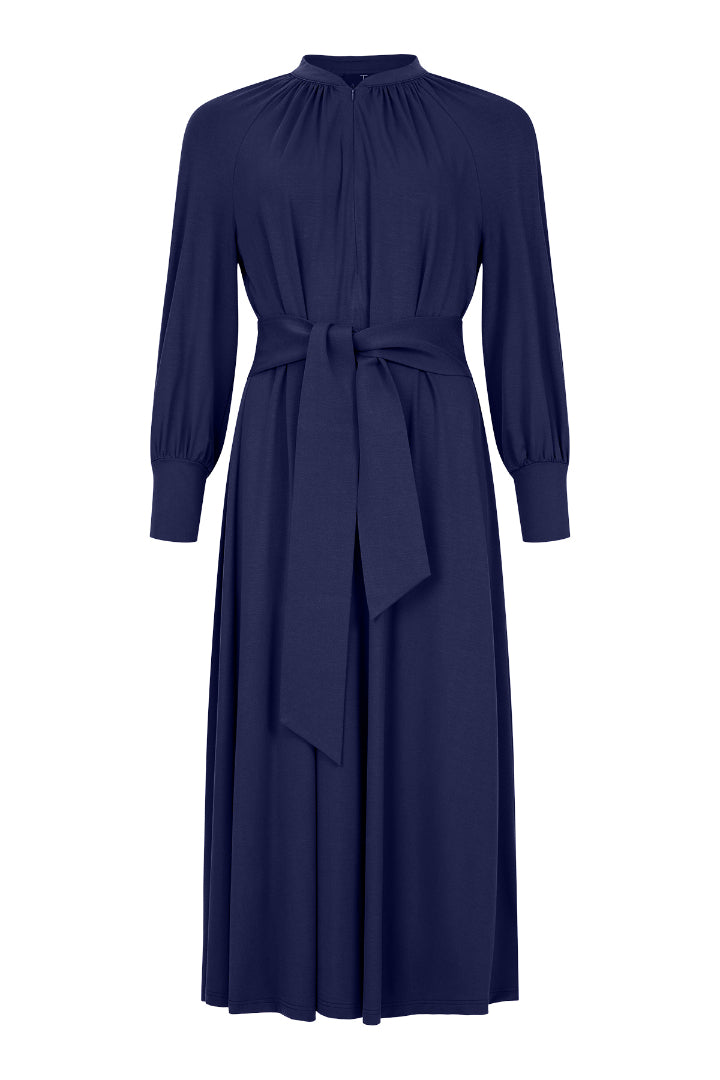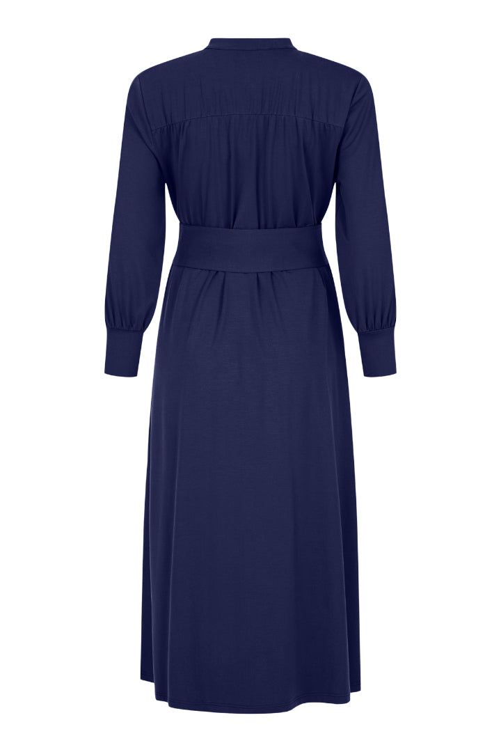 Tia - Amina flottur og sparilegur kjóll úr æðislegu lyocell efni. Langar ermar með teygju, rúnað hálsmál, rennilás að framan, teygja í mitti, þétt og gott efni, bundin að framan.
