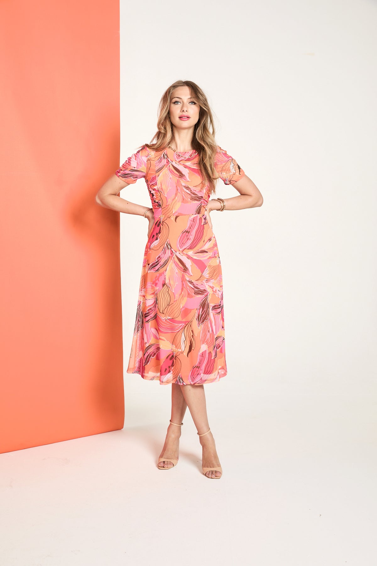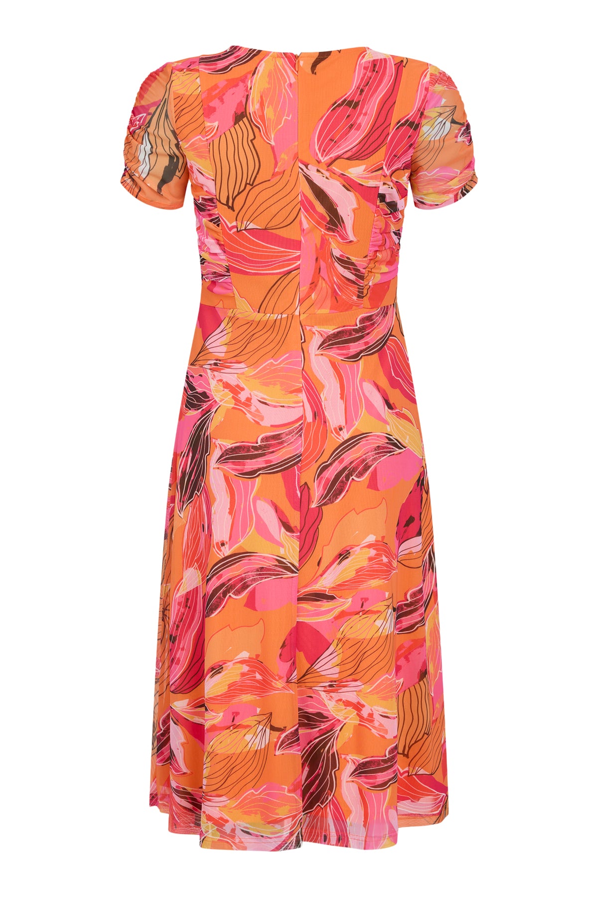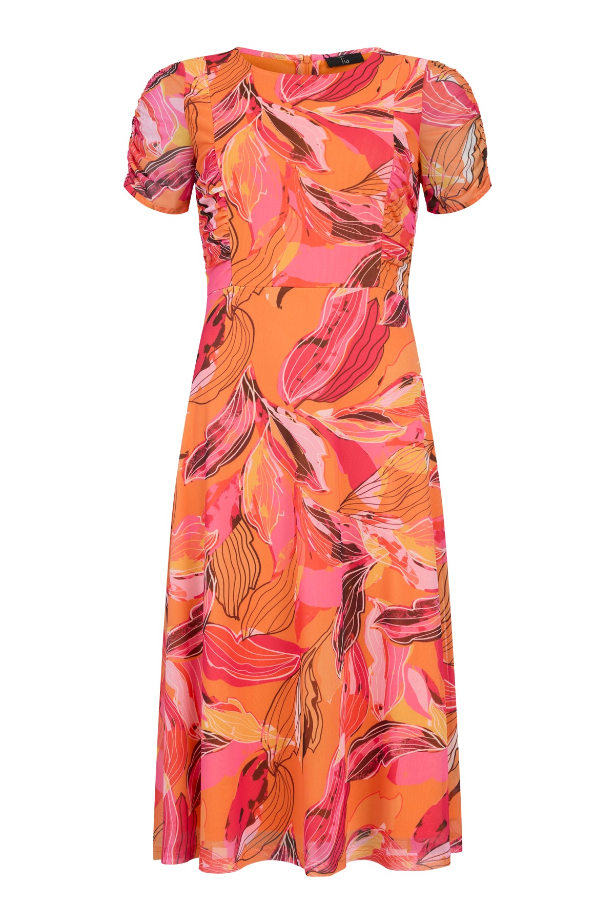 Tia - Daphne flottur og sparilegur stuttermakjóll með mynstri. Rúnað hálsmál, rykking að framan og á ermum, rennilás að aftan. Tilvalinn fyrir veislur eða önnur sérstök tilefni.