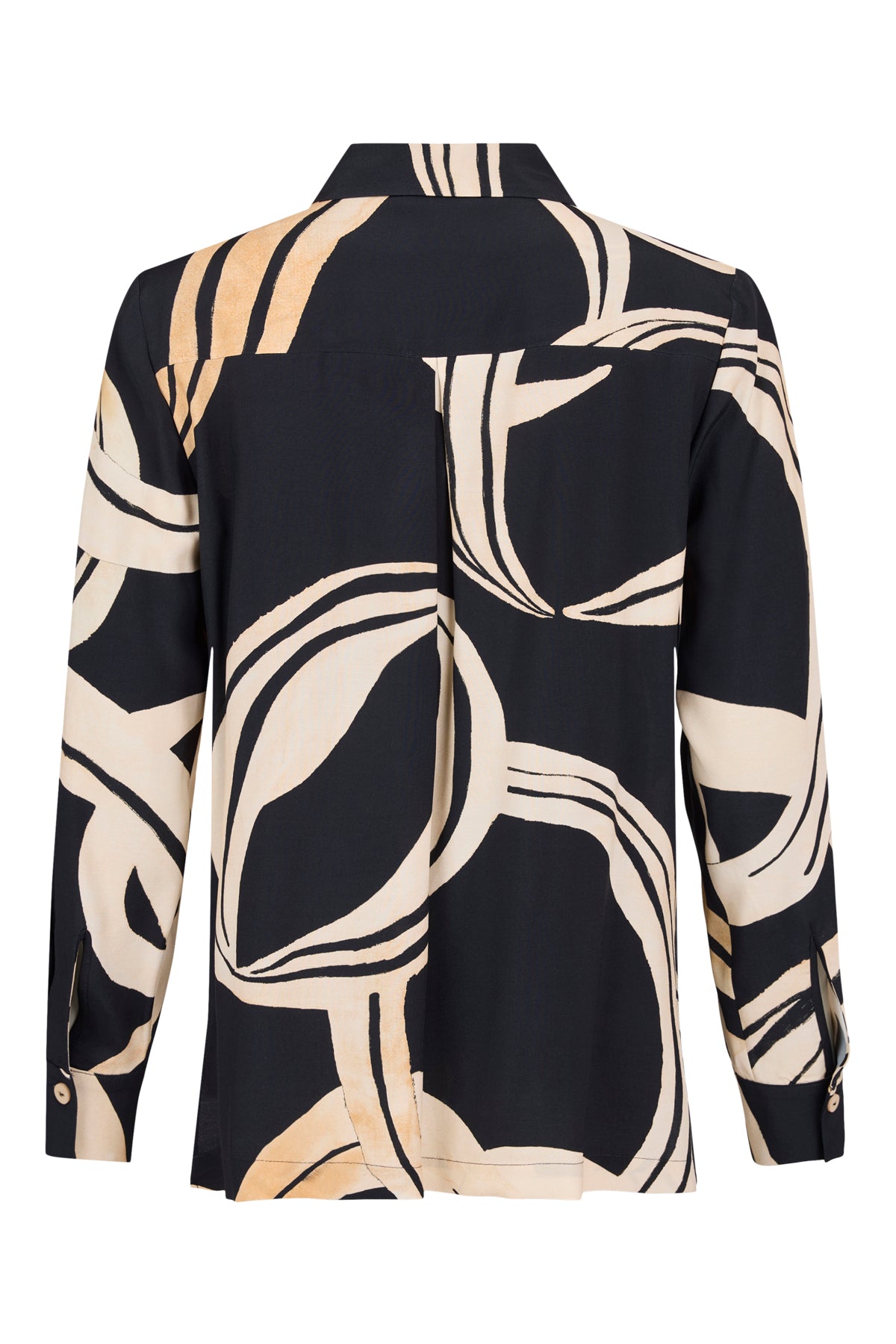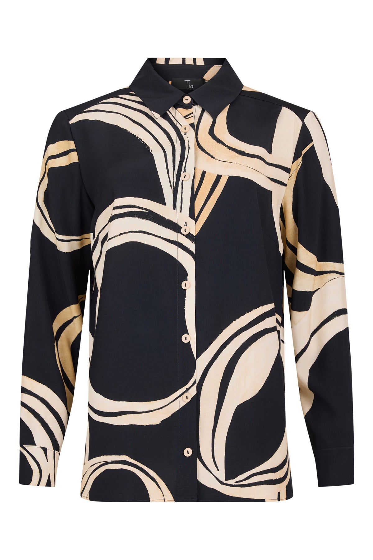 Tia - Wendy falleg og sparileg blússa með flottu mynstri. Skyrtukragi, felling í baki fyrir betri hreyfivídd, hneppt alla leið niður, langar ermar, aðeins síðari að aftan, rúnuð að neðan.