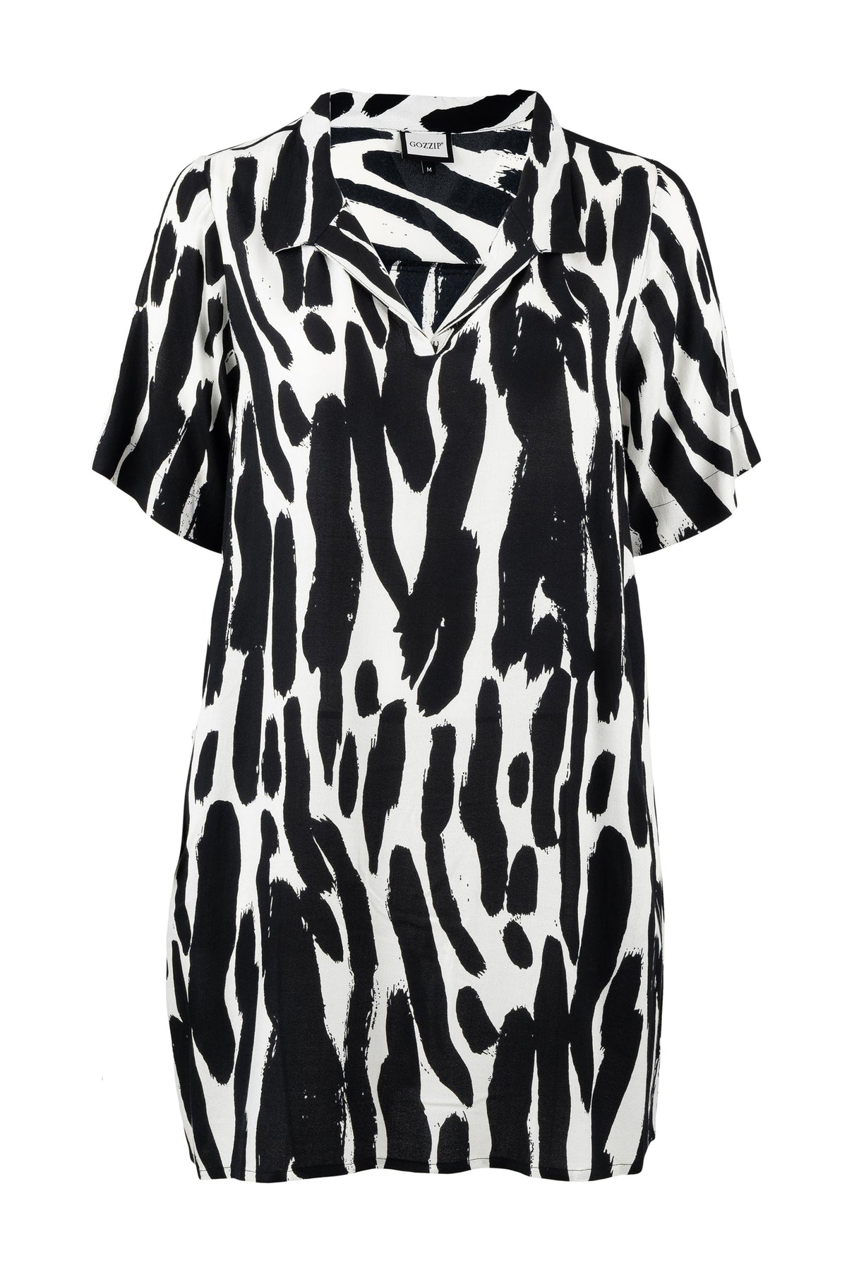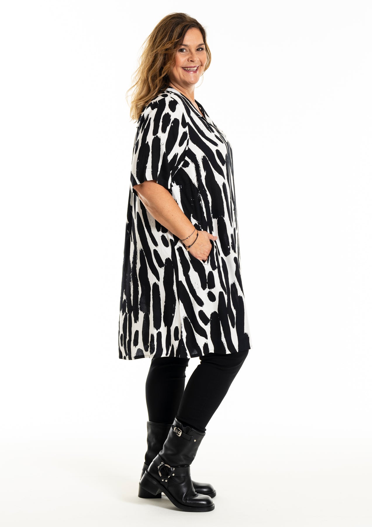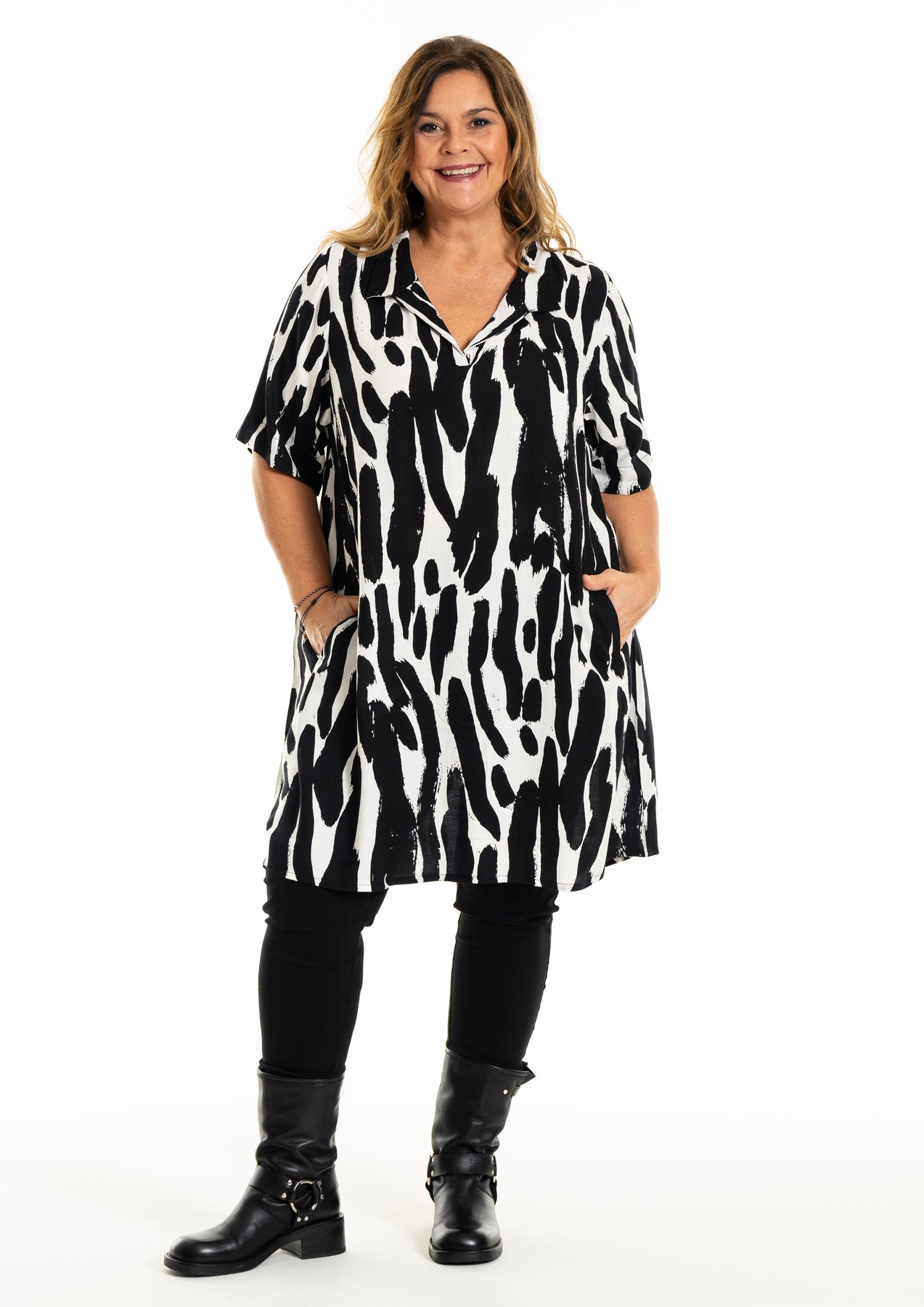 Gozzip - Mette flott og þægileg mynstruð tunika. V-hálsmál og skyrtukragi, stuttar ermar, góðir vasar að framan. Passar vel hvar sem er, bæði hversdags og spari.