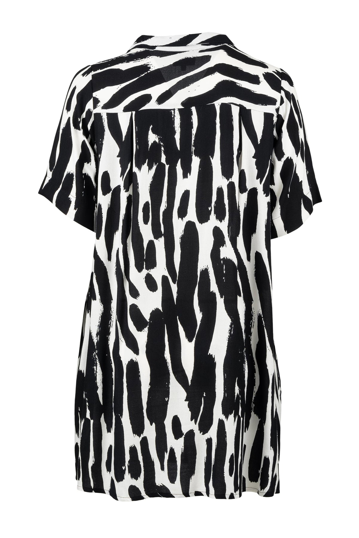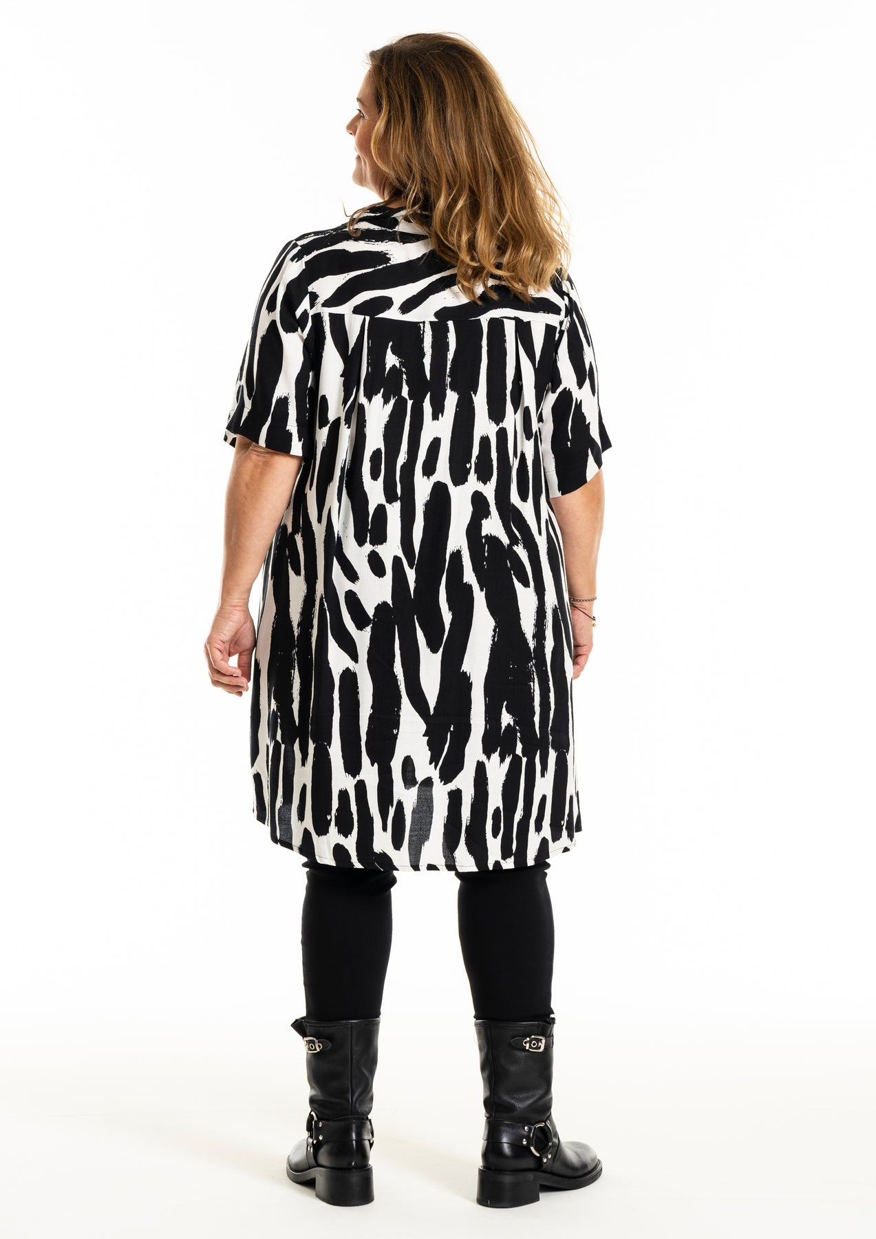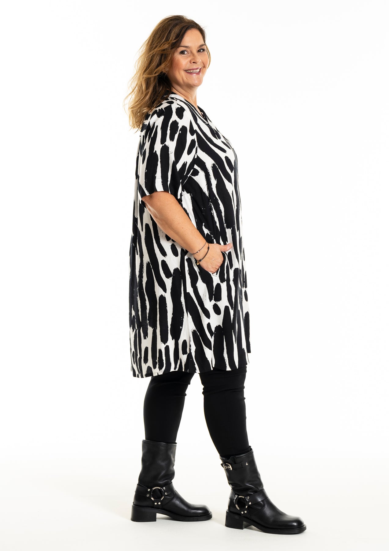 Gozzip - Mette flott og þægileg mynstruð tunika. V-hálsmál og skyrtukragi, stuttar ermar, góðir vasar að framan. Passar vel hvar sem er, bæði hversdags og spari.