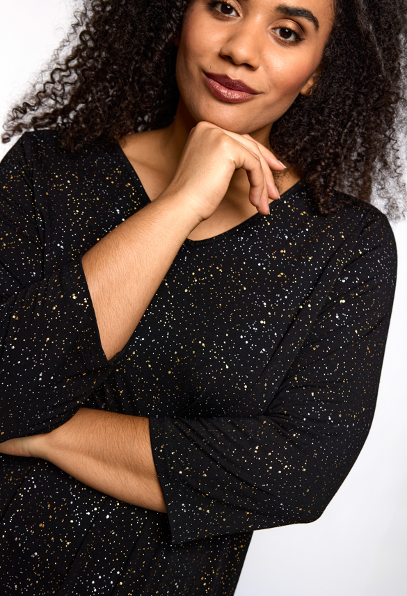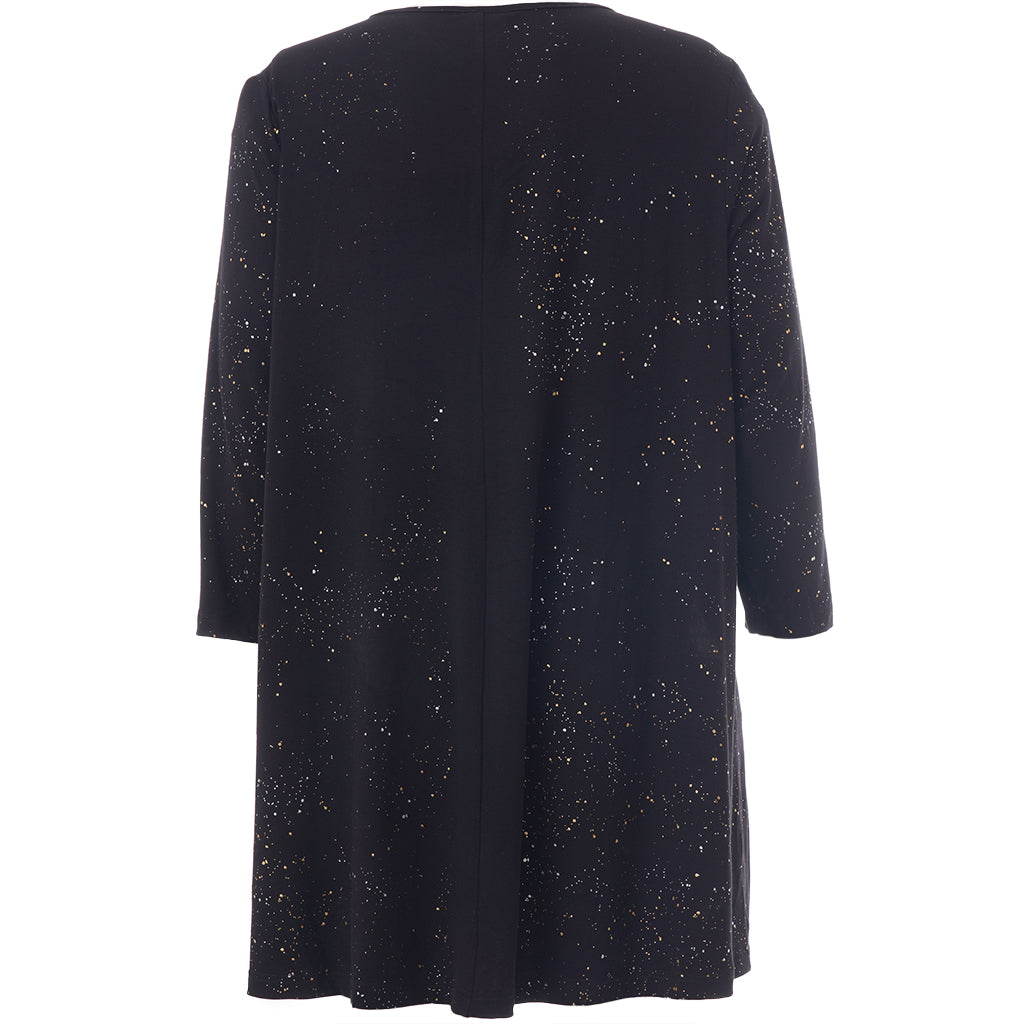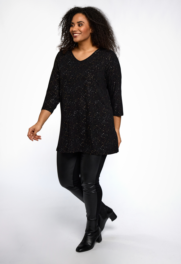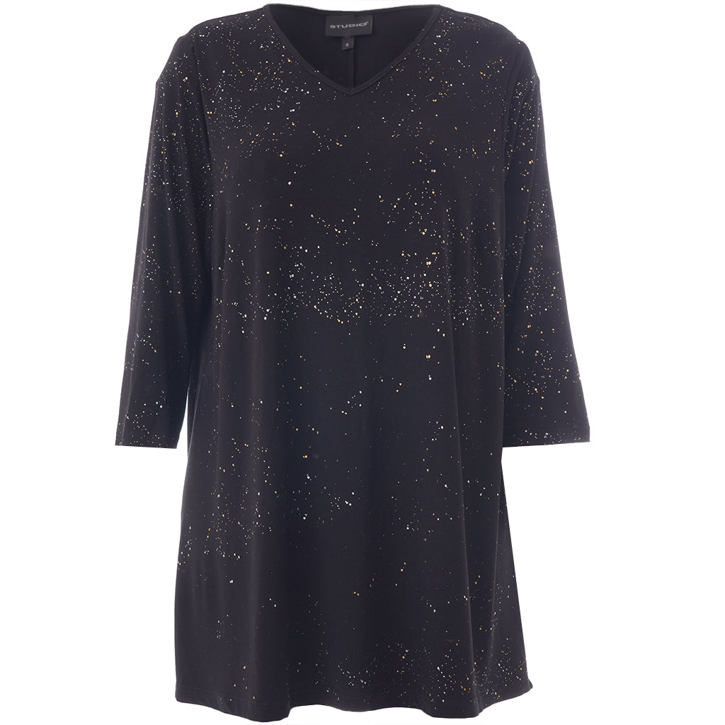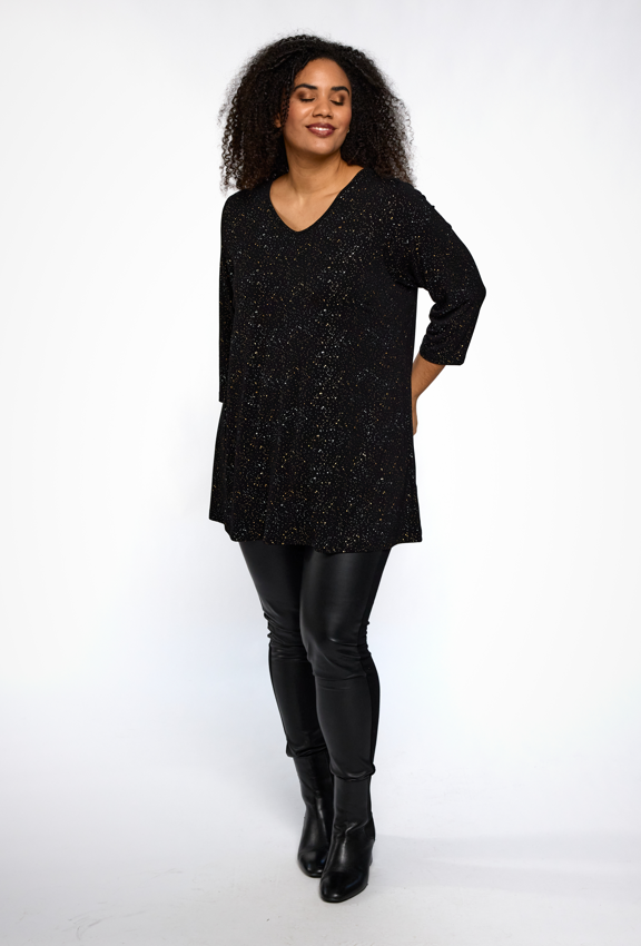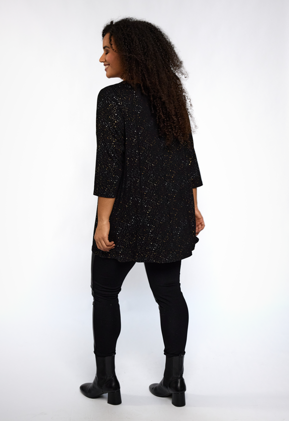 Studio - Ditte falleg og sparileg tunika með gylltu og silfruðu mynstri. V-hálsmál, kvartermar, A-snið. Flott og vönduð tunika sem passar vel hvar sem er. Fullkomin í veislurnar framundan.