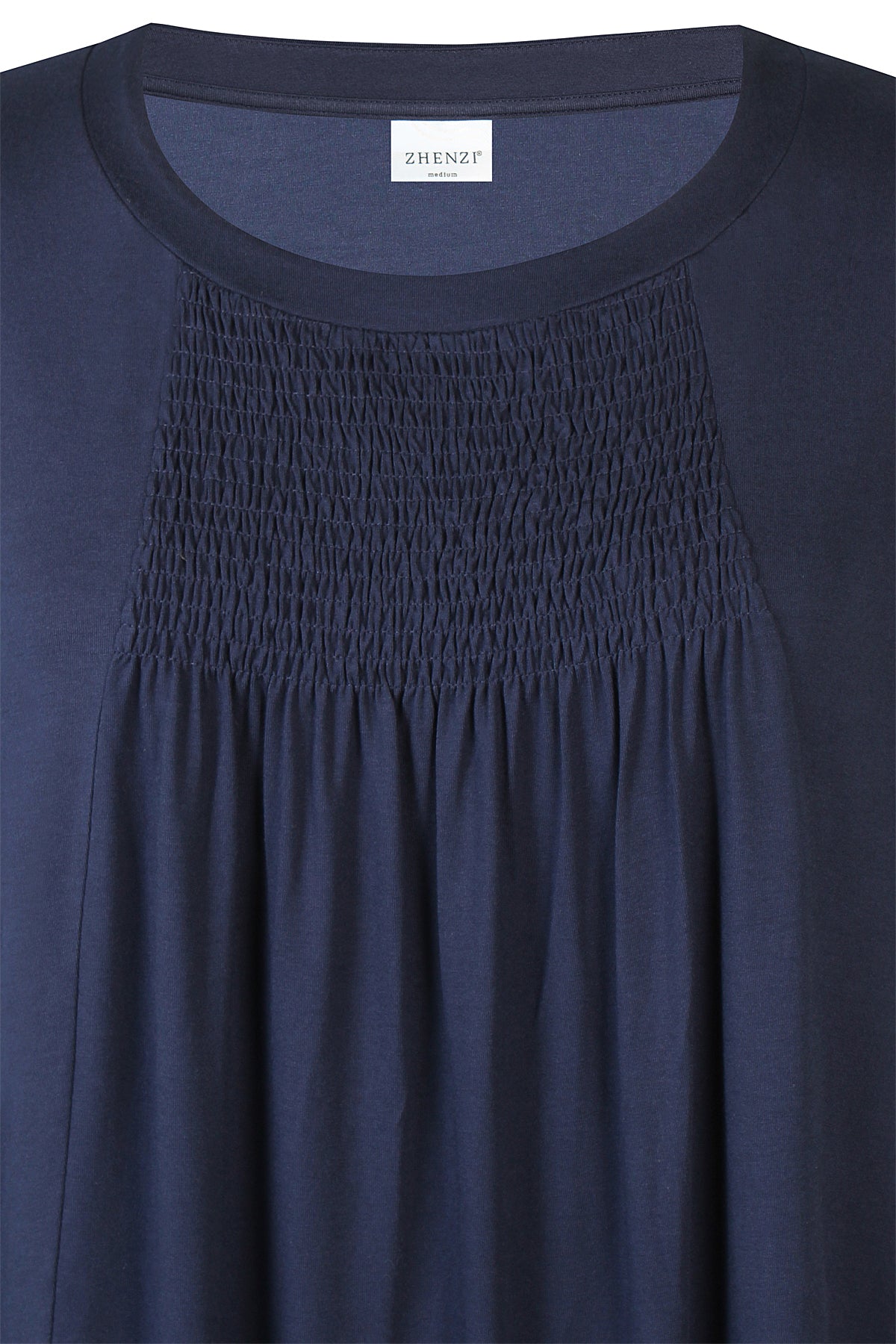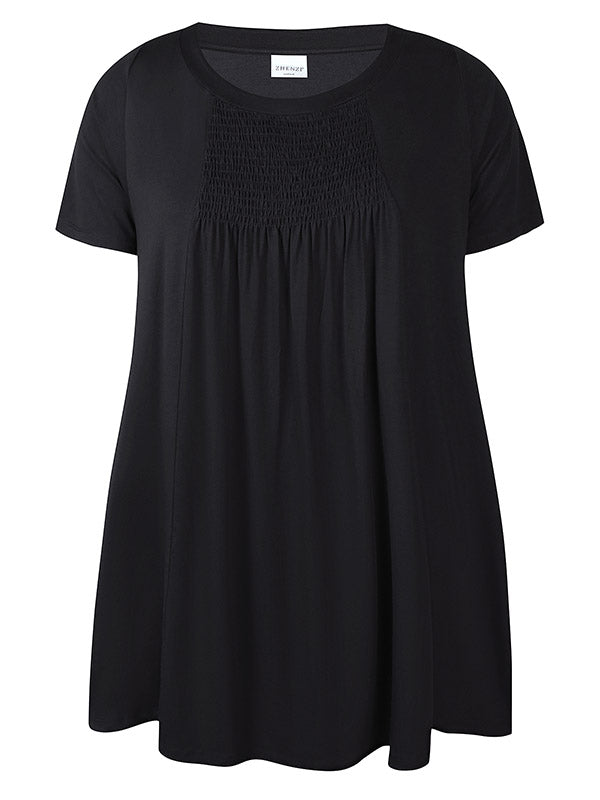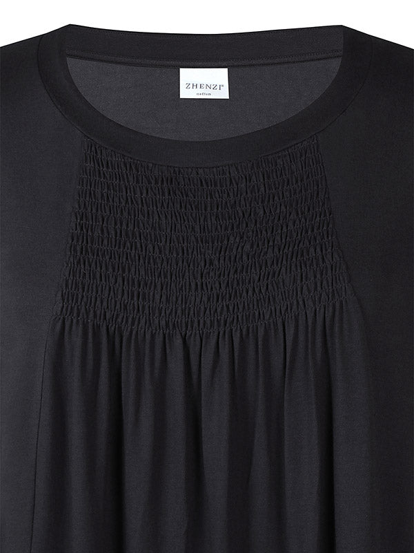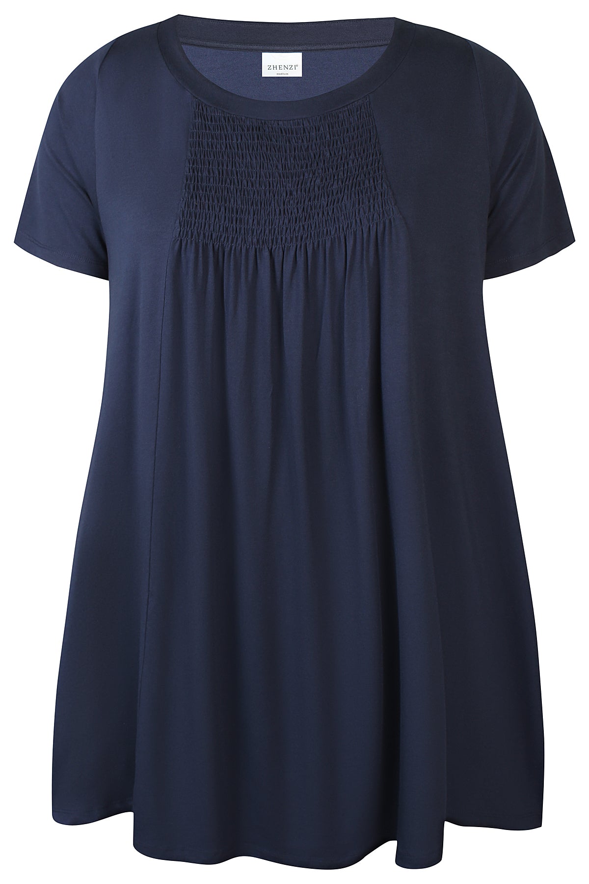 Zhenzi - Livia tunika úr mjúku og þægilegu efni. Rúnað hálsmál, stuttar ermar, A-snið, góðir vasar, saumuð rykking í efni á bringu sem gefur skemmtilegt útlit og auka vídd í bol. Þétt og gott efni sem fellur vel.