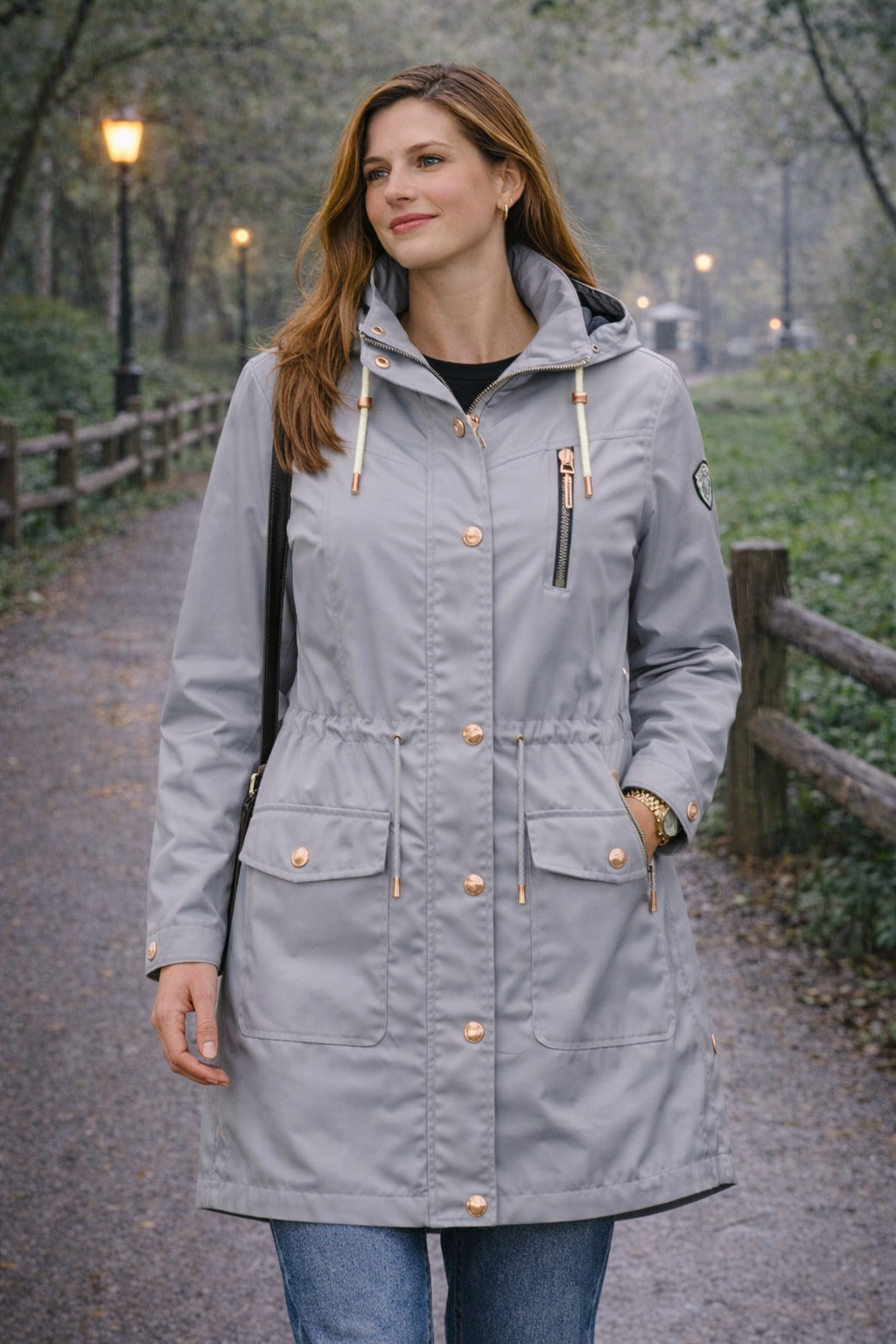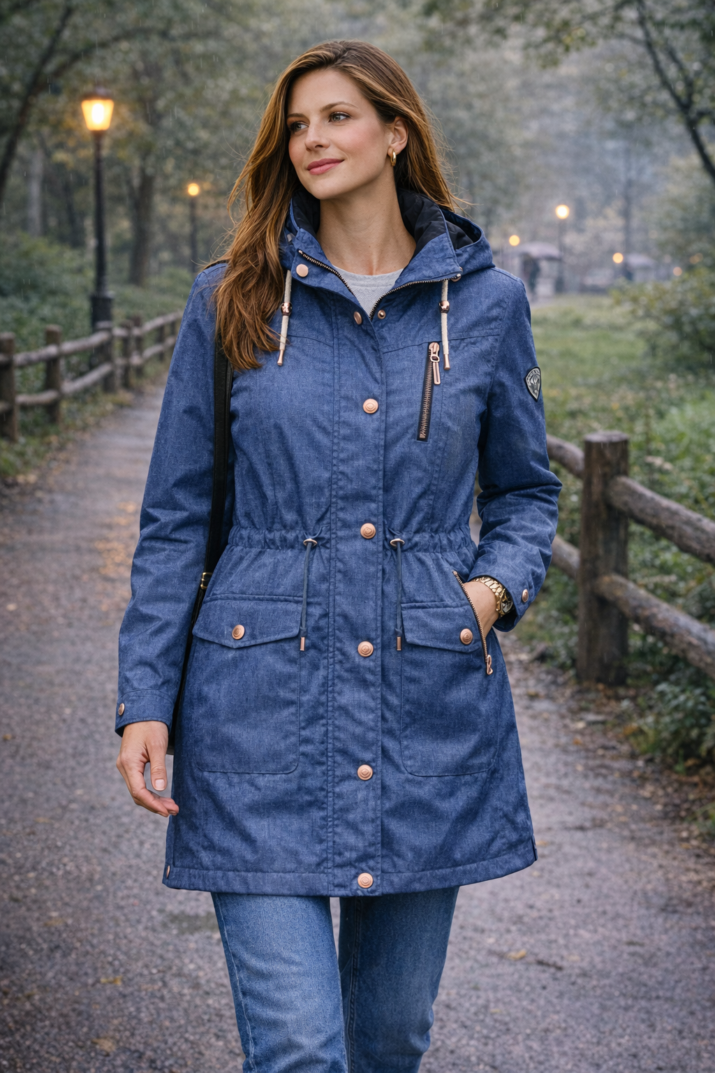 Normann - Útivistar/regnjakki með áfastri hettu með reimum svo hægt sé að þrengja að. Létt vattfyllt vesti rennt í að innan sem gerin hann hlýjan en jafnframt léttan og þægilegan, skelin er vatnsheld og vindheld með öndun. Örlítið síðari að aftan með klauf og reimum svo hægt sé að þrengja að. Góðir lokaðir vasar ásamt renndum brjóstvasa að framan . Tvöfaldur rennilás með hnepptum borða yfir ásamt. Teygjuband í mitti að innan svo hægt sé að stilla mitti.
