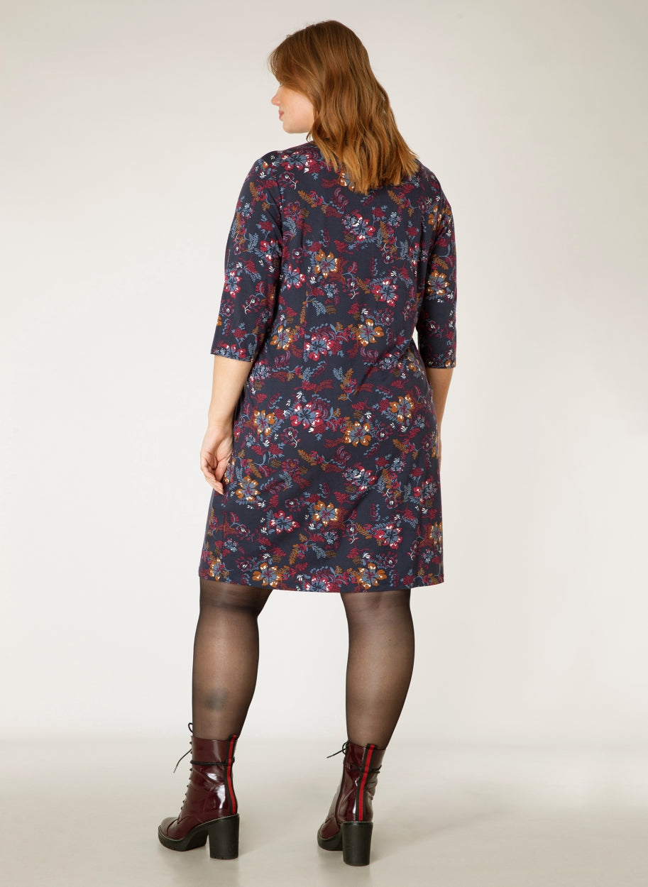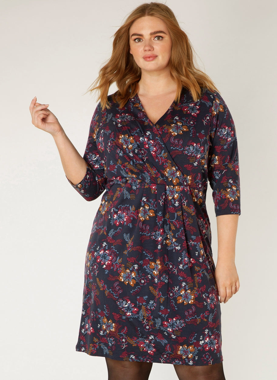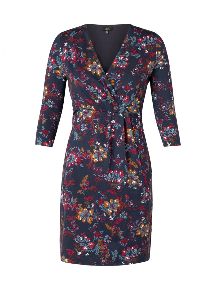 YestA - Bloeme flottur kjóll með kvartermum, "wrap over" efri partur og V-hálsmál. Passar vel bæði hversdags og spari. Dökkblár í grunninn með fallegu blómamynstri.