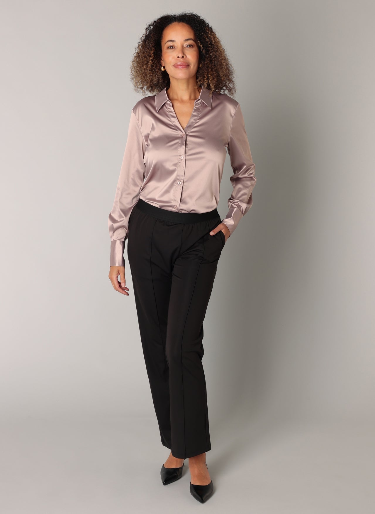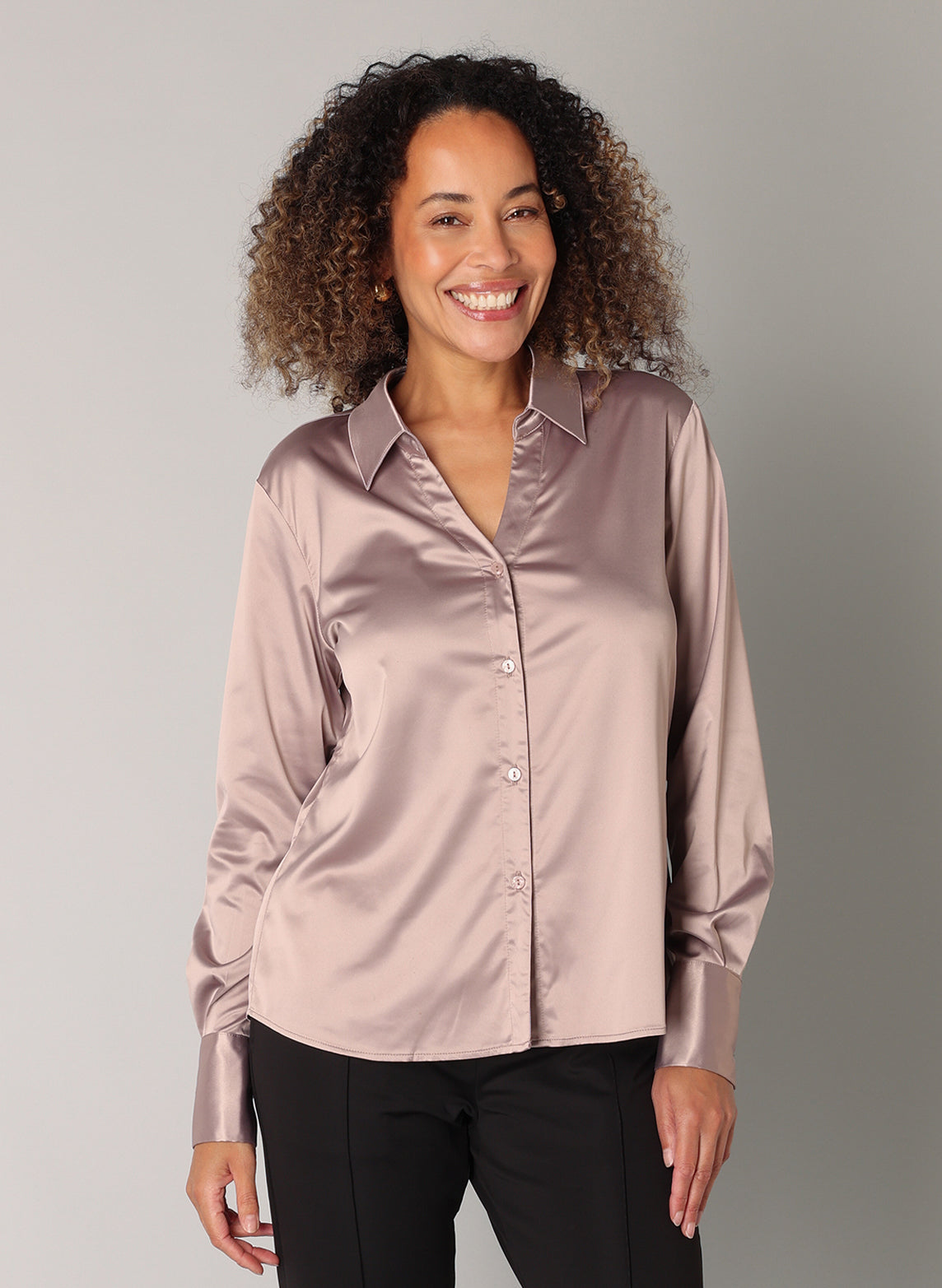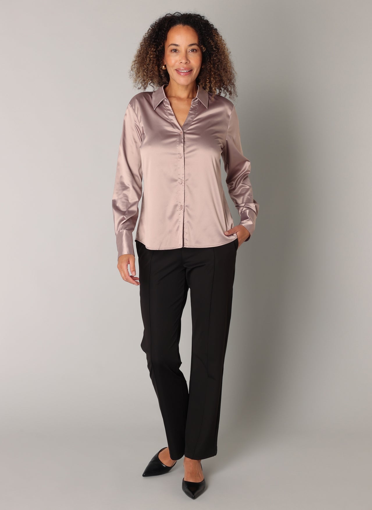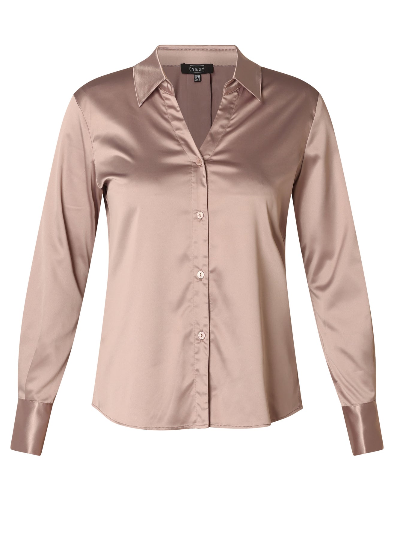 ES&SY - Ayliz smart og falleg satín skyrta. Hneppt að framan, langar ermar, V-hálsmál, skyrtukragi, tölur á ermum. Falleg skyrta sem passar vel með buxum eða pilsi hvort sem það er hversdags eða spari.