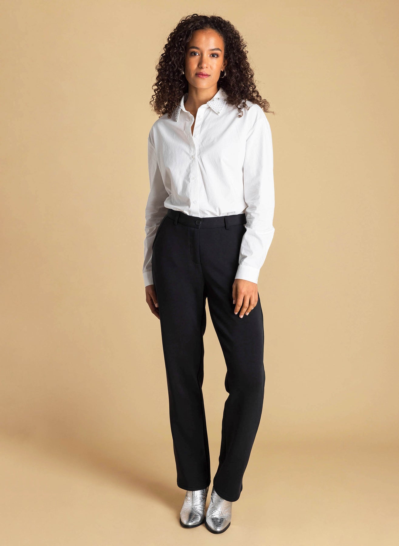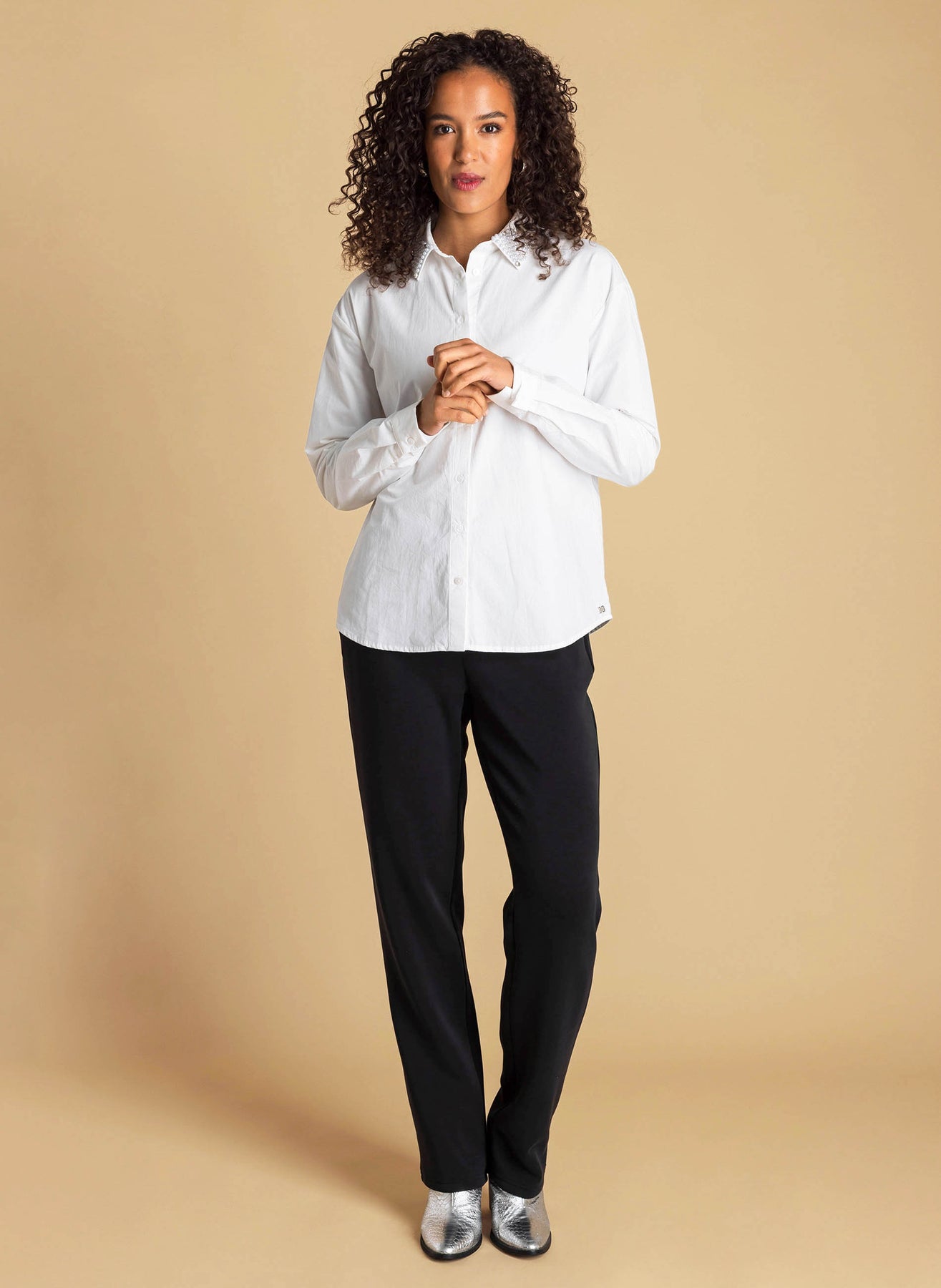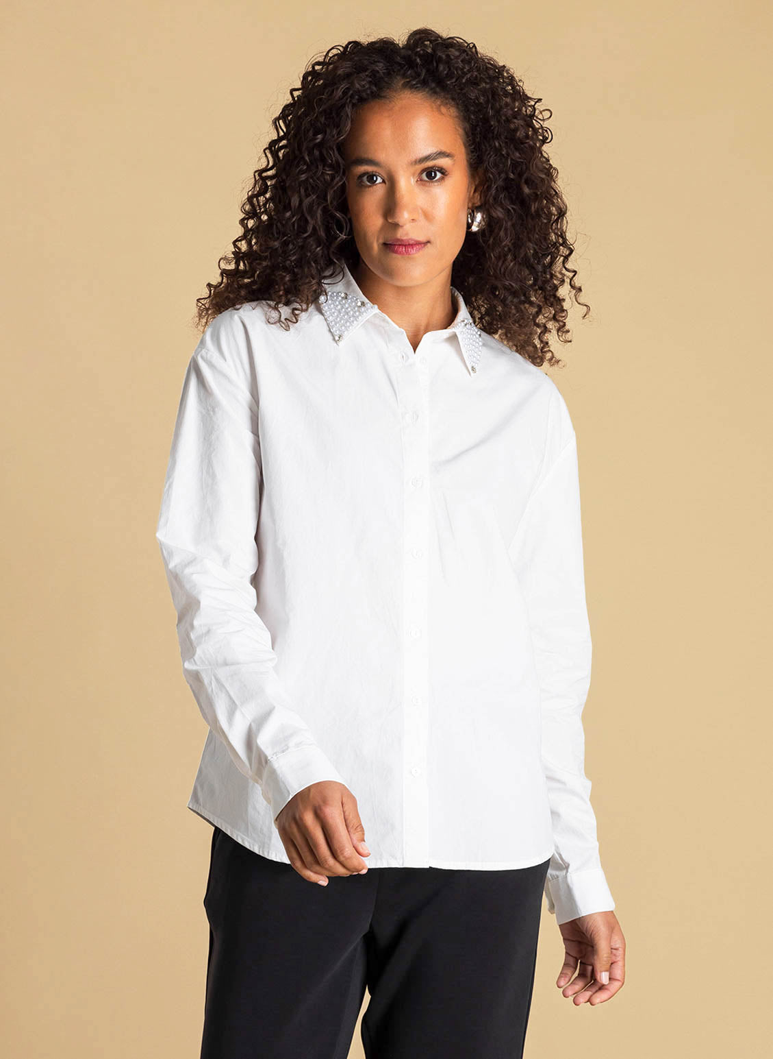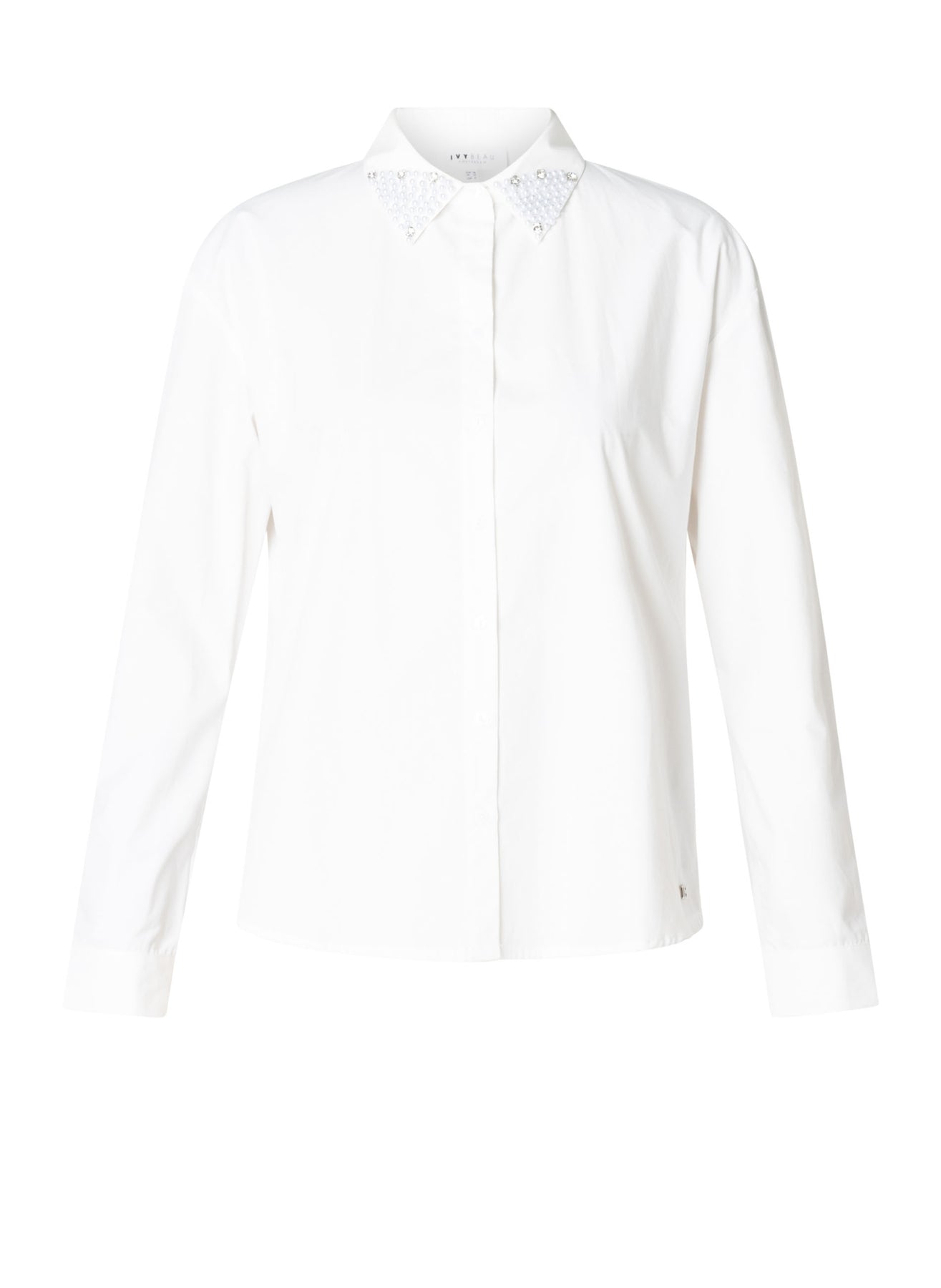 Ivy Beau - Aimee flott og sparileg skyrta með perluskrauti á kraganum. Hneppt að framan, langar ermar, rúnuð að neðan. Passar vel við gallabuxur og treggings, einnig hægt að nota aðeins meira fínt líka, með bara hverju sem er.