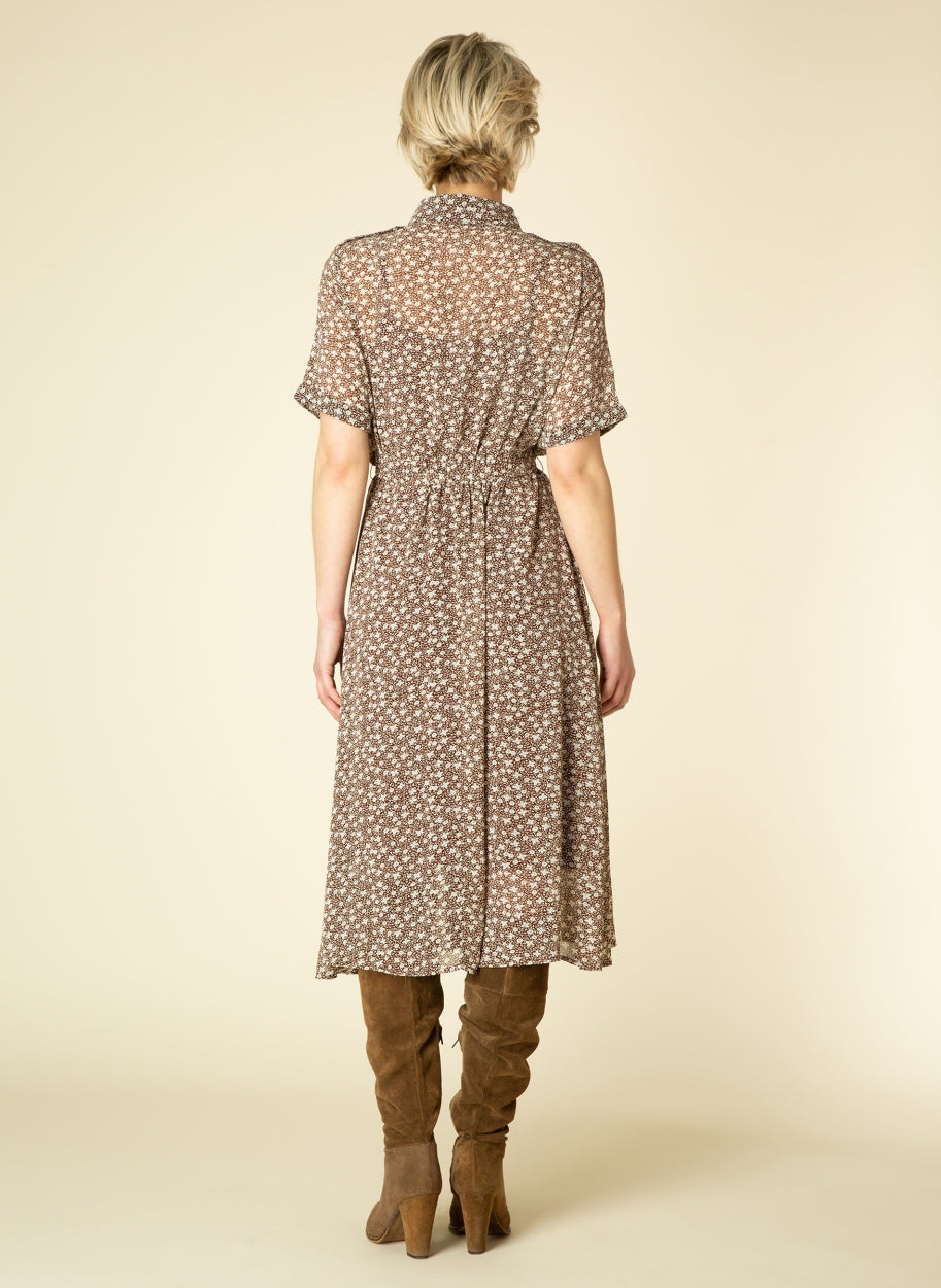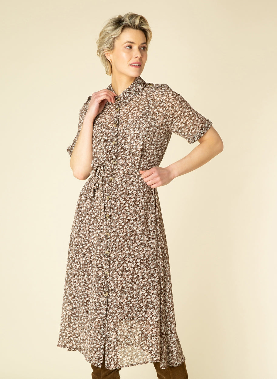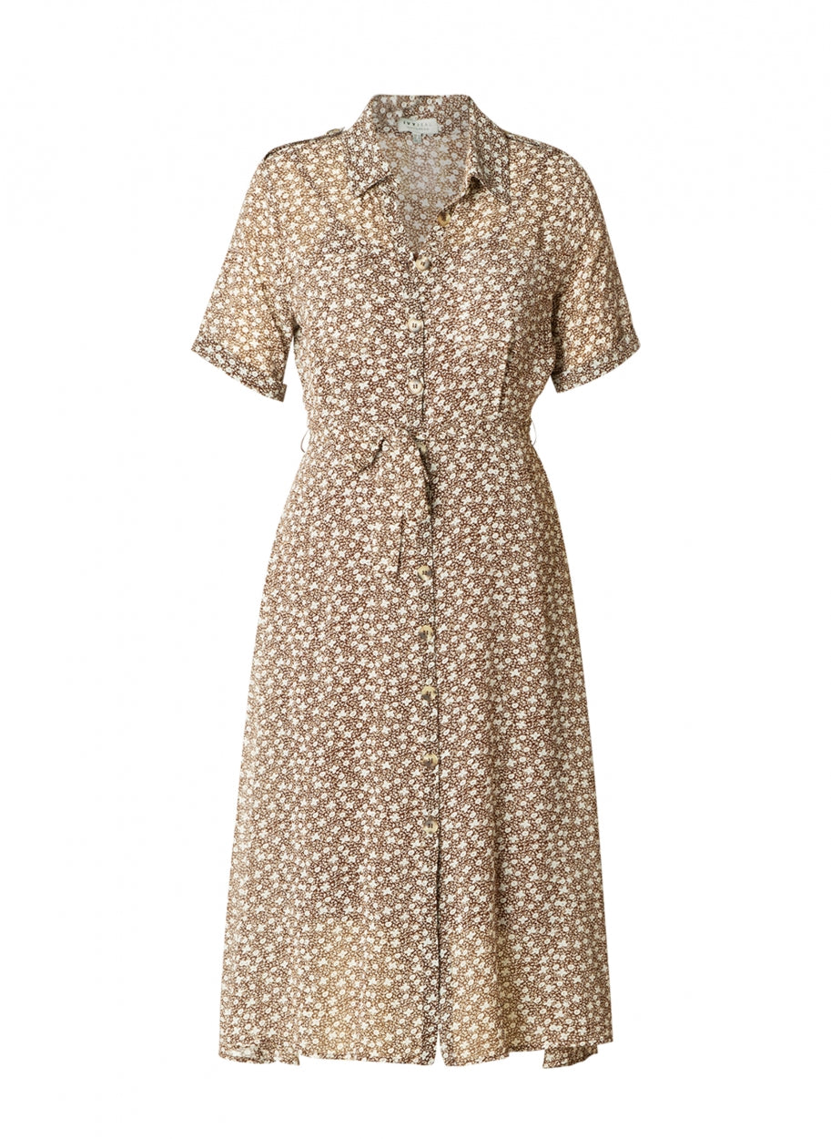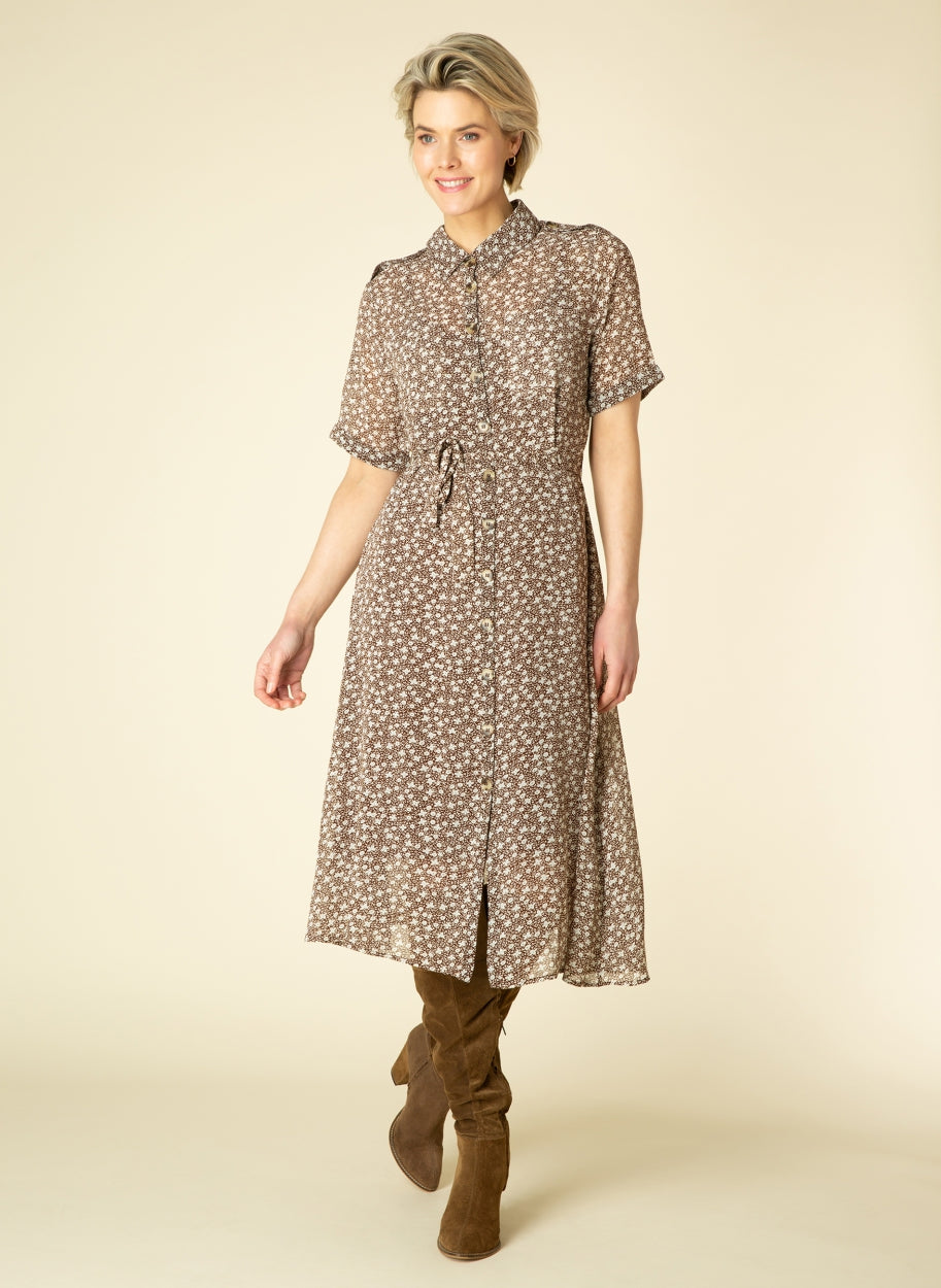 Ivy Beau - Brittany mynstraður kjóll. Skyrtukragi, stuttar ermar, hnepptur alla leið niður, tekinn saman í mittið með bandi að framan. Hægt að nota hann opinn yfir topp og flottar gallabuxur eða lokaðan.