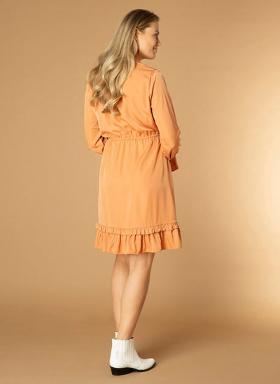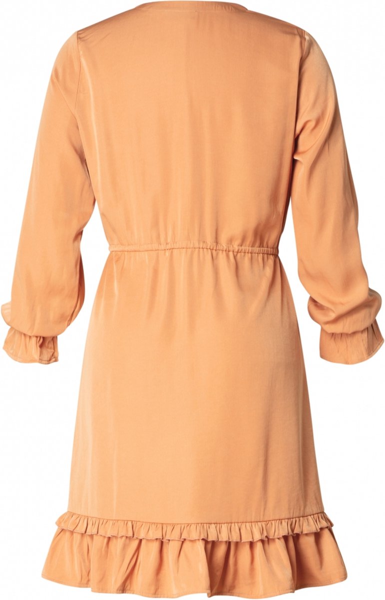 Sætur og þægilegur kjóll með V-hálsmáli og löngum ermum, hnepptur hálfa leið niður að framan og tekin saman í mitti með bandi. Smá pífa neðst á faldi gefur skemmtilega hreyfingu.  Þessi kjóll er tilvalinn til að nota við hvort sem er hæla eða sandala.