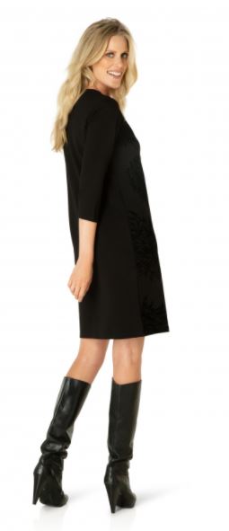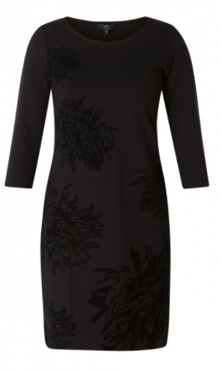 Hnésíður kjóll með fínlegu blómamynstri með fleuelsáferð, kvartermar og rúnað hálsmál.
