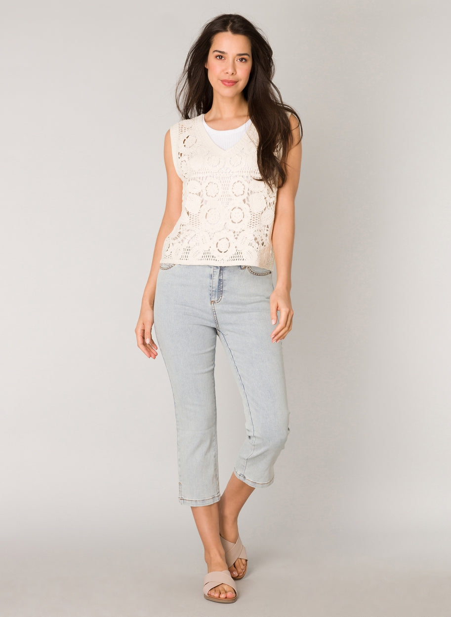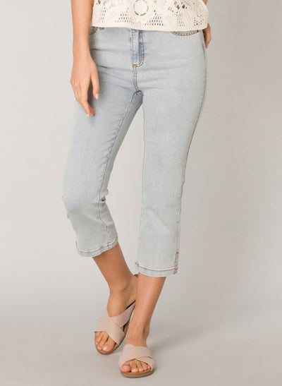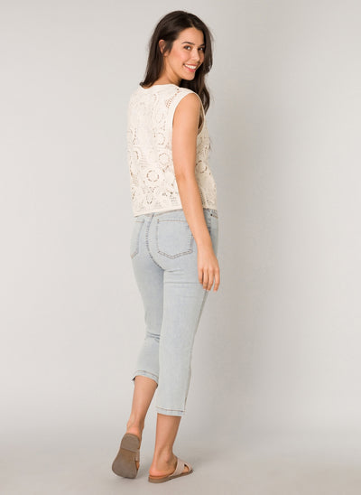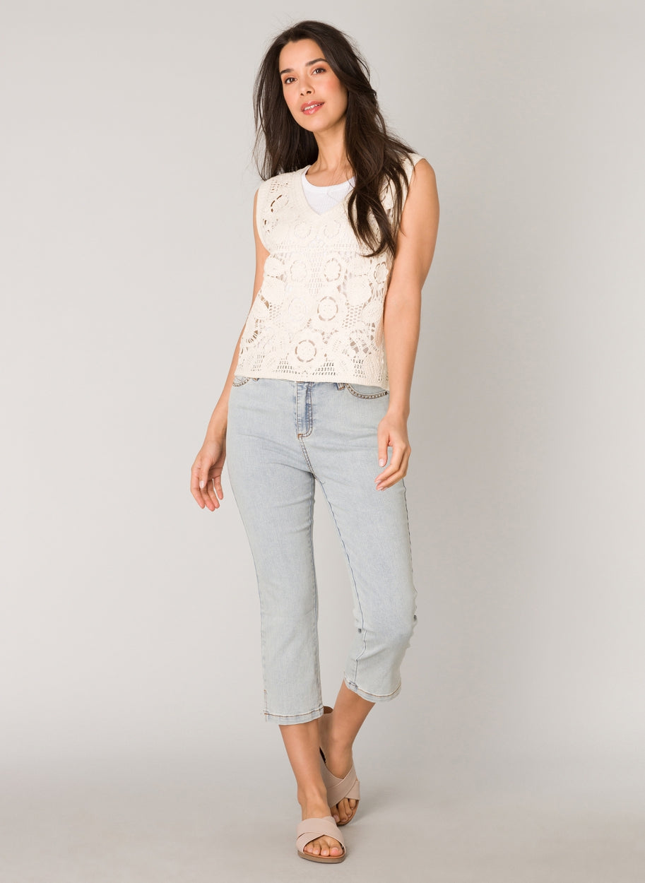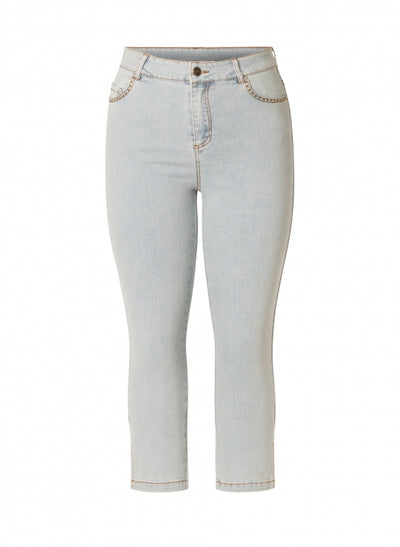 Yest Milena hálfsíðar gallabuxur eru mjúkar og liprar gallabuxur sem ná hátt upp og sitja vel, með tölu og rennilás að framan, fimm vasa snið og vasarnir að framan eru með skrauti, klauf neðst á skálmum.