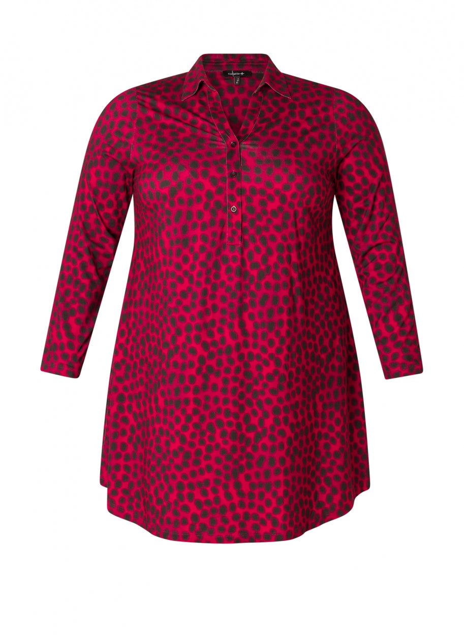 Colletta by YestA, langerma skyrtutukjóll, rauður í grunninn með svörtum óreglulegum doppum, skyrtukragi og V-hálsmál með þremur tölum.