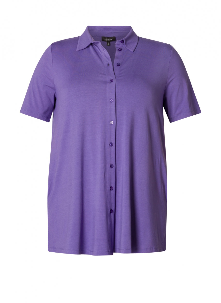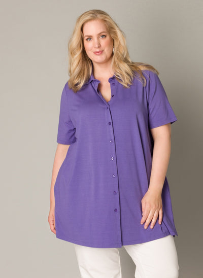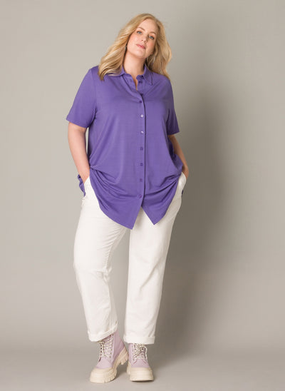 Coletta - Viola síð skyrta með stuttum ermum, hefðbundnum skyrtukraga, hneppt niður að framan og rúnuð að neðan. Passar vel við allar buxur eða pils.
