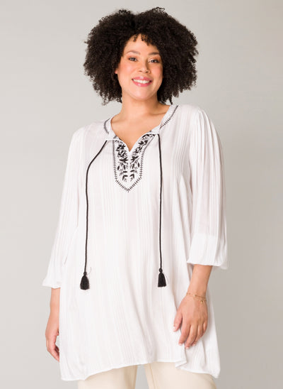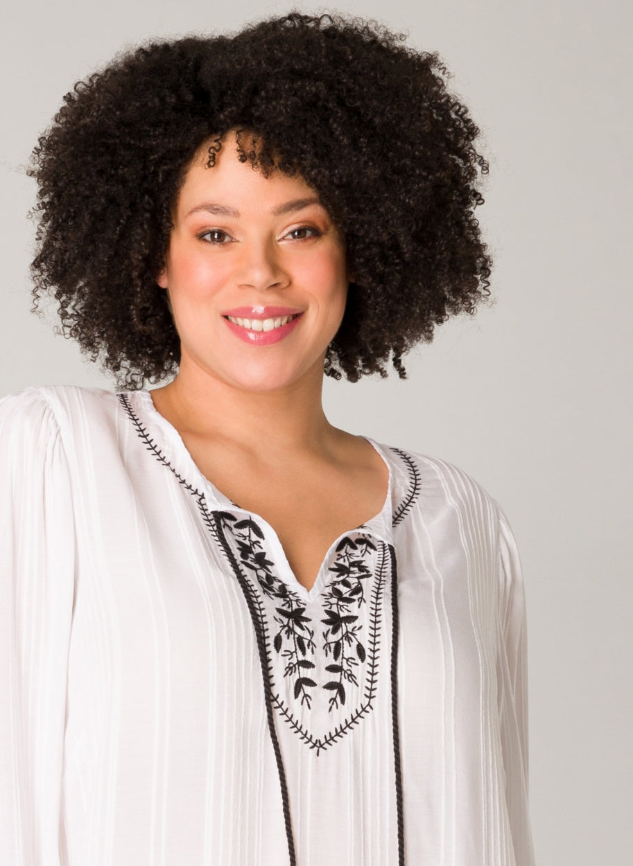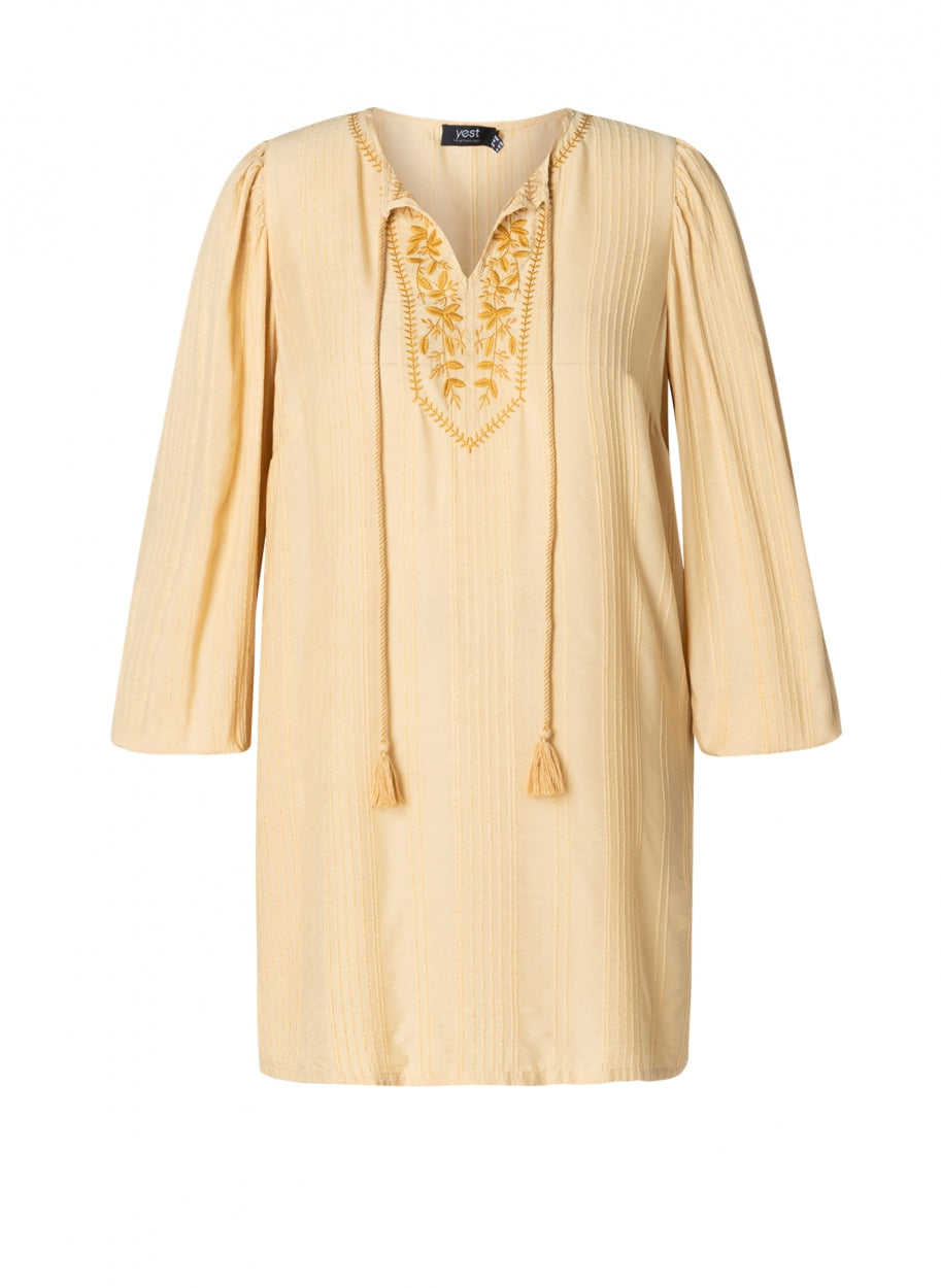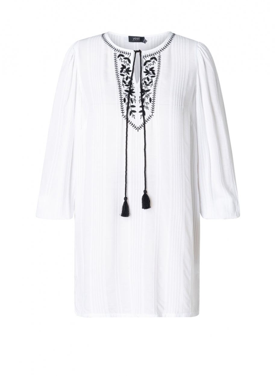 YestA - Jelka létt og þægileg tunika með fallegum útsaum að framan og í hálsmáli. Snúið band gefur kost á að hafa hálsmálið opið eða meira lokað. Síðar ermar með teygju að neðan.