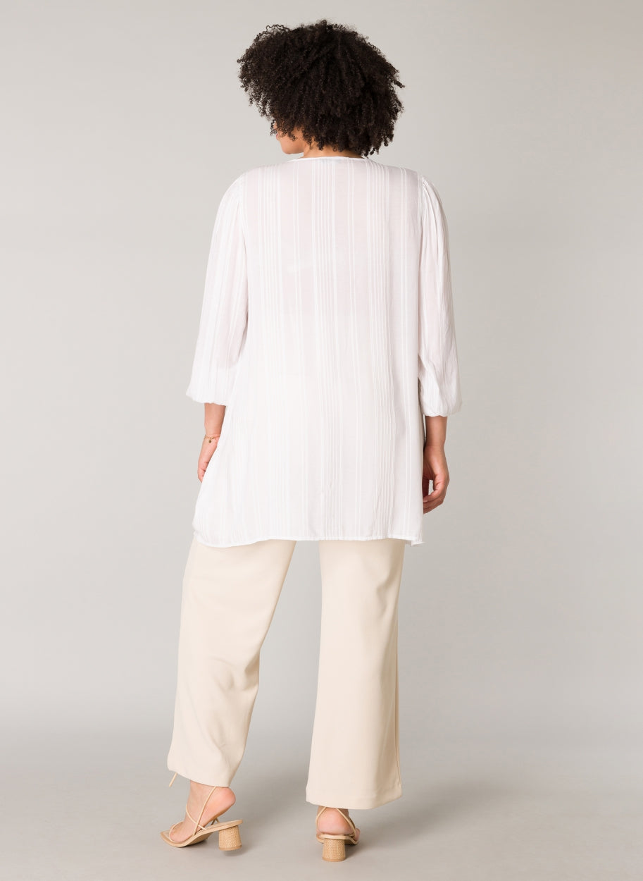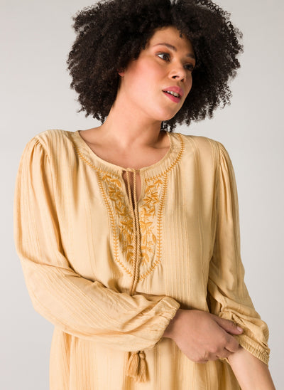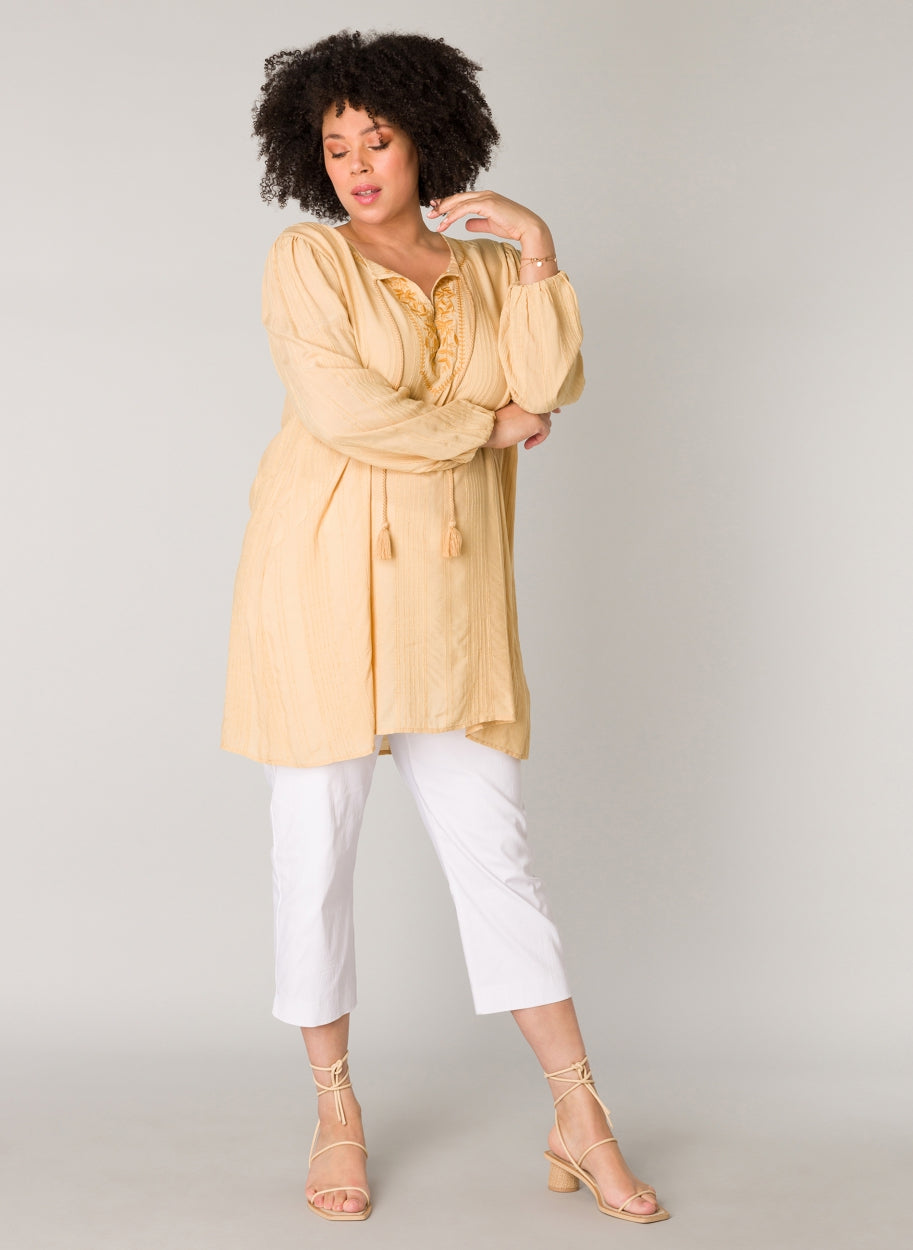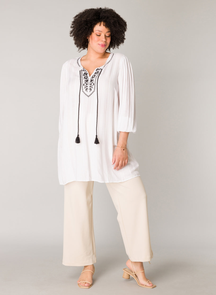 YestA - Jelka létt og þægileg tunika með fallegum útsaum að framan og í hálsmáli. Snúið band gefur kost á að hafa hálsmálið opið eða meira lokað. Síðar ermar með teygju að neðan.