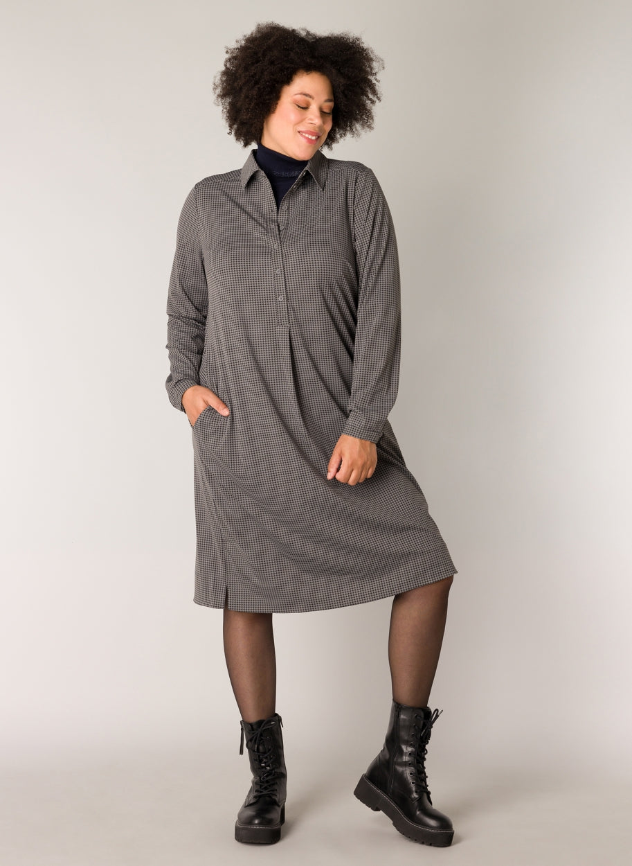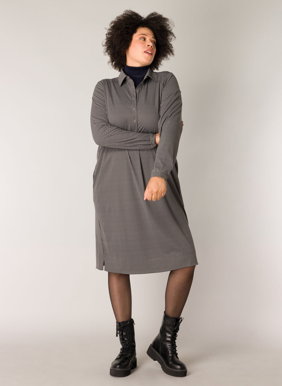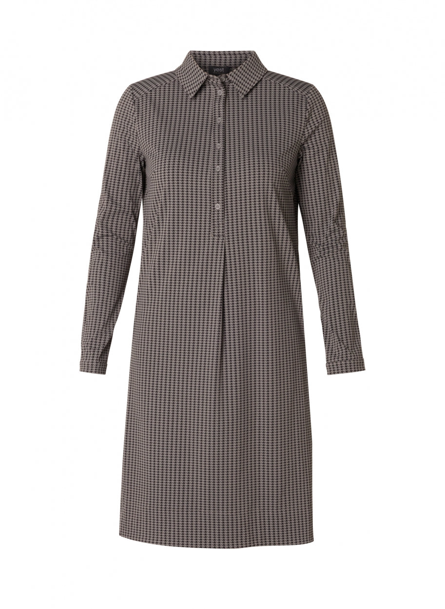 YestA, Rahaf hálfsíður síðerma kjóll með mynstri, kraga og tölum niður bringu og neðst á ermum. Þétt lipurt efni með miklri teygju sem fellur vel.