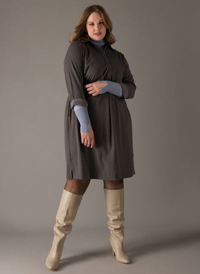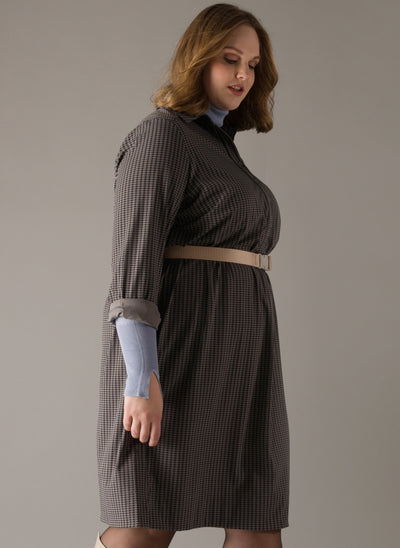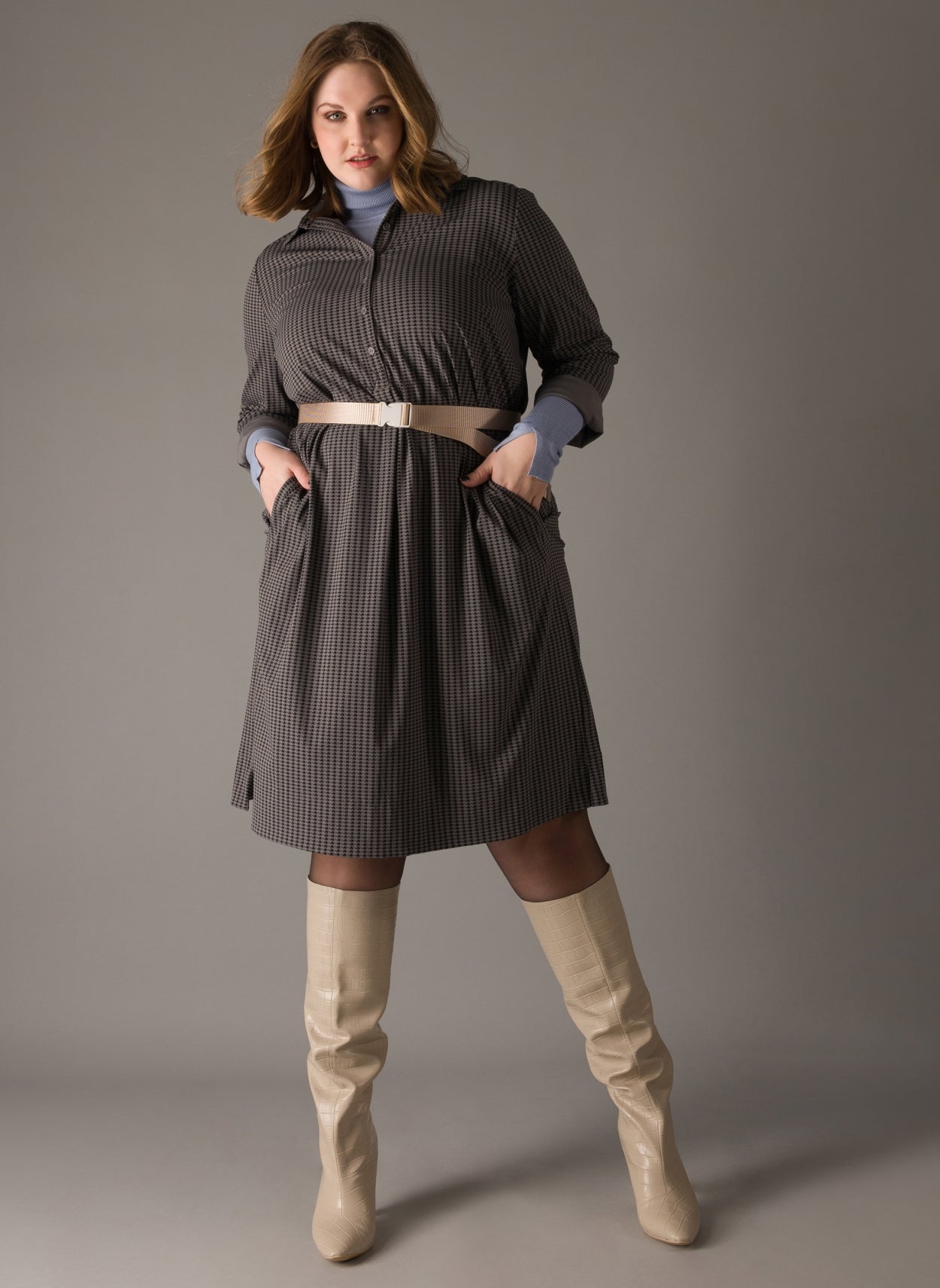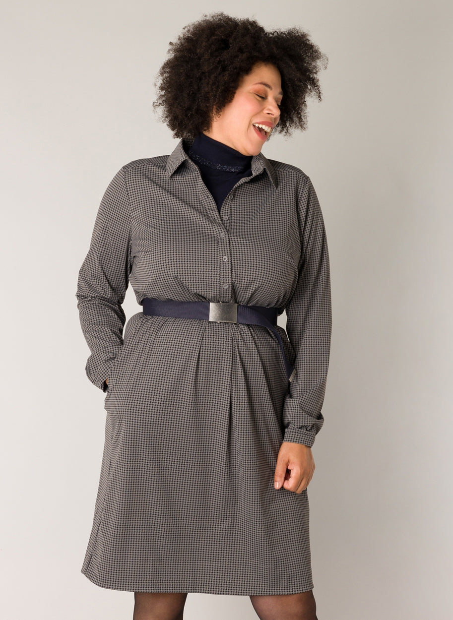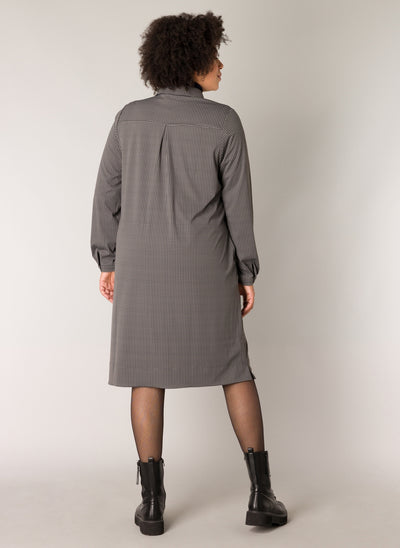 YestA, Rahaf hálfsíður síðerma kjóll með mynstri, kraga og tölum niður bringu og neðst á ermum. Þétt lipurt efni með miklri teygju sem fellur vel.