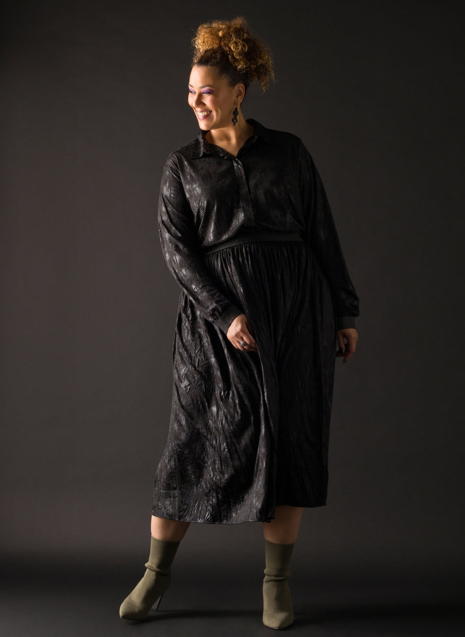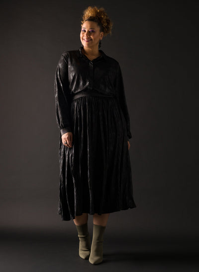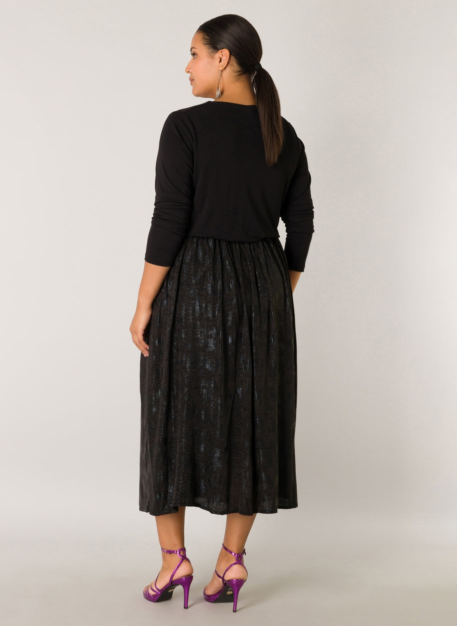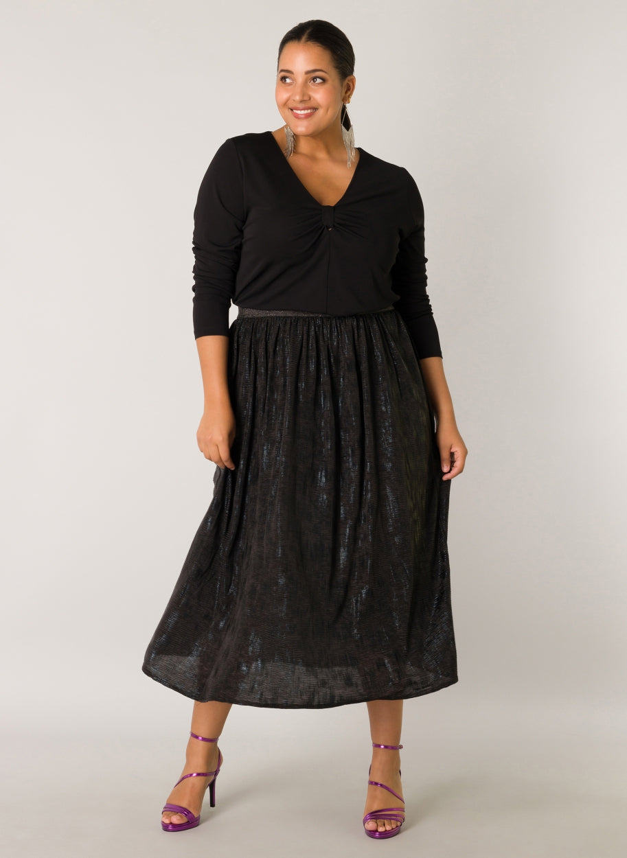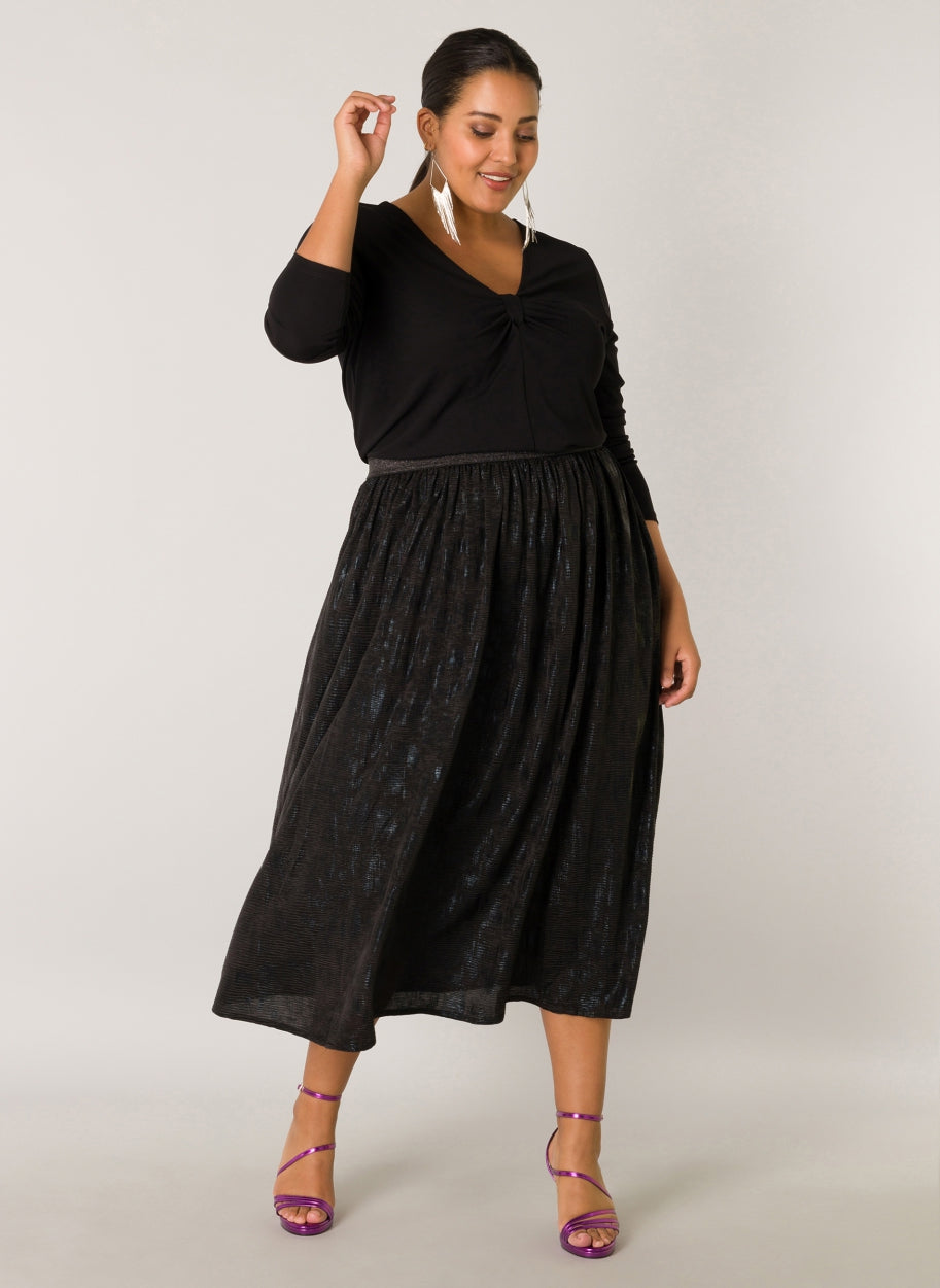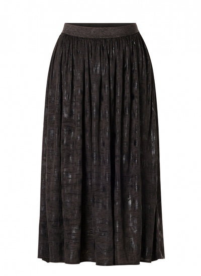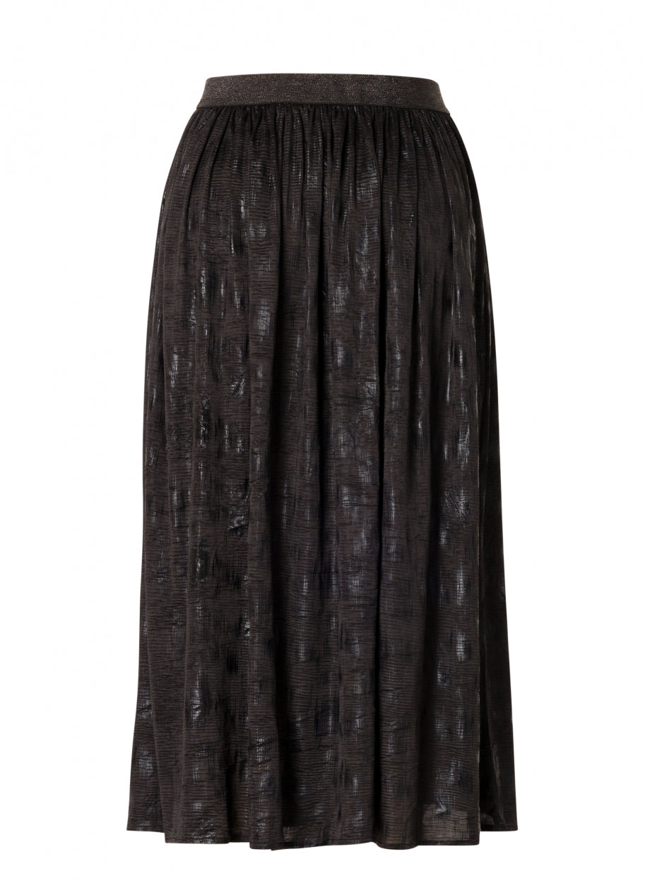 YestA - Whitney sparilegt pils með góðri, breiðri glimmer teygju í mitti. Áferð efnis grípur ljósið með fallegum gljáa í mynstri sem gerir það að kraftmiklu stykki fyrir bæði dag og nótt.