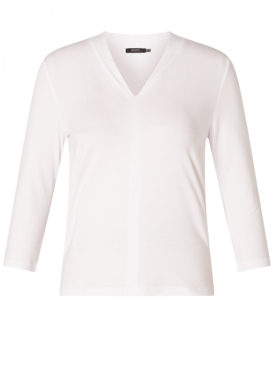 YestA - Ylva léttur og þægilegur kvartermabolur, V-hálsmál með mjóum kraga sem endar í saum niður miðjuna.