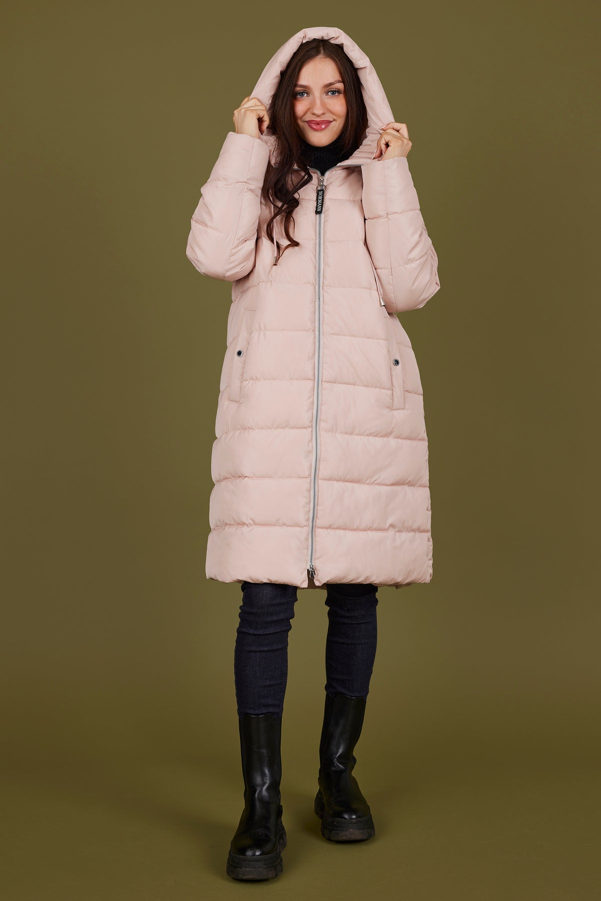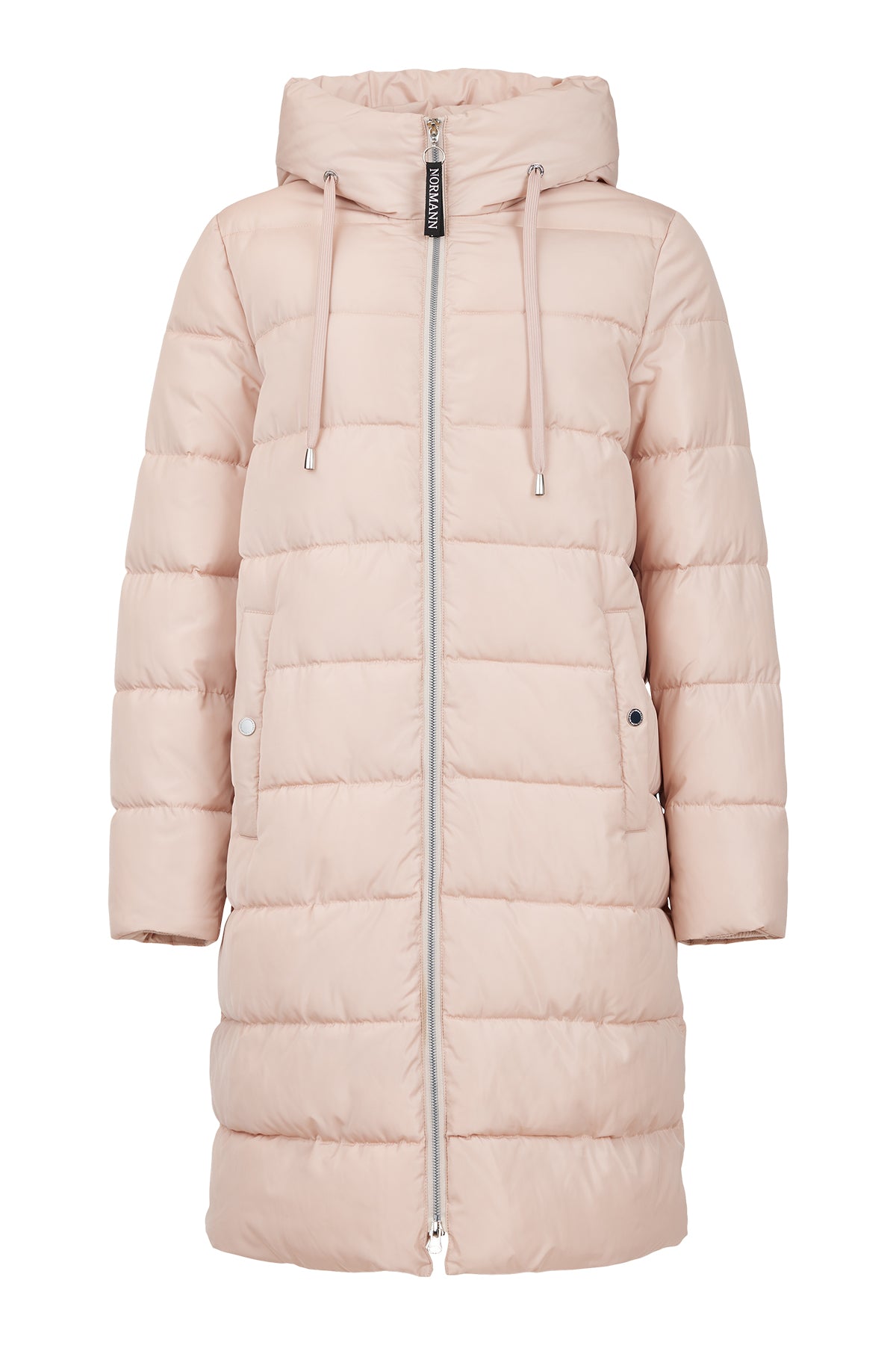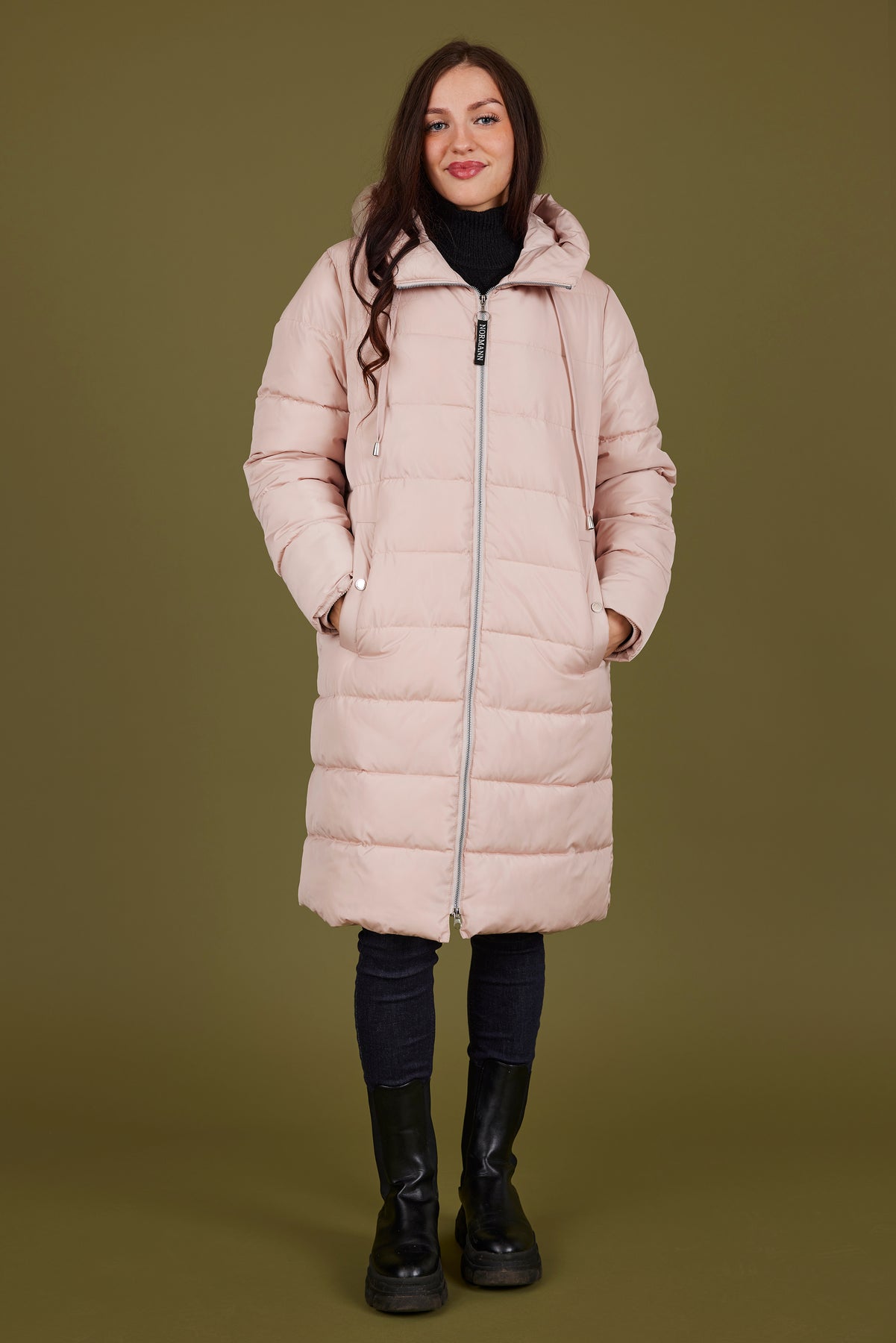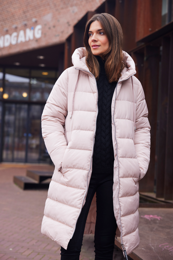 Normann - Amiya síð úlpa með technical down fyllingu sem er eins konar dún-líki, gervidúnn sem hefur sömu eiginleika og alvöru dúnn. Vatnsfráhrindandi efni, gott snið, rennilás í báðar áttir að framan, góðir hliðarvasar með smellu, hár kragi, áföst hetta með böndum til að draga saman. Góð fyrir veturinn.