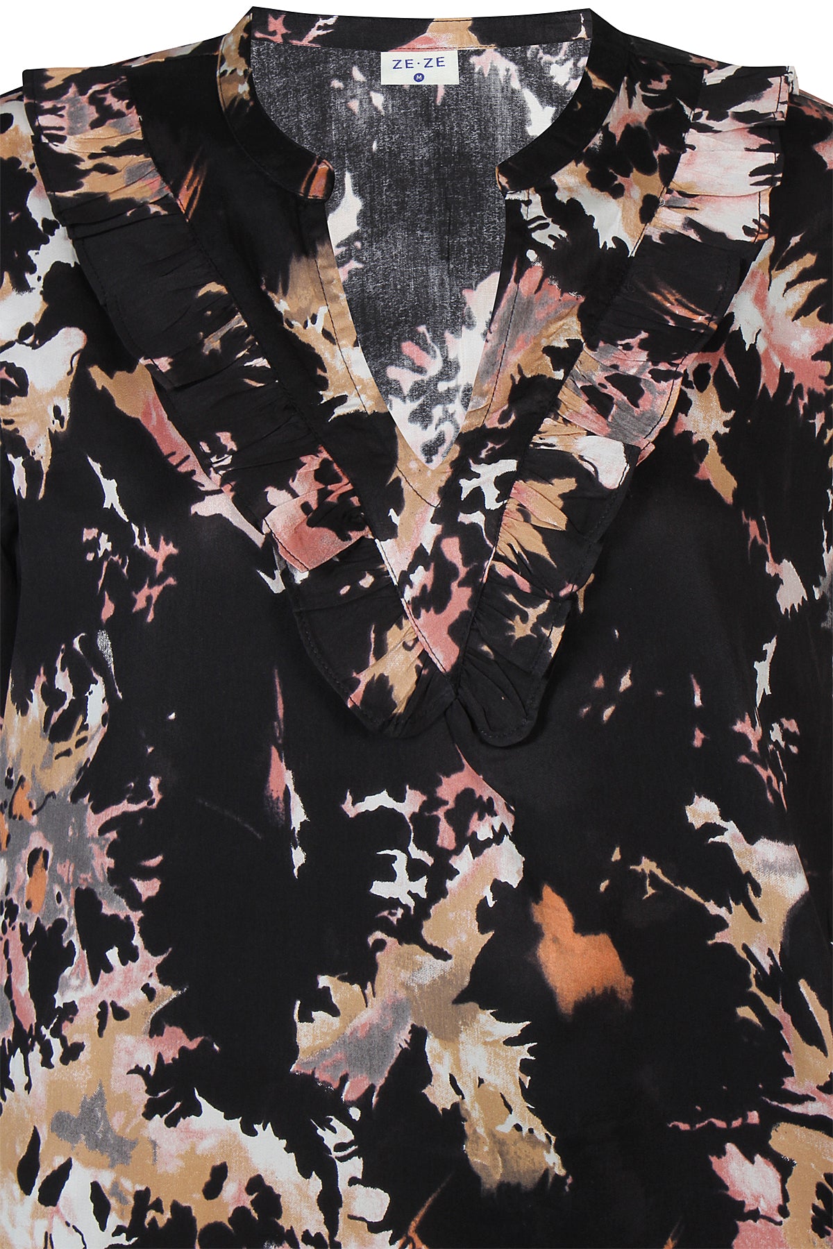 Ze-Ze - Angela sætur og sparilegur kjóll með fallegu mynstri. Langar ermar með teygjustroffi, rúnað hálsmál sem endar í V-hálsmáli, pífukantur meðfram hálsmáli. Passar vel hvar sem er, bæði hversdags og spari.