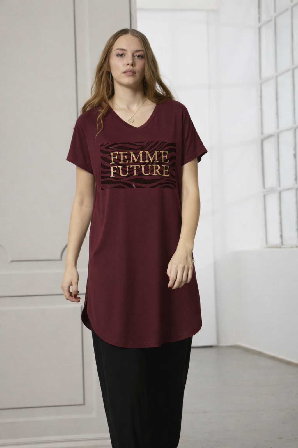 Ze-Ze - Anya mjúkur og notalegur náttkjóll. V-hálsmál, stuttar ermar, rúnaður að neðan, texti að framan "Femme future".